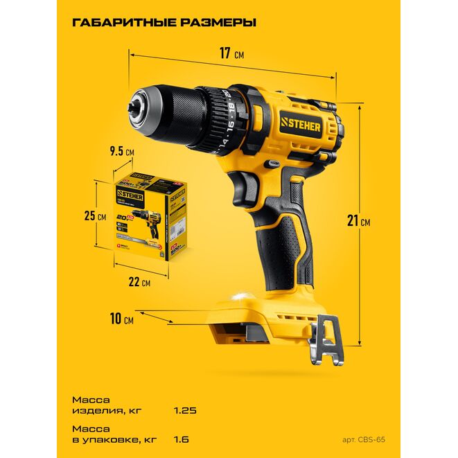 Принадлежности для STEHER 20 В, 65 Н·м, без АКБ (LMS), бесщеточная ударная дрель-шуруповерт (CBS-65):