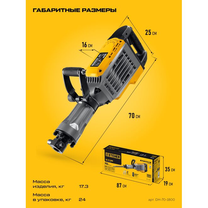 Молоток отбойный STEHER DH-70-1800 предназначен для разрушения конструкций из бетона, железобетона, кирпича и камня, долбления асфальтовых, бетонных и плиточных покрытий, уплотненного грунта и других строительных работ.Характеристики STEHER DH-70-1800: