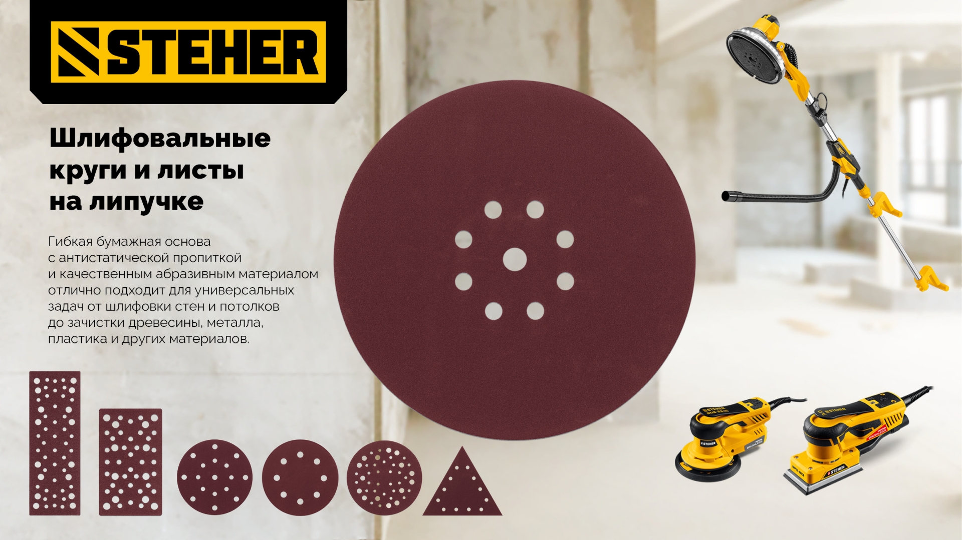 Круги шлифовальные на липучке STEHER 35685-120, применяются на орбитальных шлифовальных машинках и электрических дрелях с опорной тарелкой для обработки дерева, металла, пластика и других материалов. Неоспоримыми преимуществами шлифовальных кругов является высокая производительность, длительный ресурс, возможность быстрого пылеудаления и универсальность применения при обработке металла, древесины и пластика.