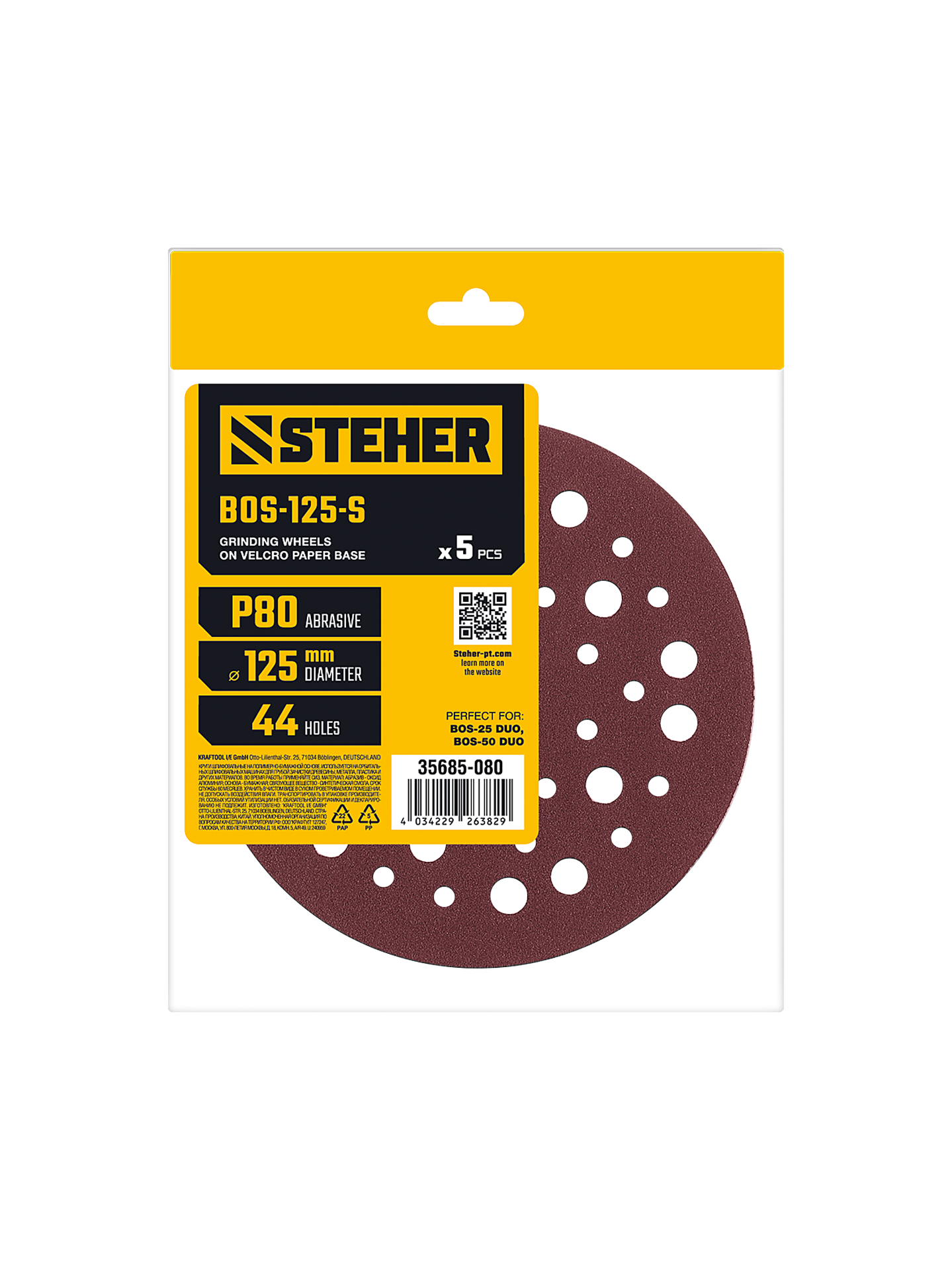 STEHER BOS-125-S 125 мм, Р80, шлифовальный круг на липучке, 44 отв., 5 шт. (35685-080)