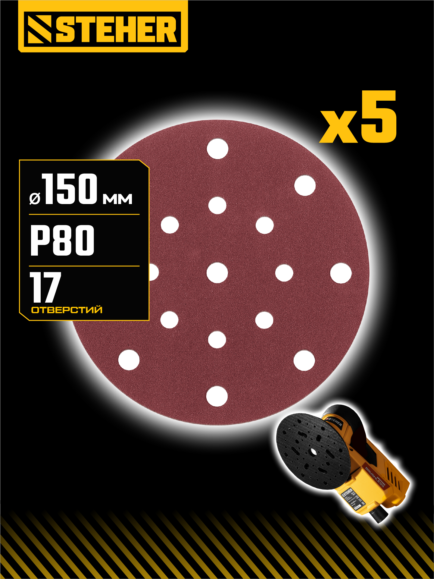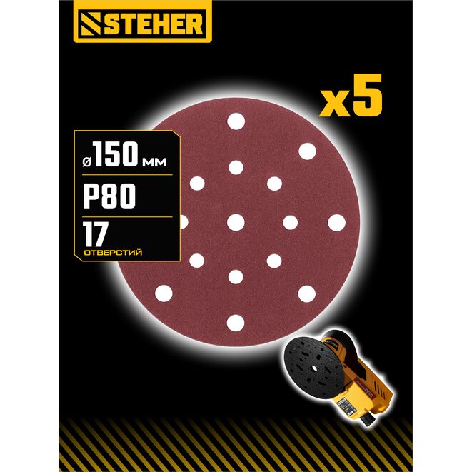 STEHER BOS-150-S 150 мм, Р80, шлифовальный круг на липучке, 17 отв., 5 шт. (35684-080)