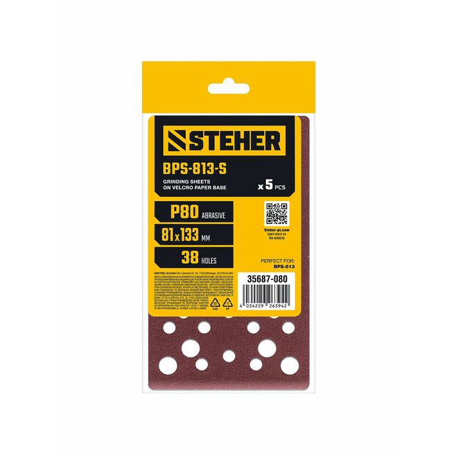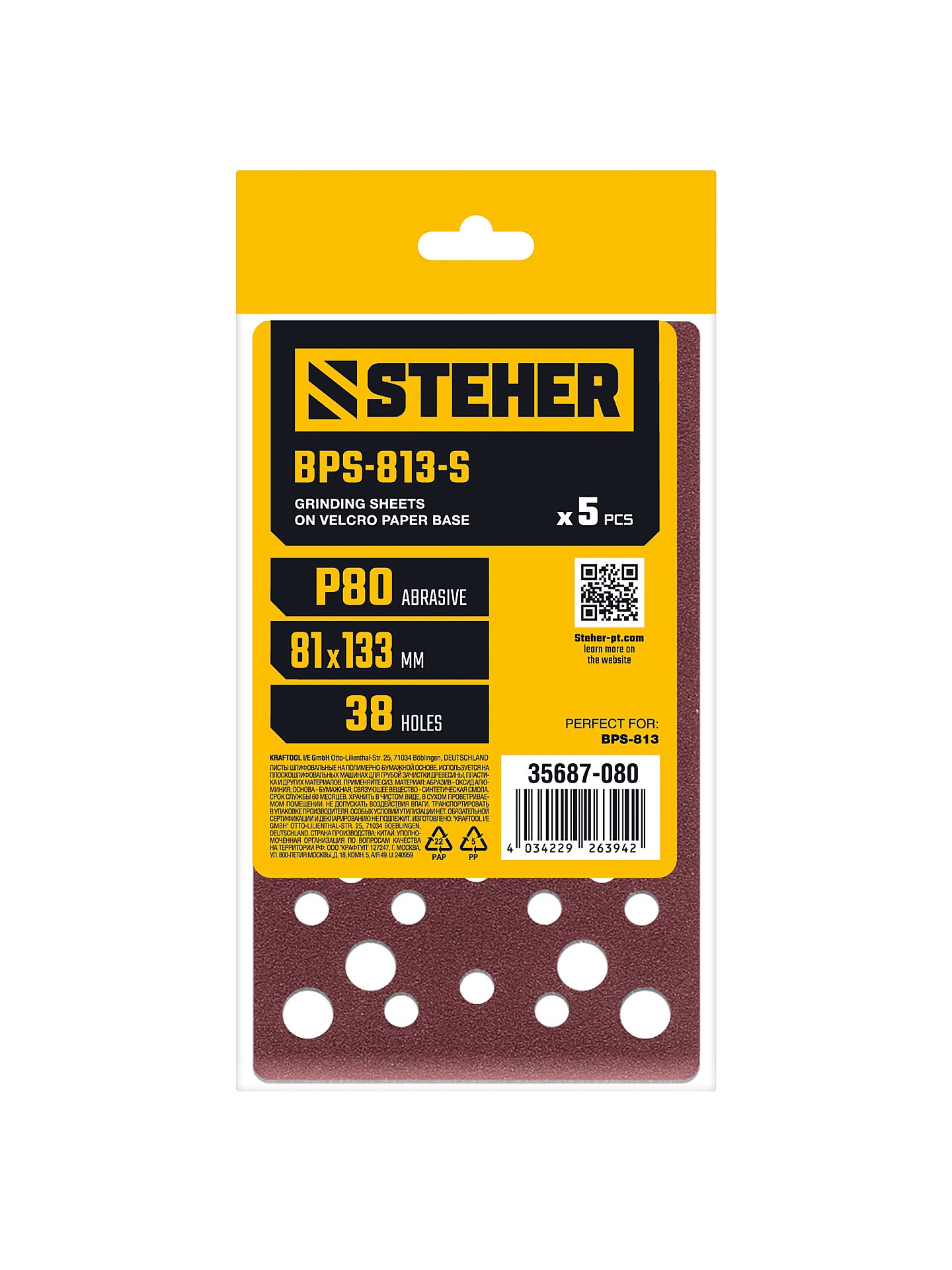 STEHER BPS-813-S 81х133 мм, Р80, шлифовальный лист на липучке, 46 отв., 5 шт. (35687-080)