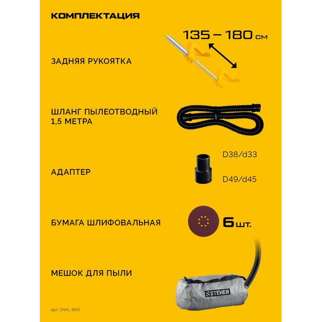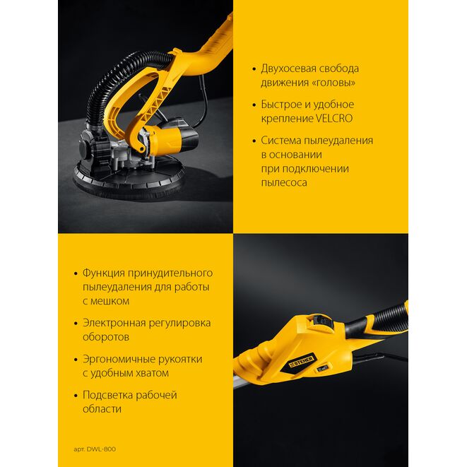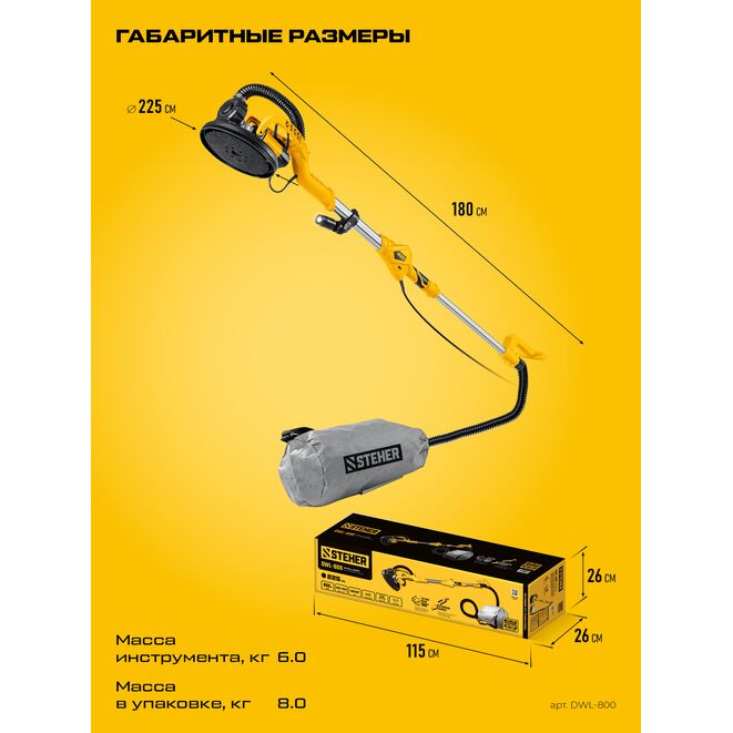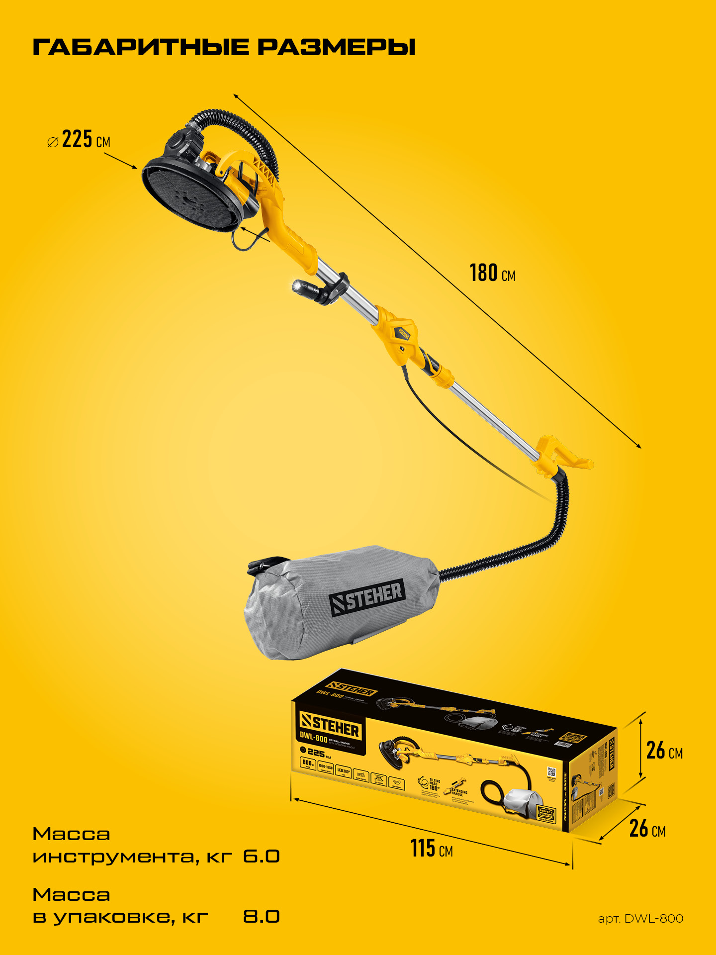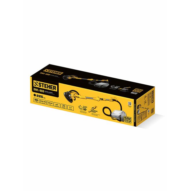STEHER d225 мм, 800 Вт, удлиненная рукоятка, подсветка, шлифовальная машина для стен (жираф) (DWL-800)
