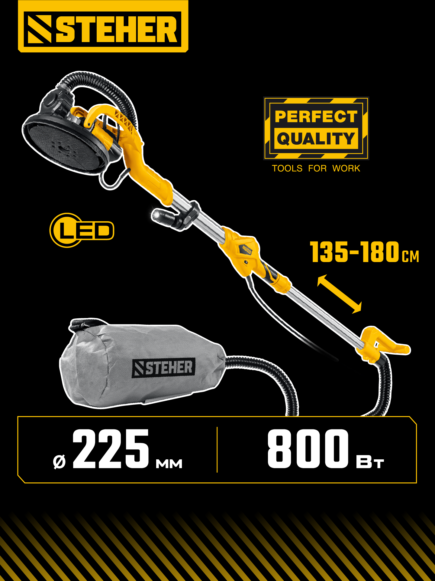 STEHER d225 мм, 800 Вт, удлиненная рукоятка, подсветка, шлифовальная машина для стен (жираф) (DWL-800)
