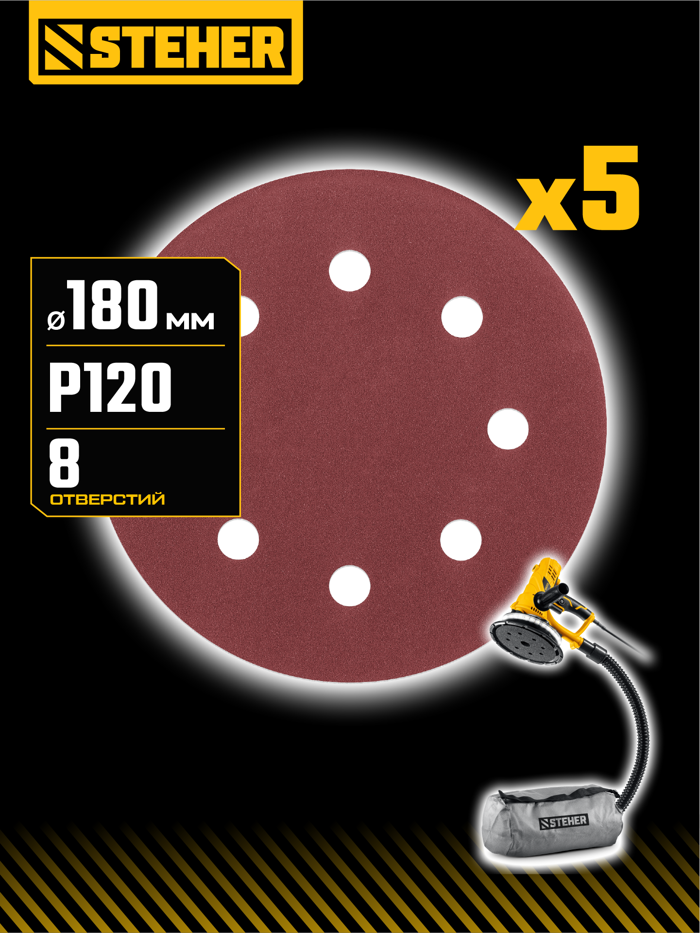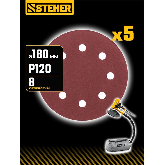 STEHER DWH-180-S 180 мм, Р120, шлифовальный круг на липучке, 8 отв., 5 шт. (35682-120)