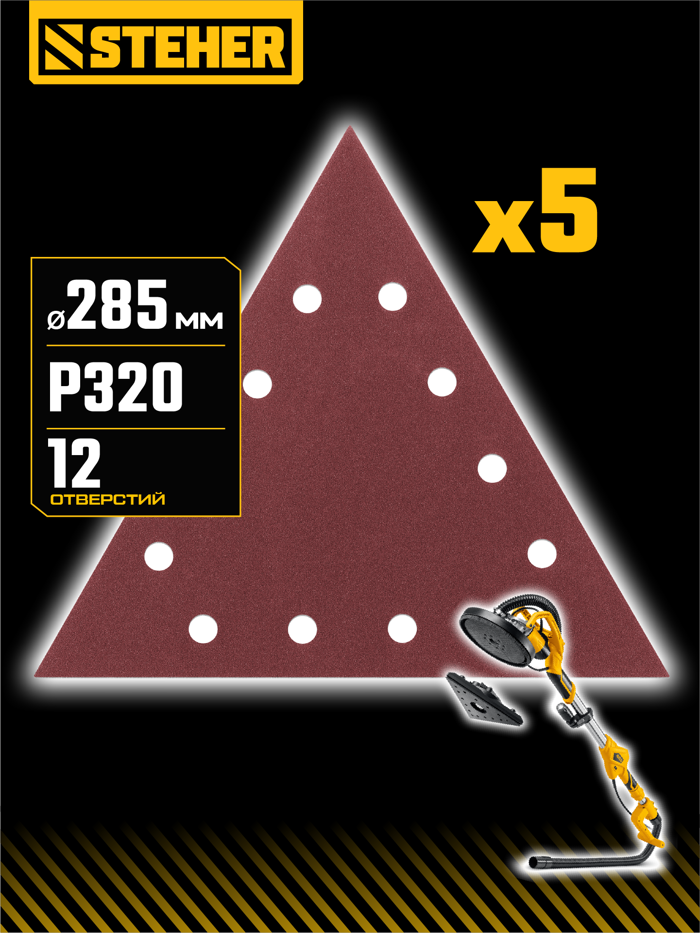 STEHER GIRAFFE T-285 мм, Р320, шлифовальный треугольник на липучке, 12 отв., 5 шт. (35683-320)