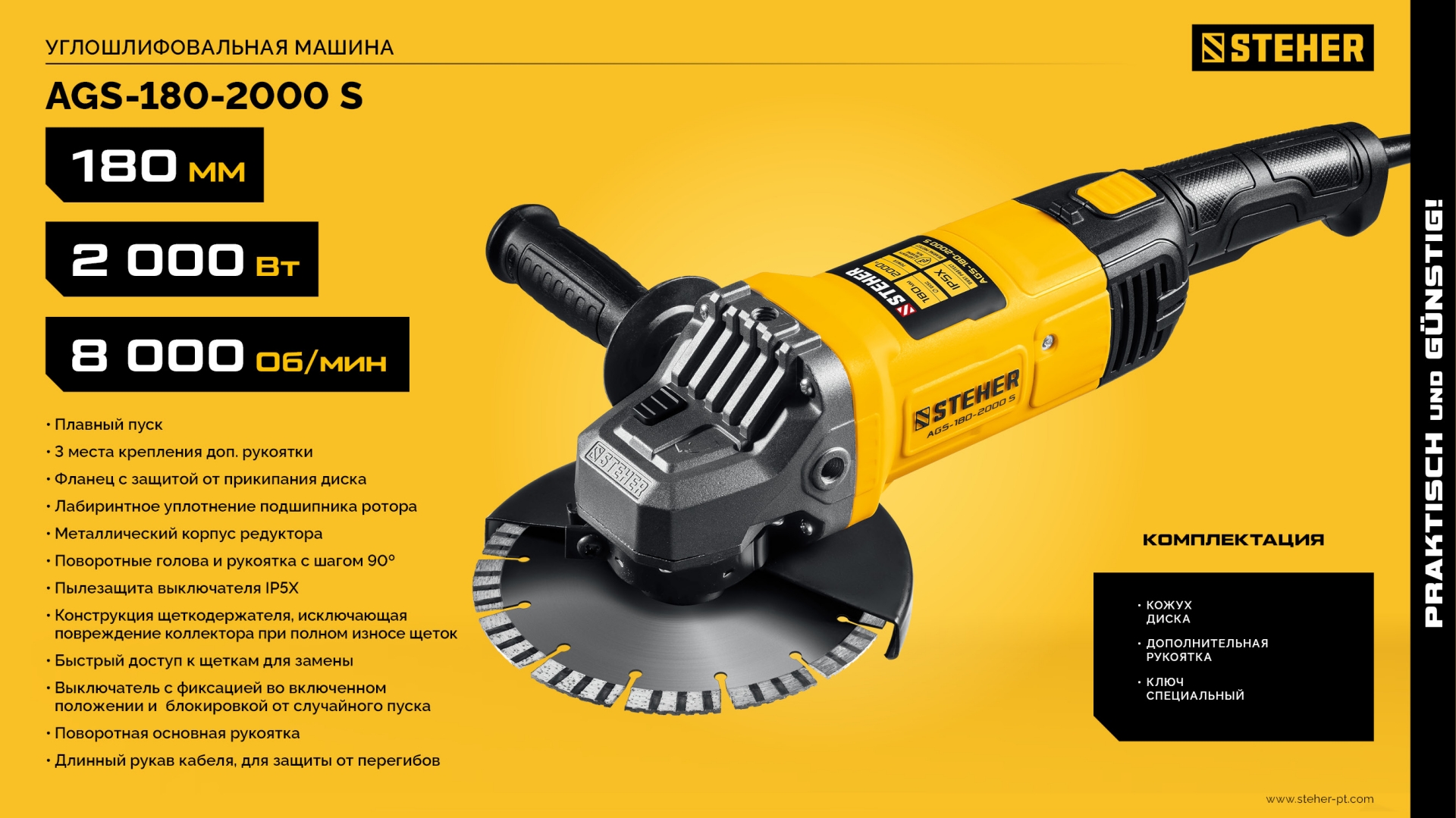 Угловая шлифмашина STEHER AGS-125-800, предназначена для использования в качестве отрезной, дисковой шлифовальной, шлифовальной и зачистной машины при установке соответствующего расходного инструмента.Характеристики STEHER AGS-125-800: