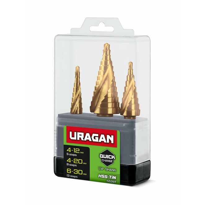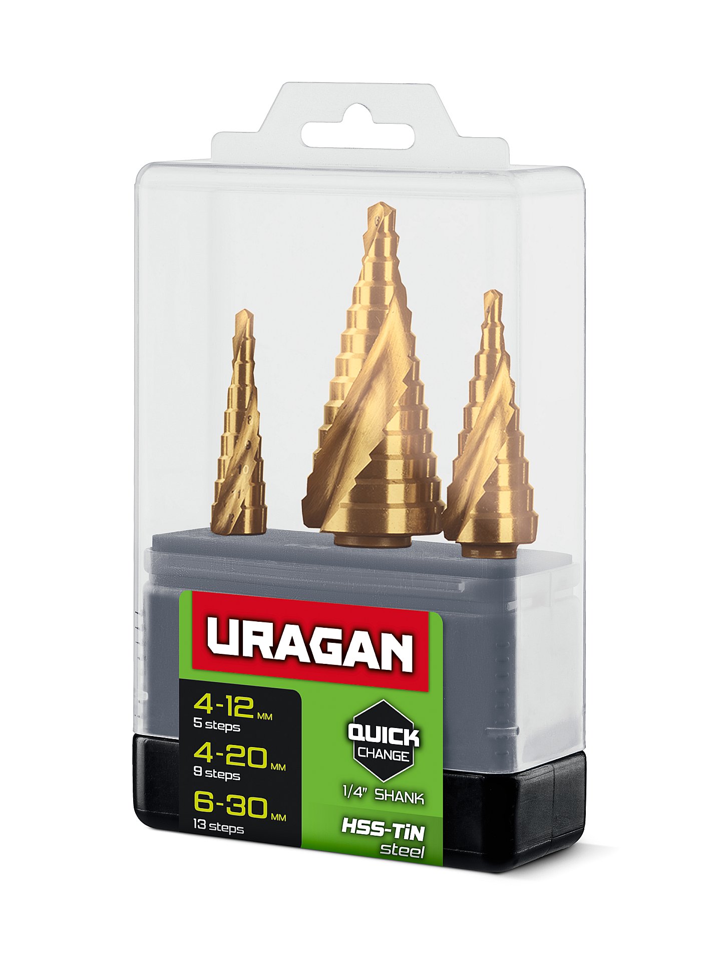 URAGAN 3 шт, 4-30 мм, винтовая спираль, набор сверл ступенчатых (29658-4-30-H3)