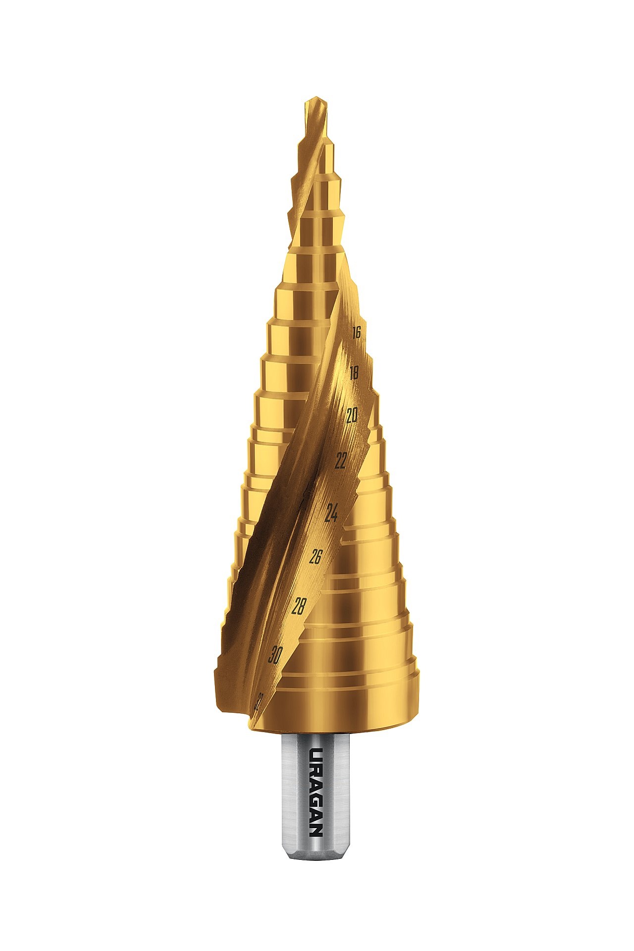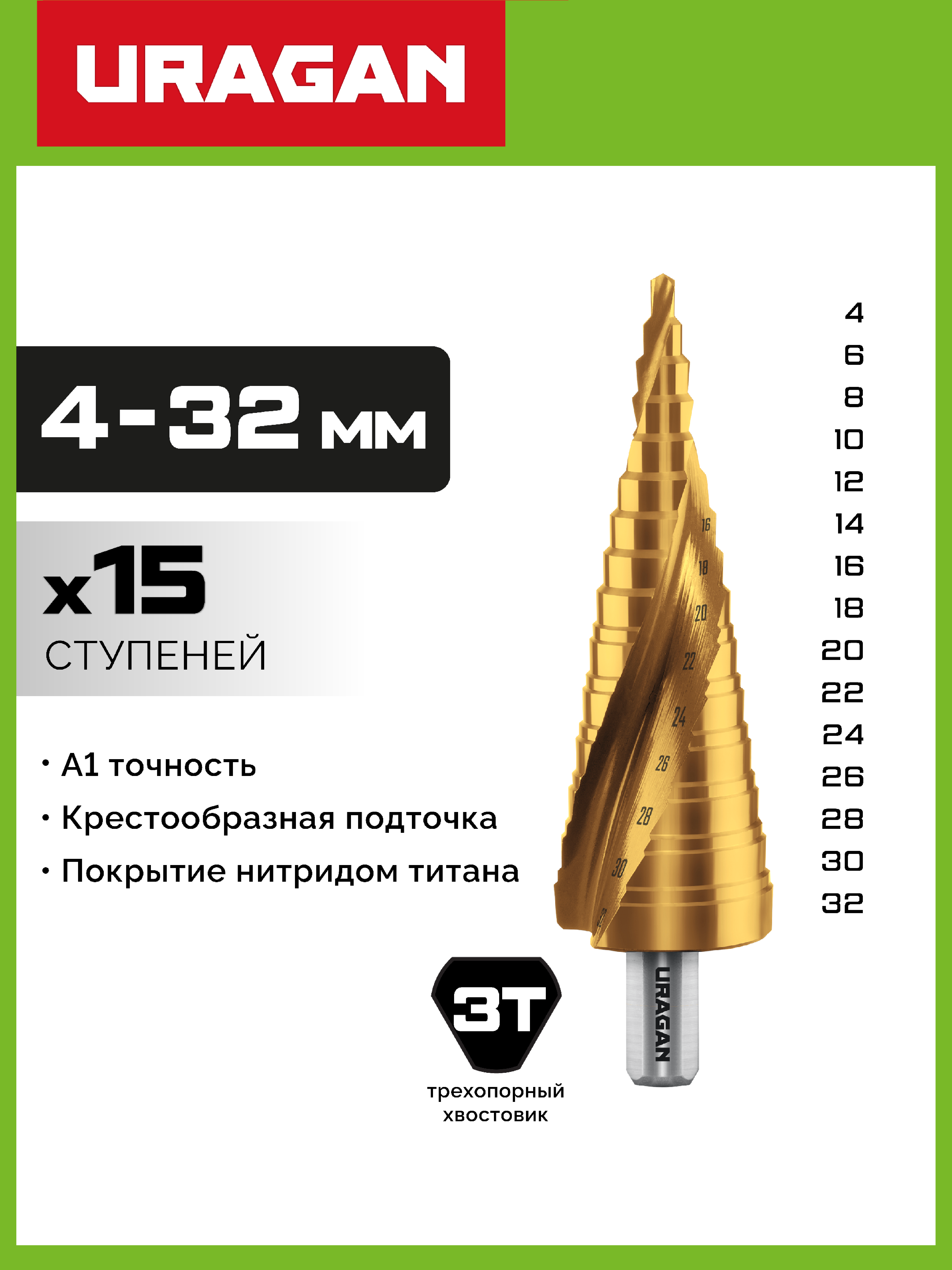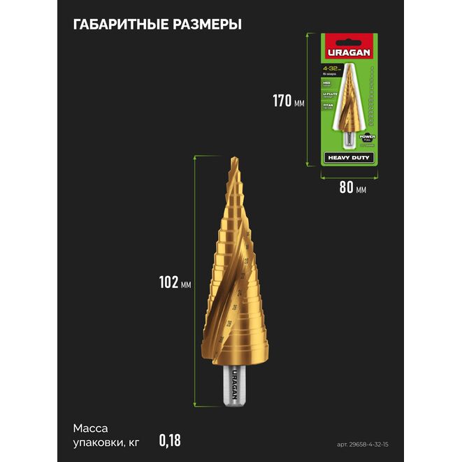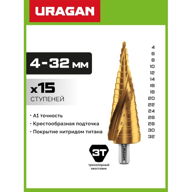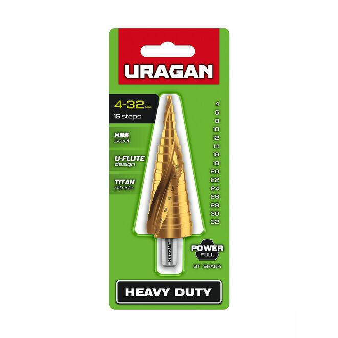 URAGAN 4-32 мм, 15 ступеней, винтовая спираль, сверло ступенчатое (29658-4-32-15)
