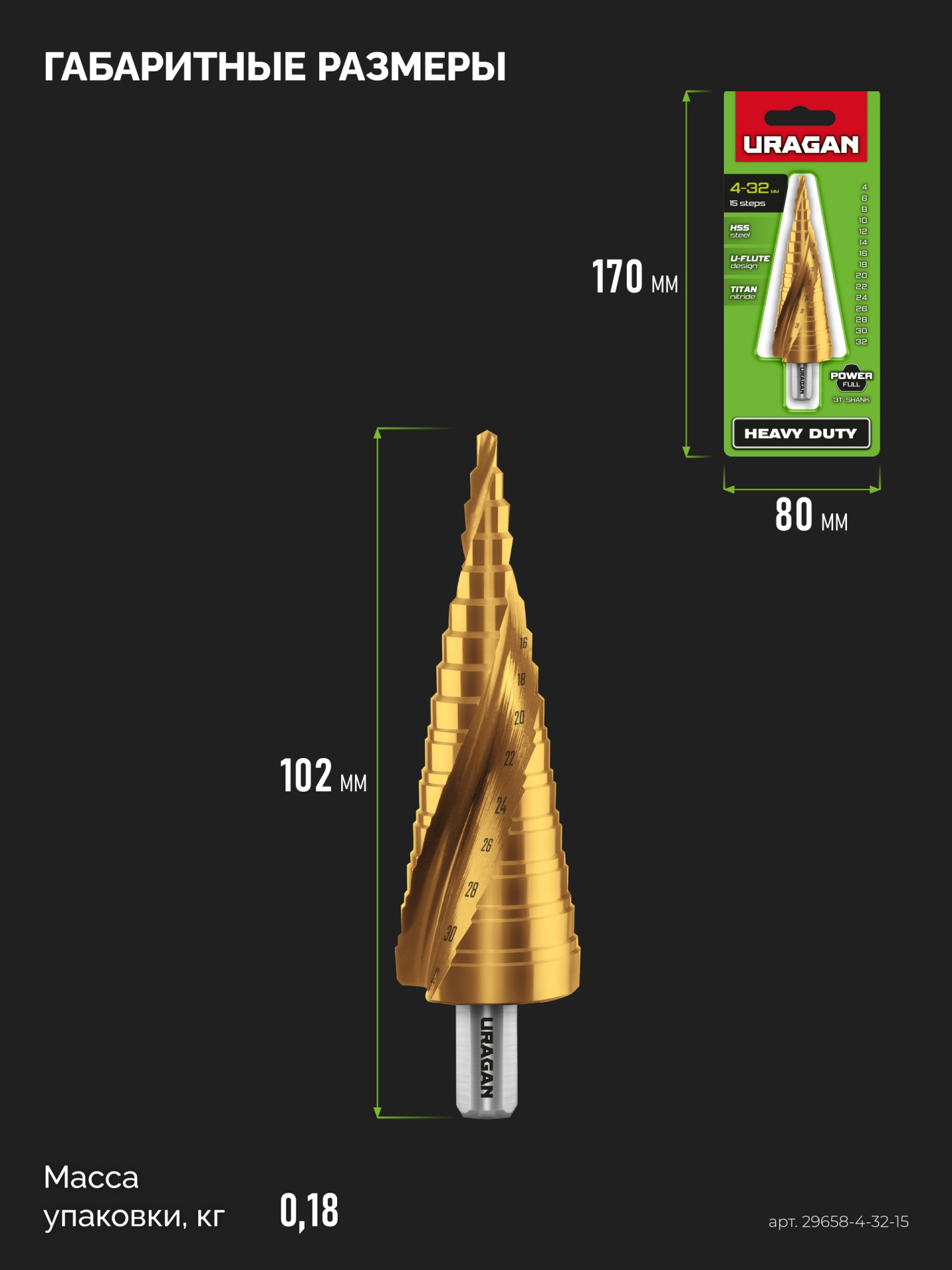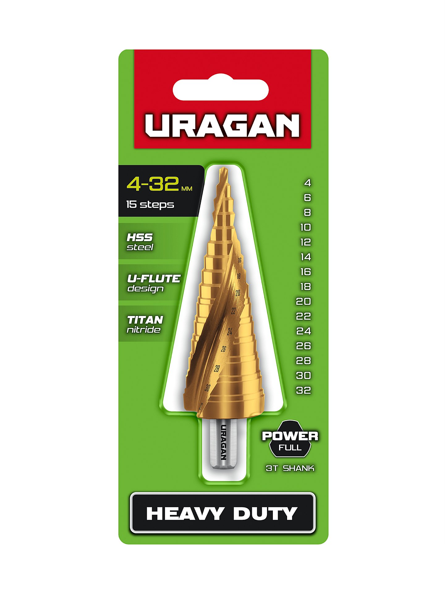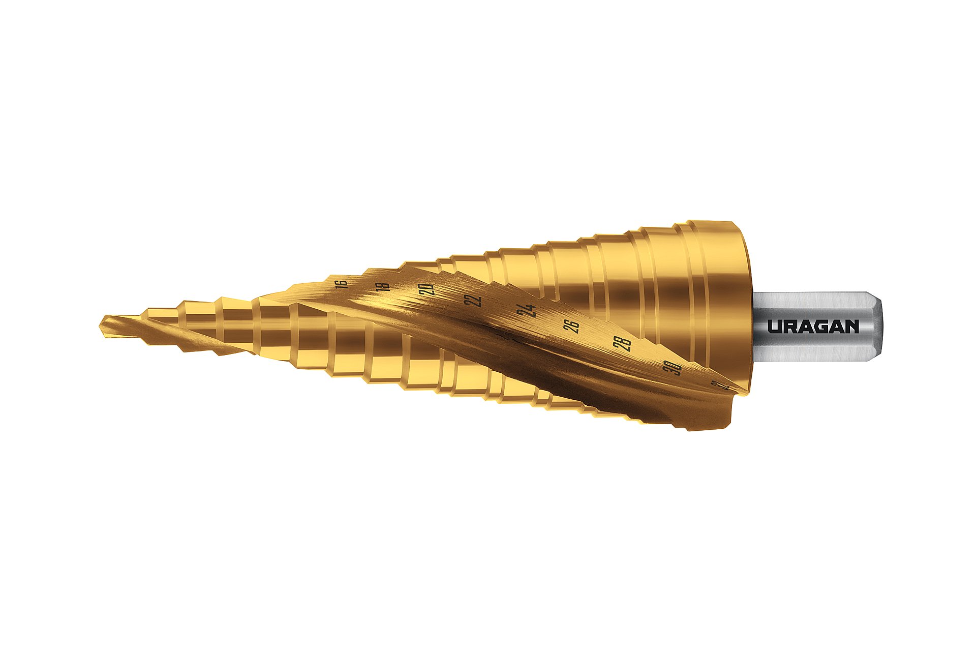 URAGAN 4-32 мм, 15 ступеней, винтовая спираль, сверло ступенчатое (29658-4-32-15)