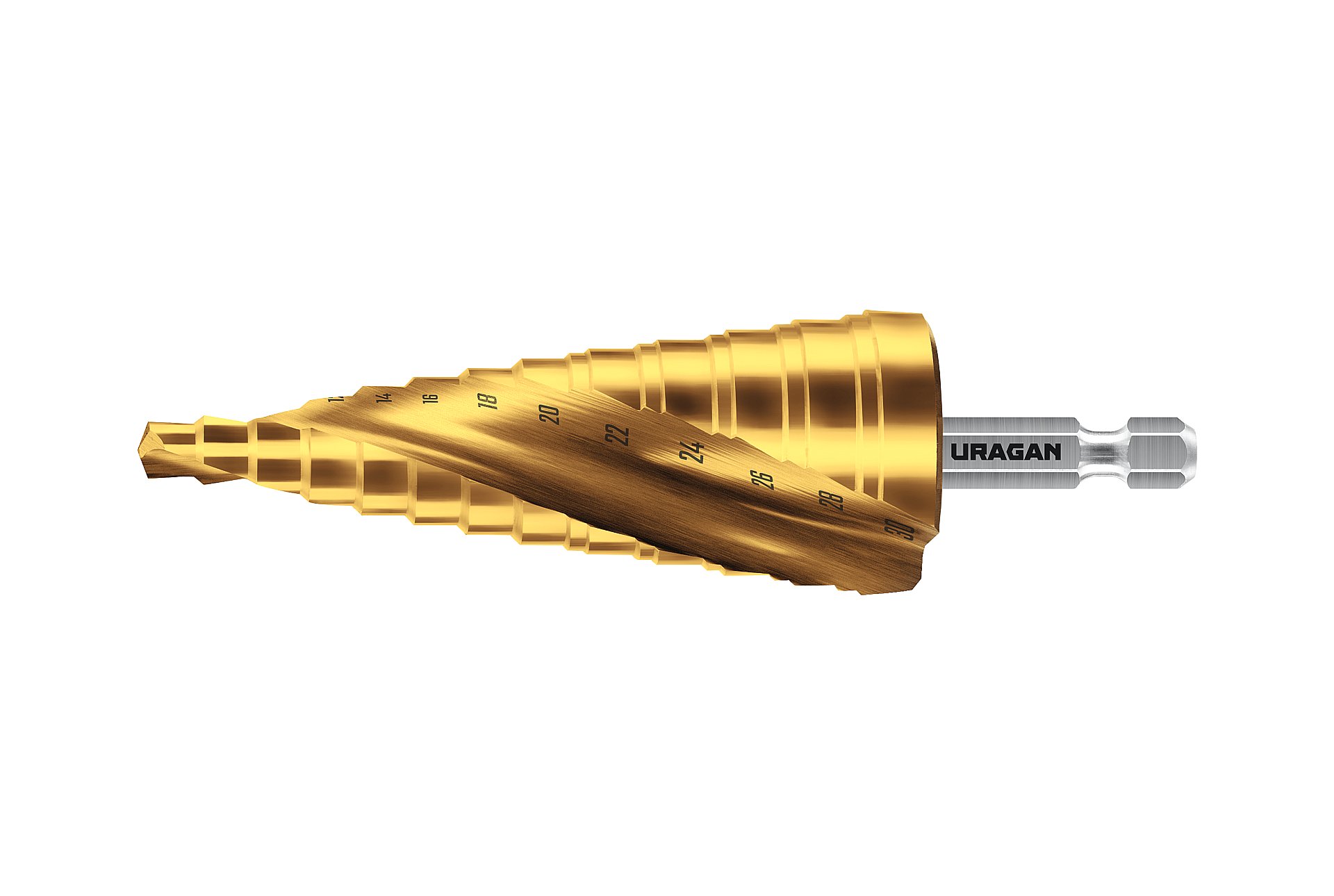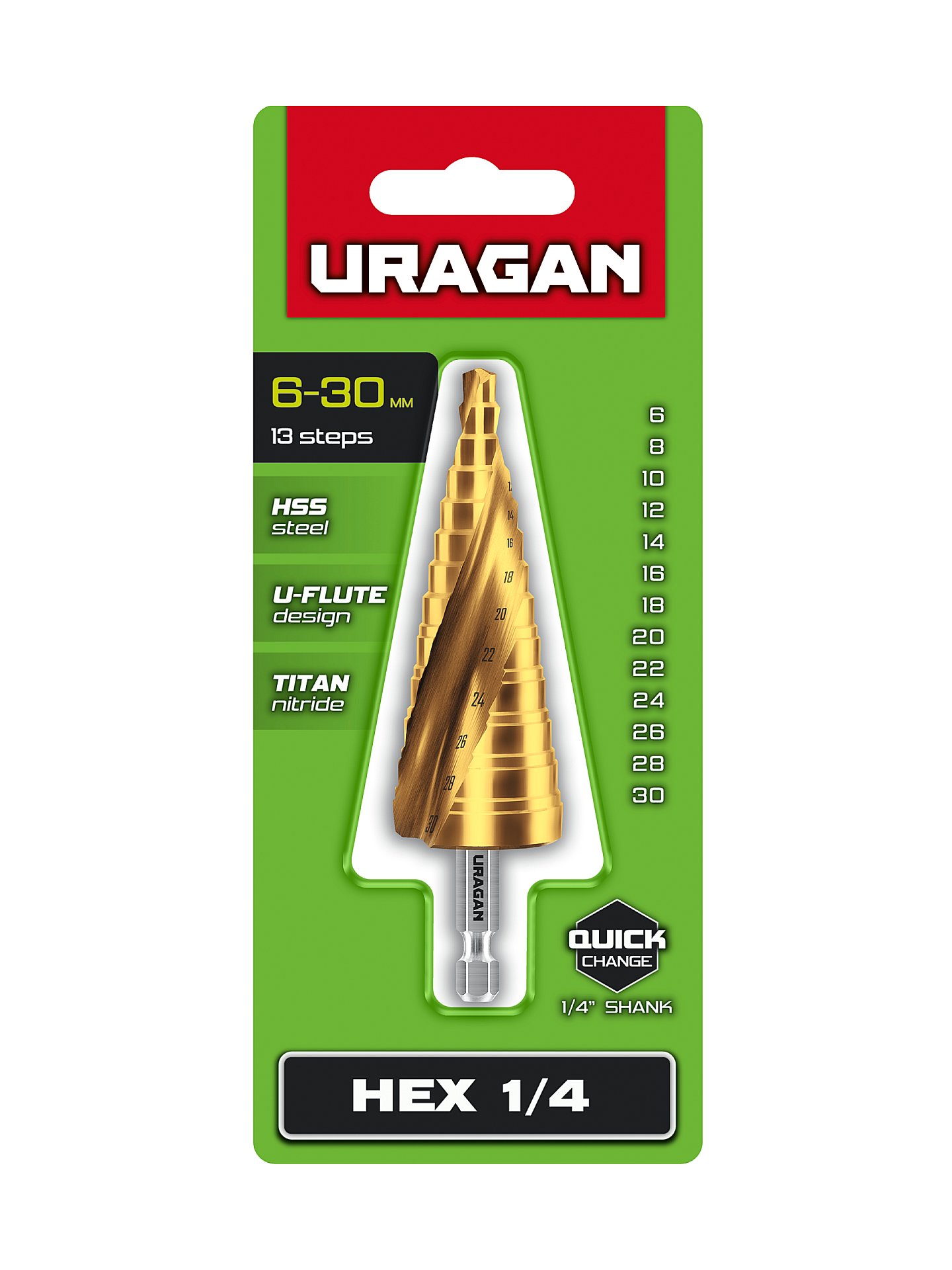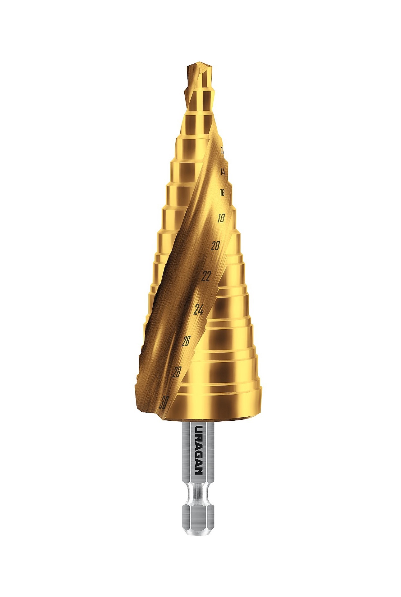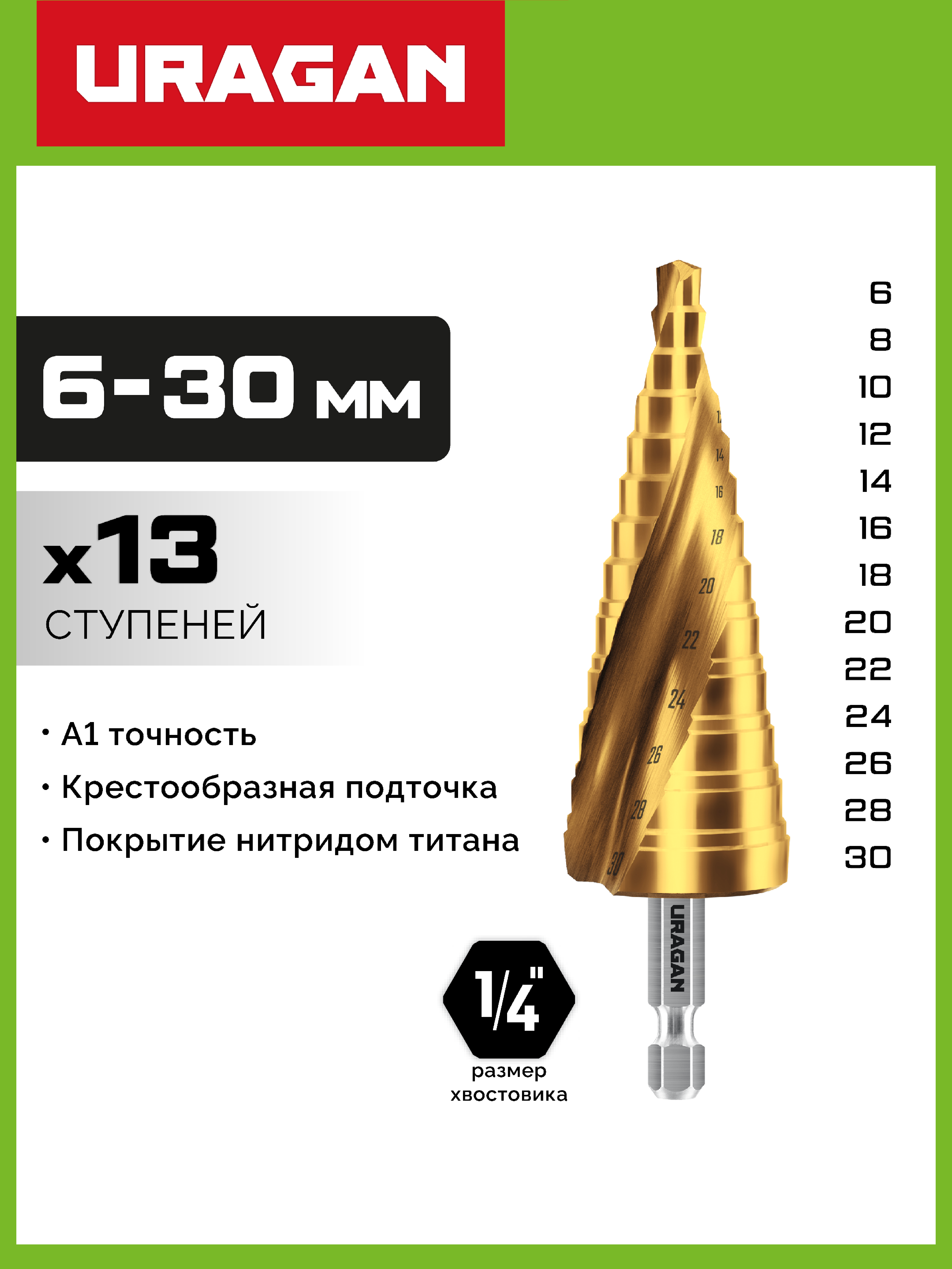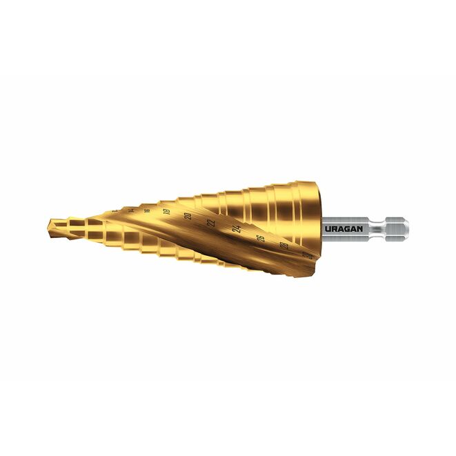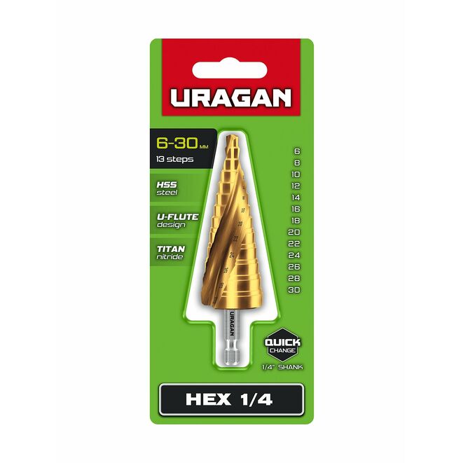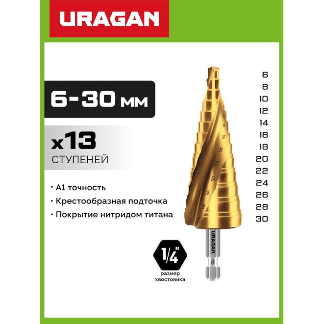 URAGAN 6-30 мм, 13 ступеней, винтовая спираль, сверло ступенчатое (29658-6-30-13)
