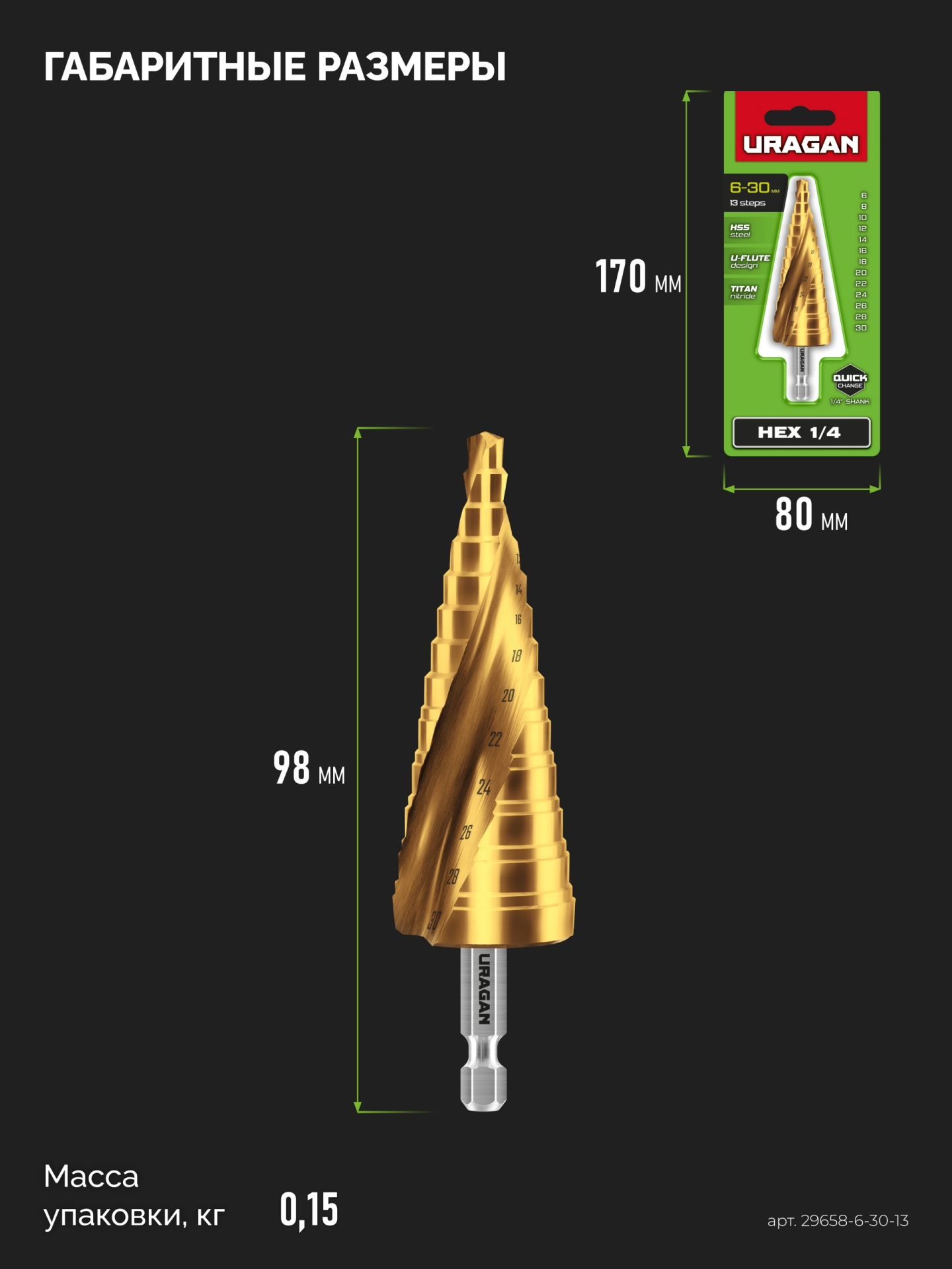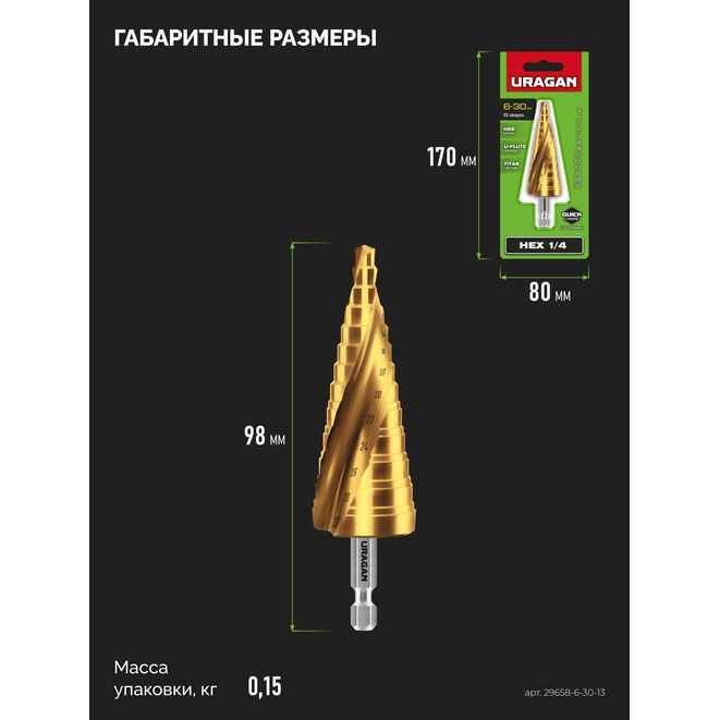 Сверло URAGAN 29658-6-30-13, предназначено для сверления металлических конструкций и заготовок, листовых материалов, цветных металлов, пластика. Множество диаметров в одном сверле для сверления различных листовых материалов. 13 ступ: Ø 6 - 8 - 10 - 12 - 14 - 16 - 18 - 20 - 22 - 24 - 26 - 28 - 30 мм.Характеристики Uragan 29658-6-30-13:
