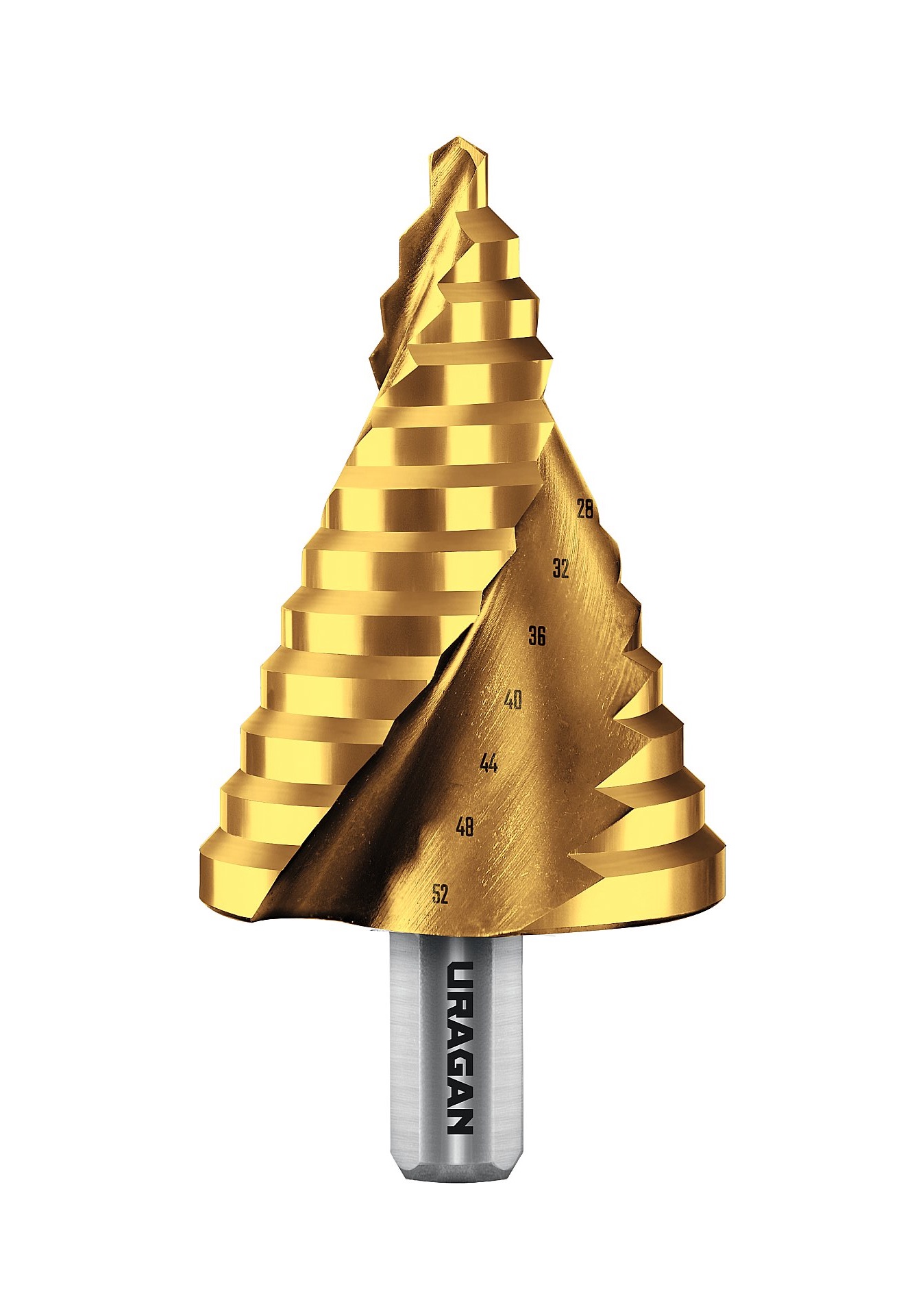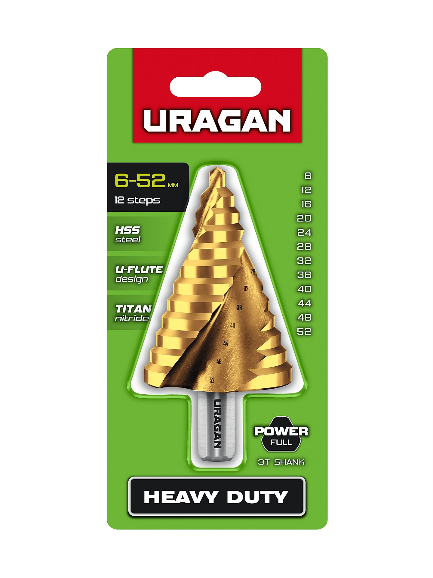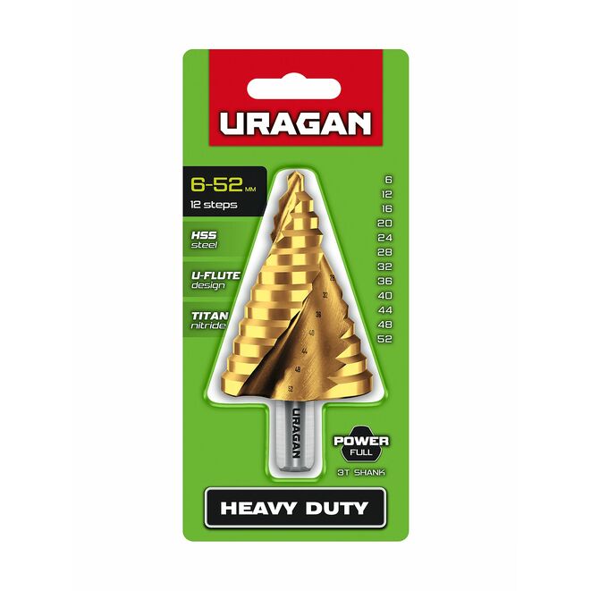 URAGAN 6-52 мм, 12 ступеней, винтовая спираль, сверло ступенчатое (29658-6-52-12)