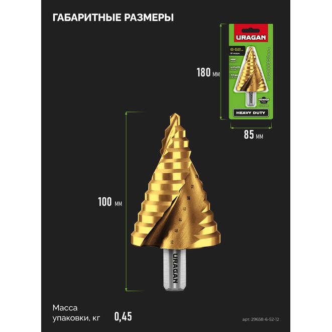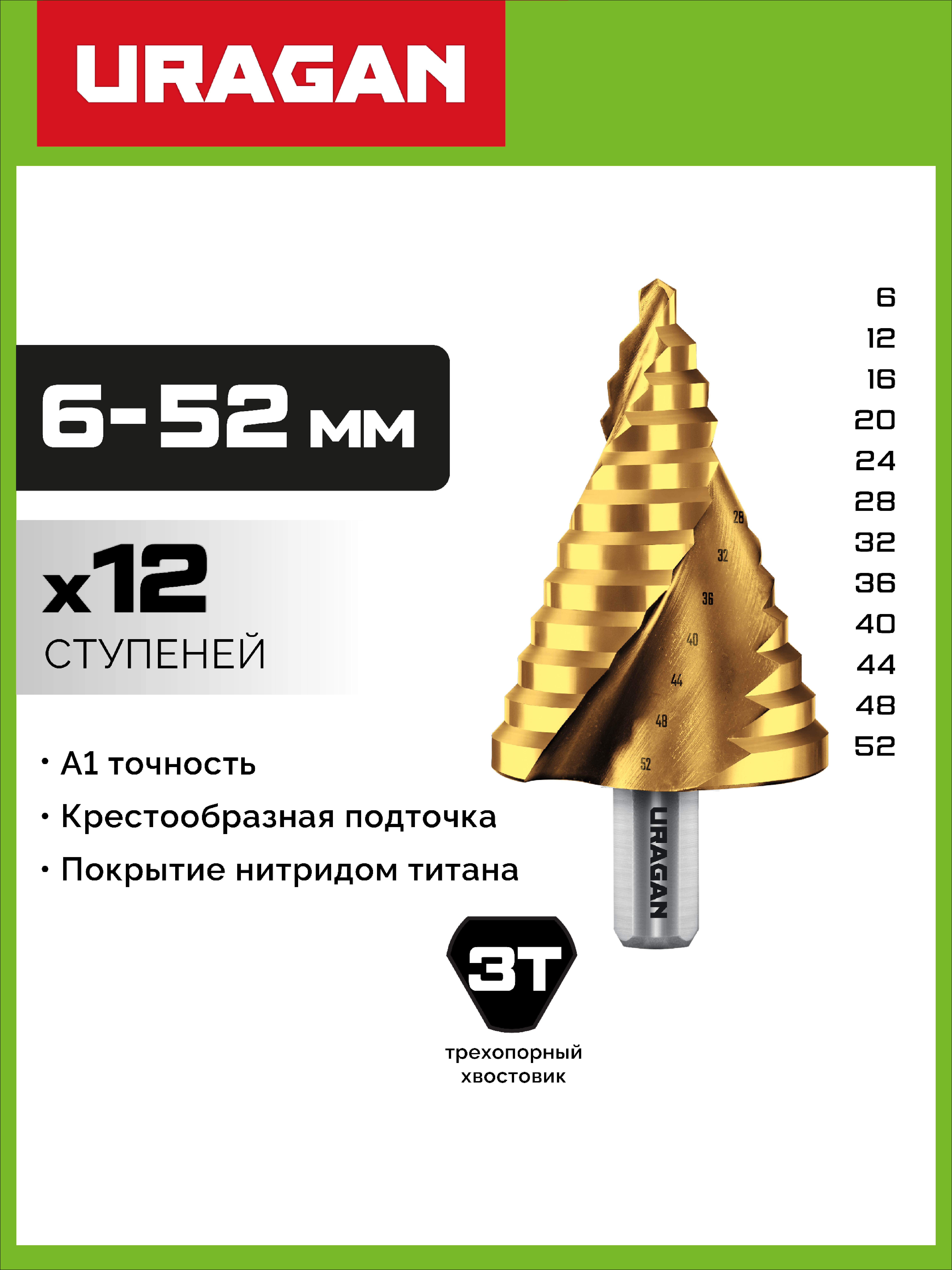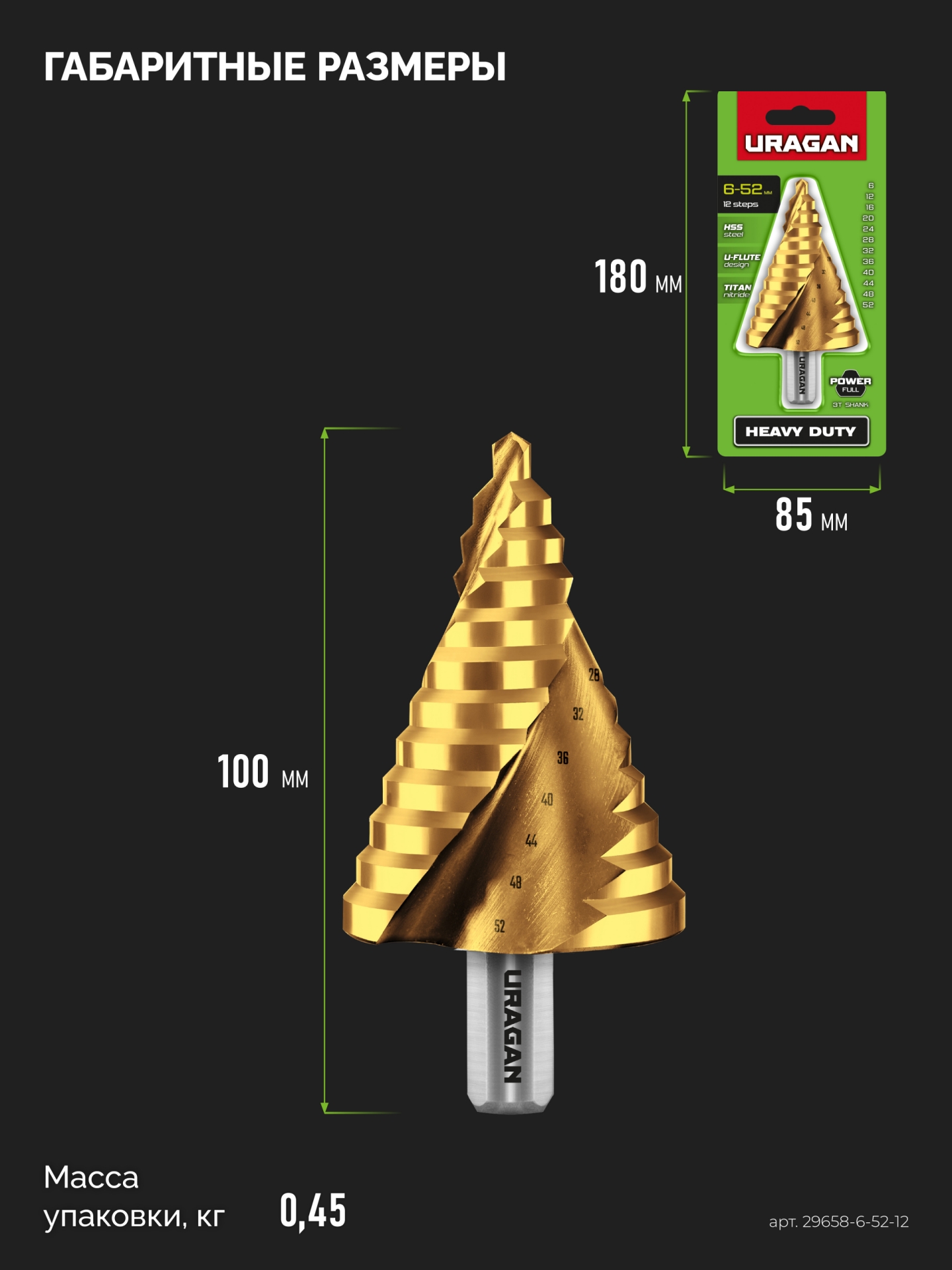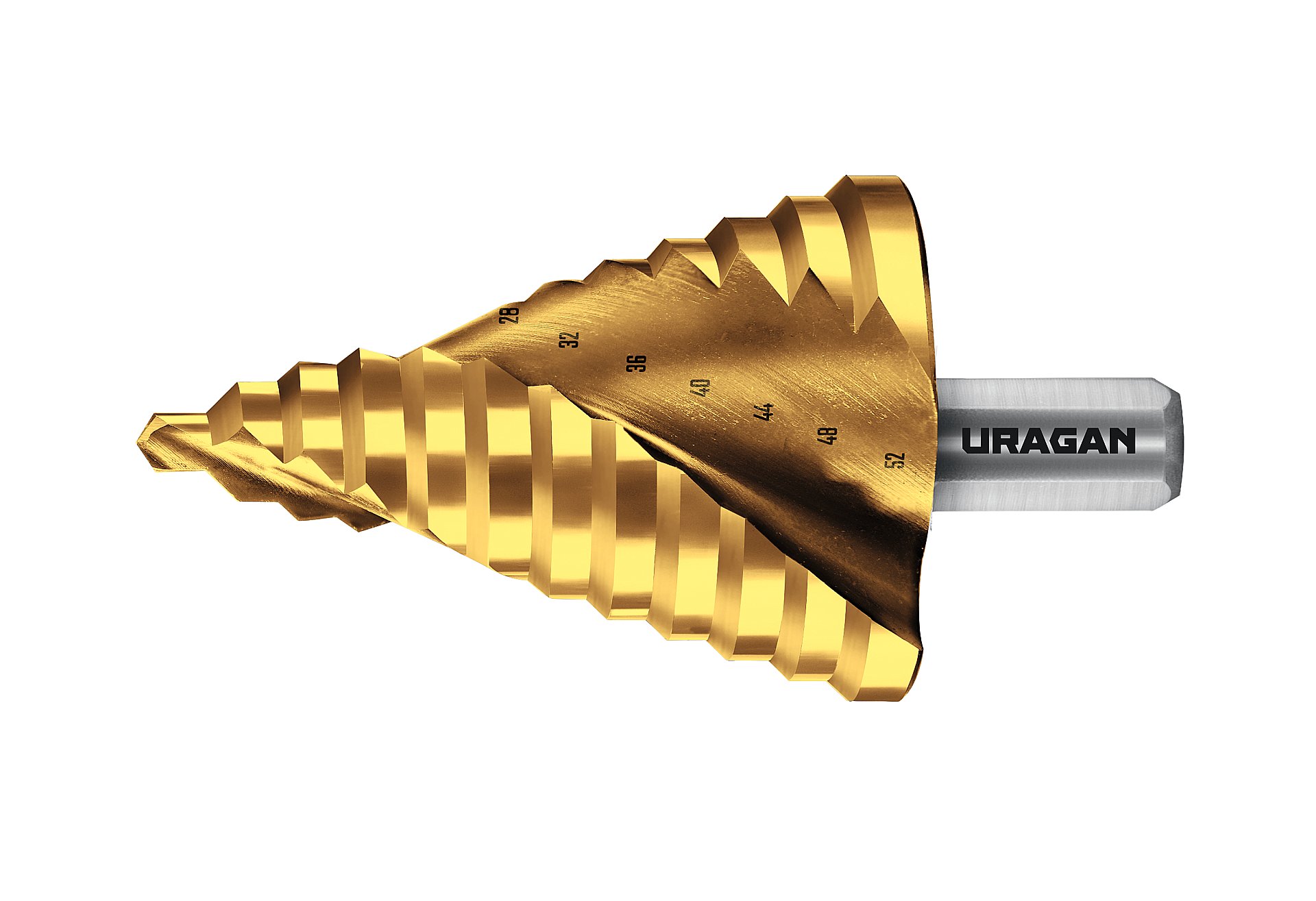 URAGAN 6-52 мм, 12 ступеней, винтовая спираль, сверло ступенчатое (29658-6-52-12)