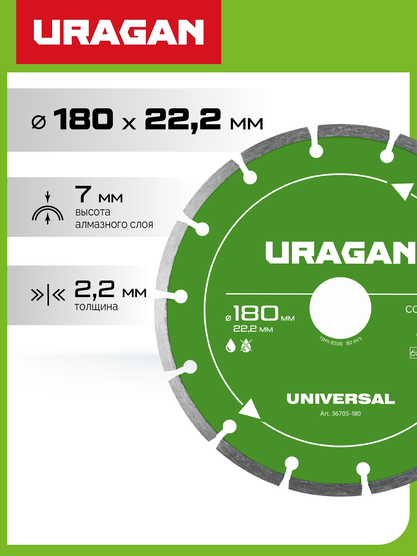 URAGAN UNIVERSAL 180 мм, диск алмазный отрезной сегментный (36705-180)