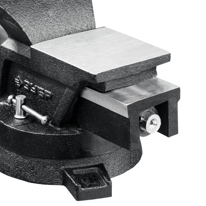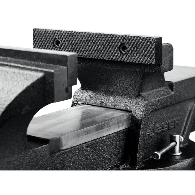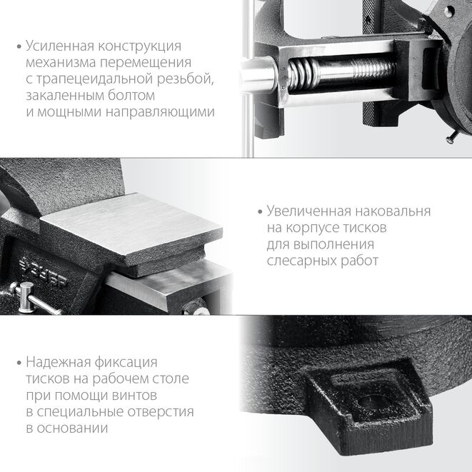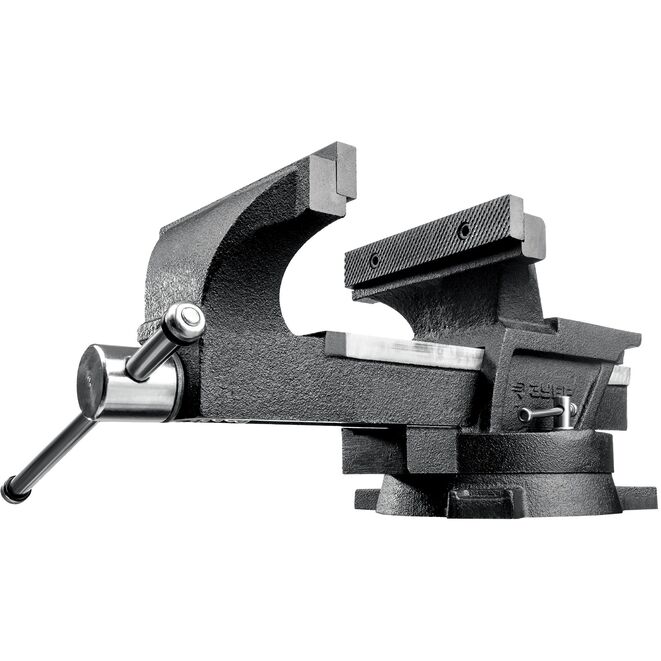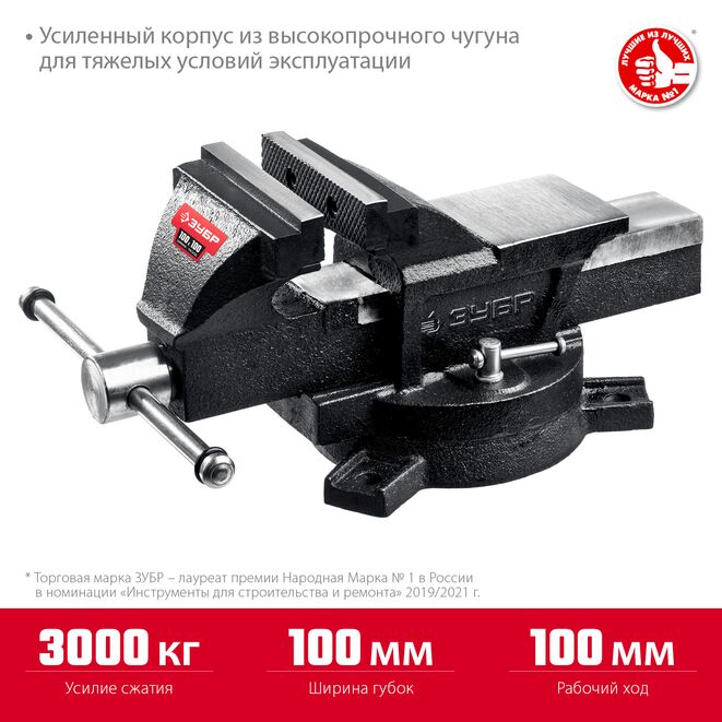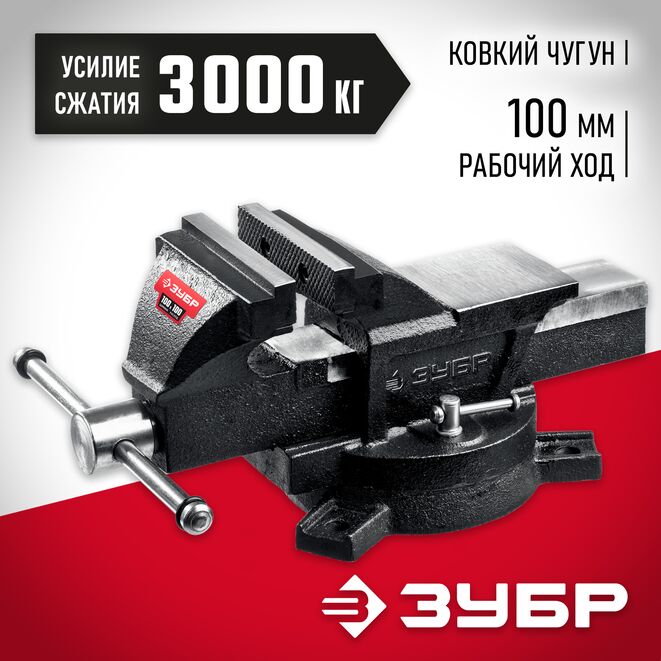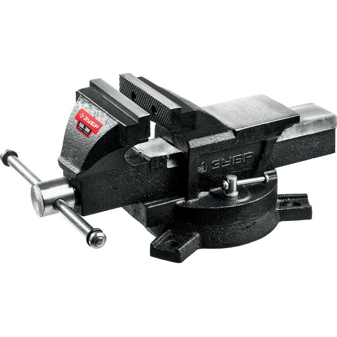 Тиски поворотные слесарные ЗУБР 3258-100_z01, предназначены для надежного фиксирования деталей и заготовок. Наковальня для мелких слесарных работ. Тиски изготовлены из высококачественного чугуна с закаленными стальными губками.