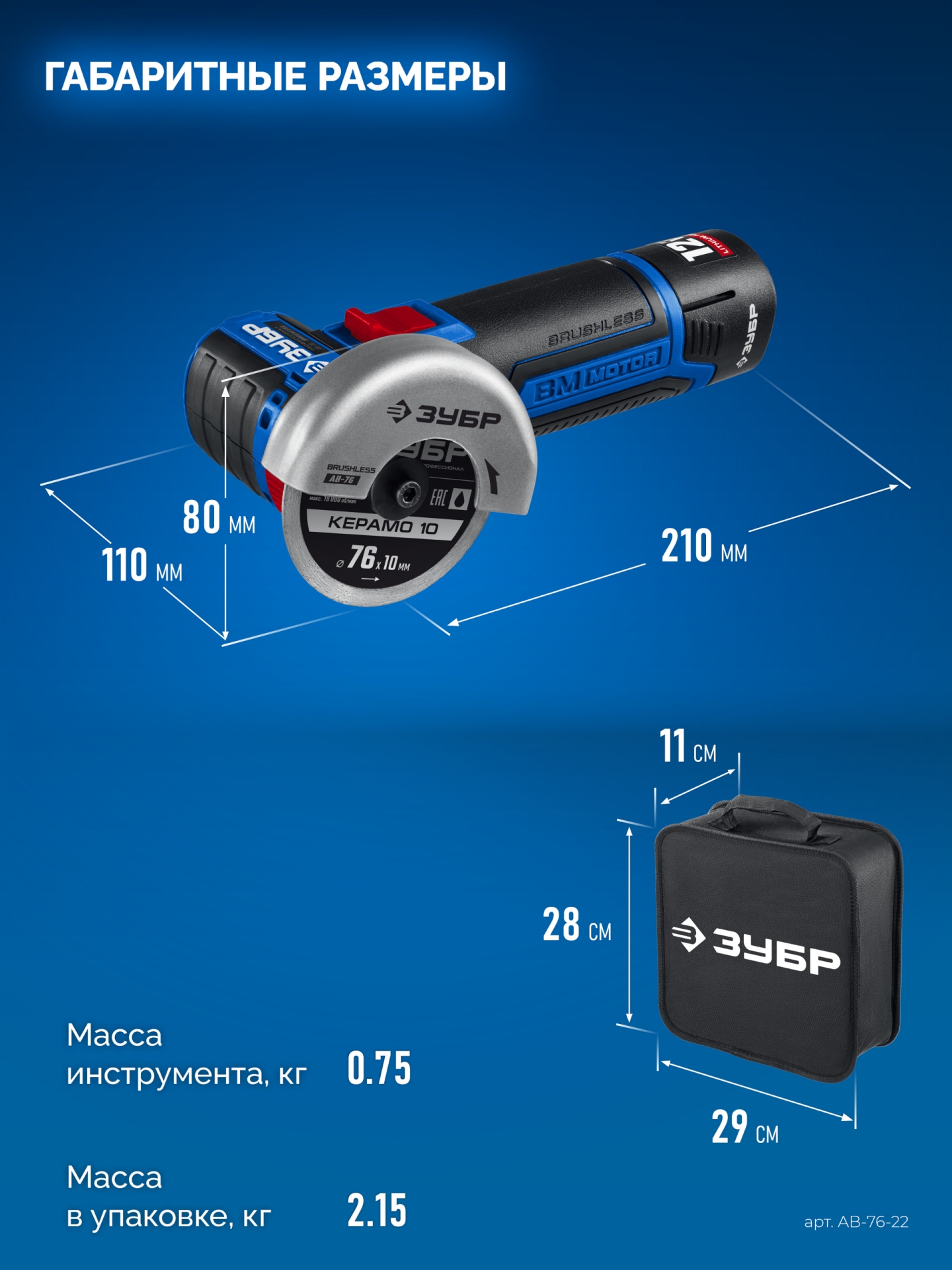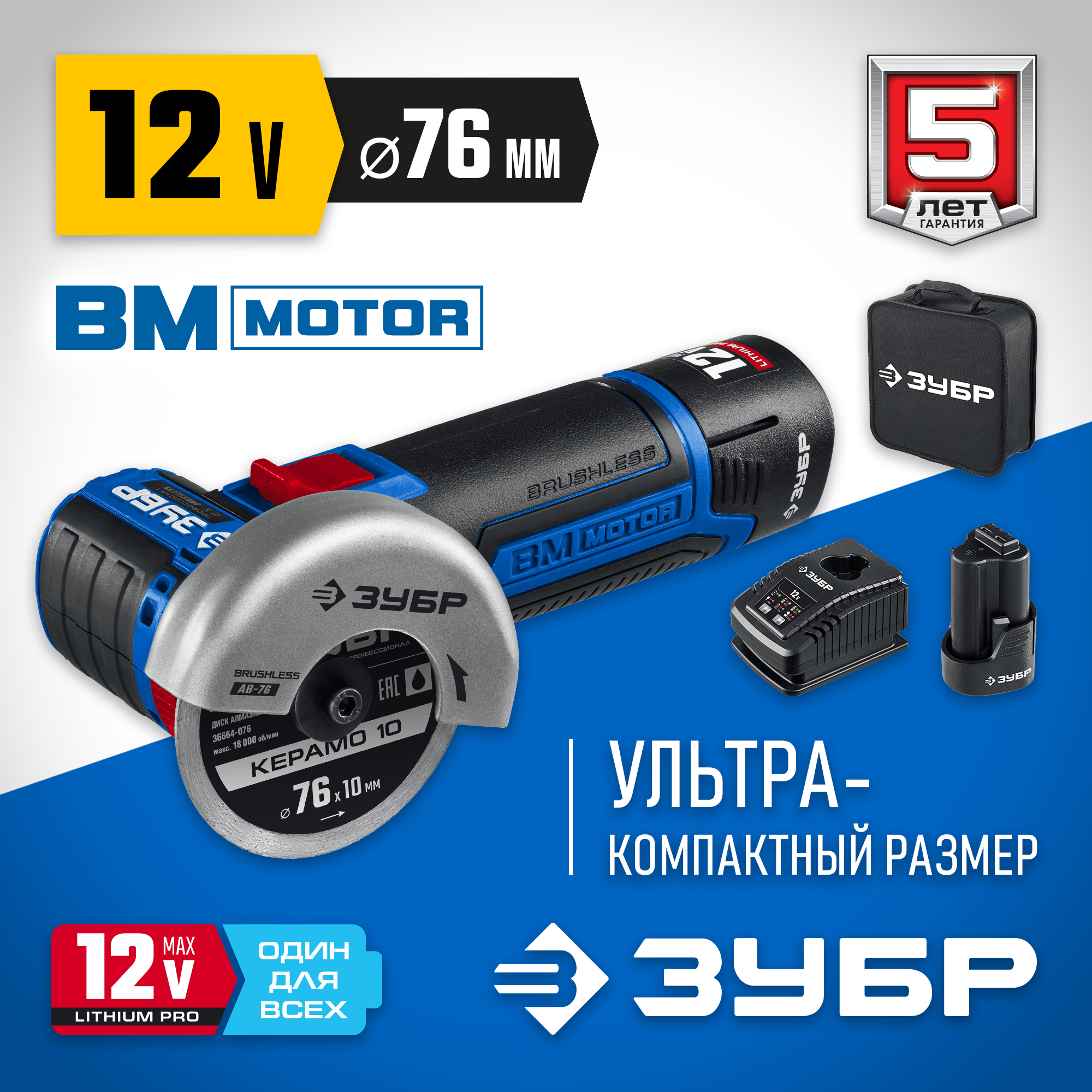 ЗУБР 12 В, d76 мм, 2 АКБ тип Т7 (2 А·ч), бесщеточная УШМ, сумка, Профессионал (AB-76-22)
