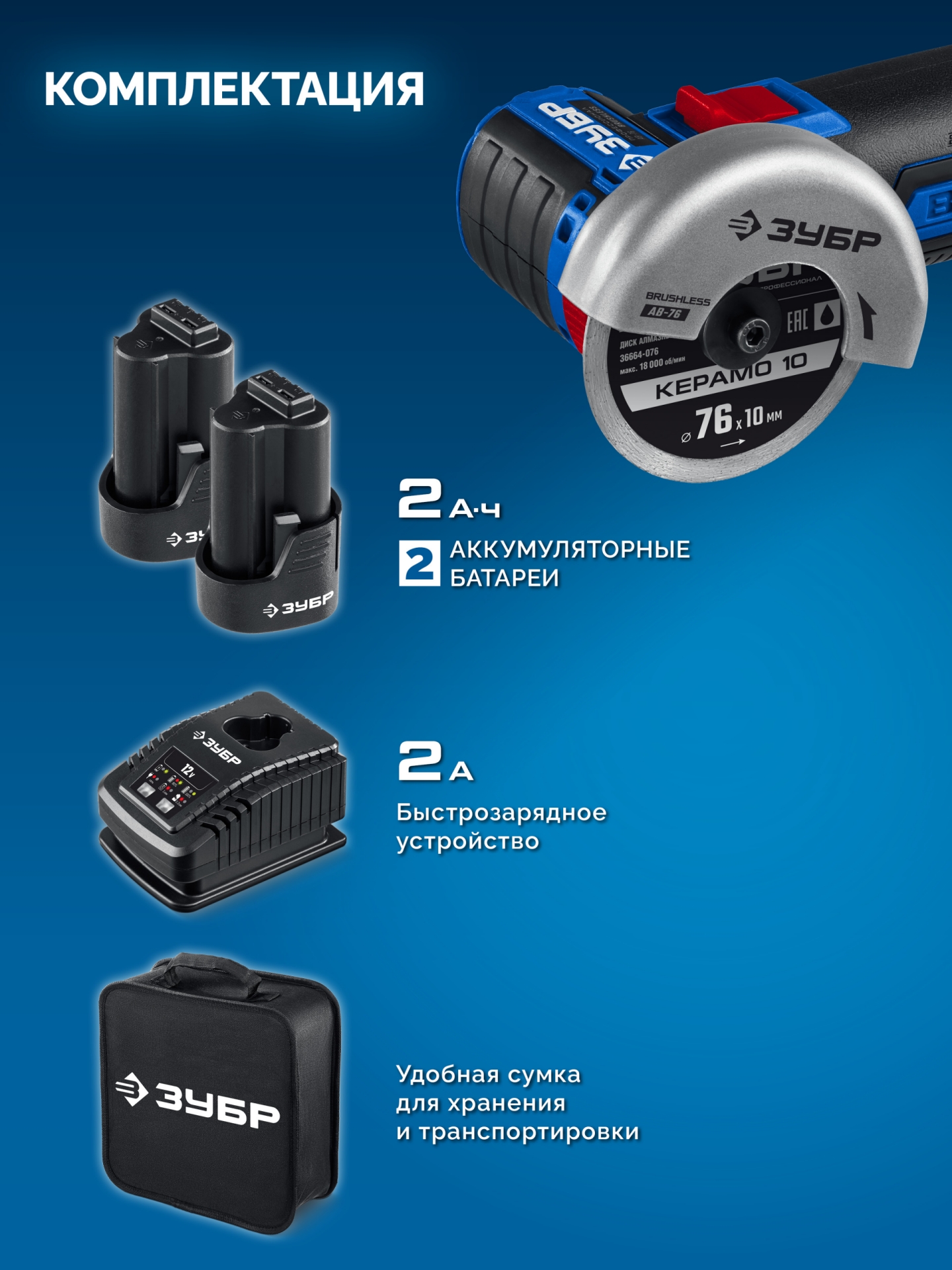 Принадлежности для ЗУБР 12 В, d76 мм, 2 АКБ тип Т7 (2 А·ч), бесщеточная УШМ, сумка, Профессионал (AB-76-22):