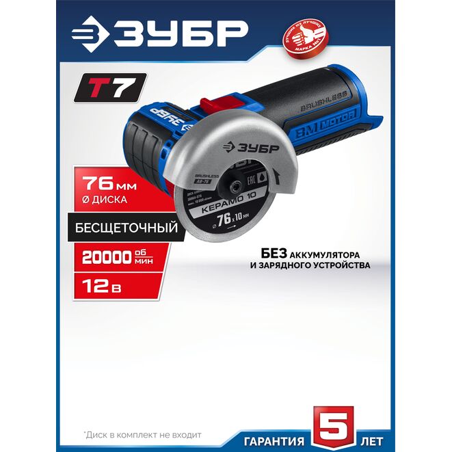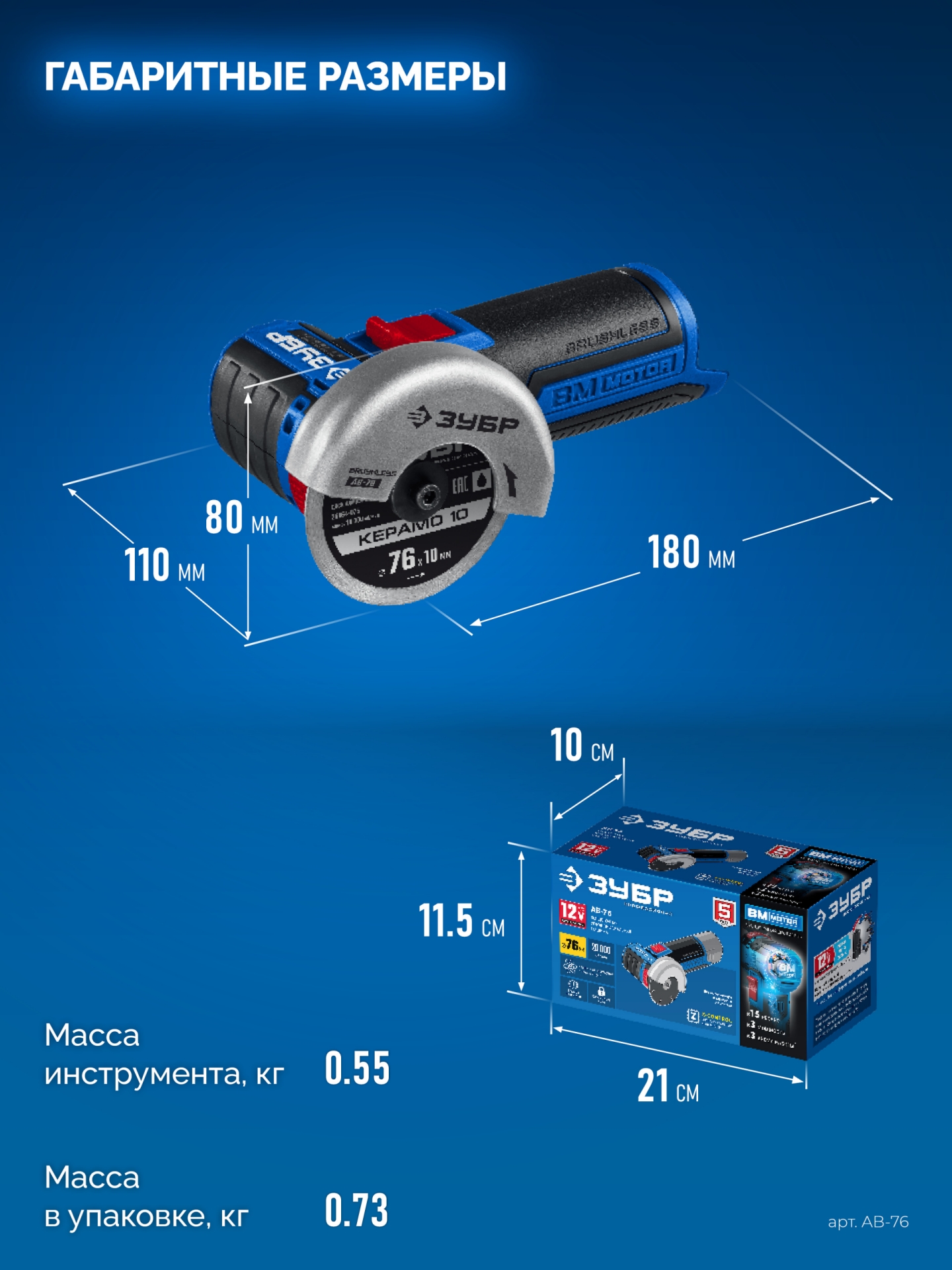 Принадлежности для ЗУБР 12 В, d76 мм, без АКБ (тип Т7), бесщеточная УШМ, Профессионал (AB-76):