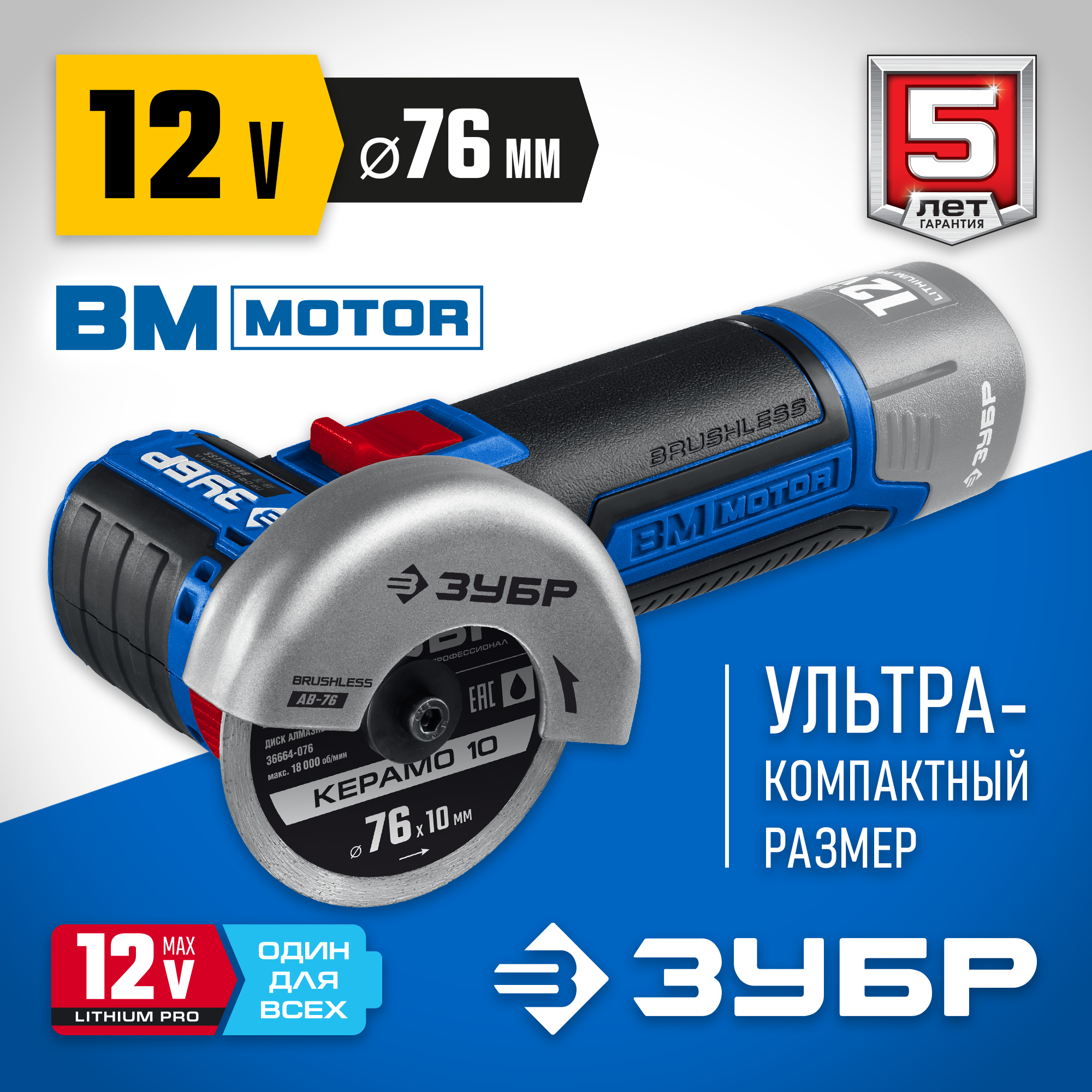 ЗУБР 12 В, d76 мм, без АКБ (тип Т7), бесщеточная УШМ, Профессионал (AB-76)