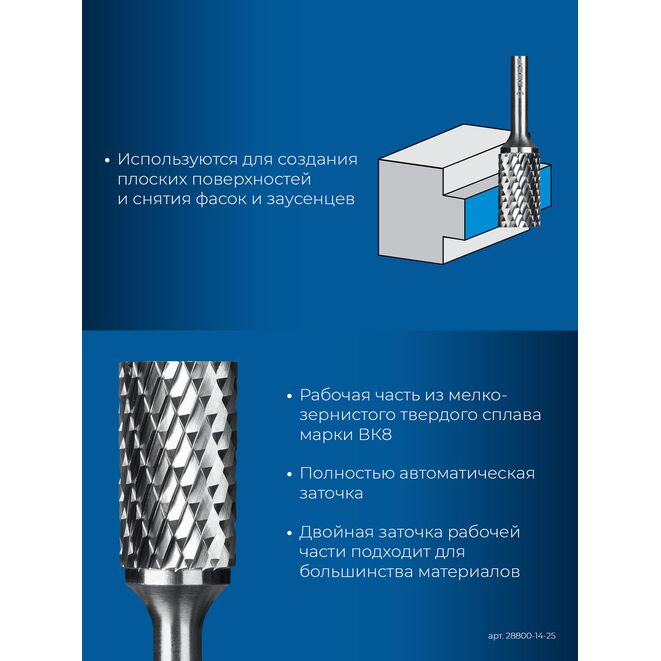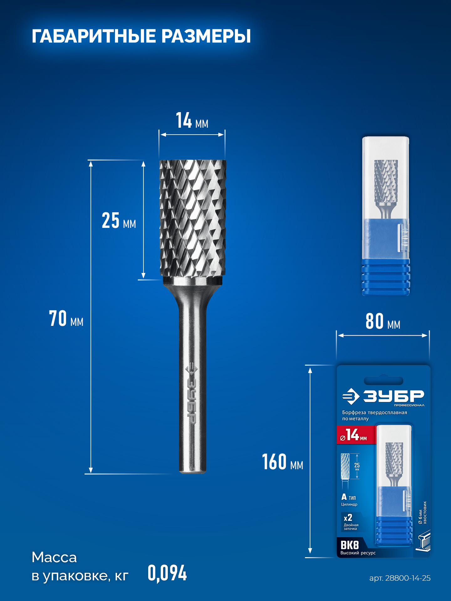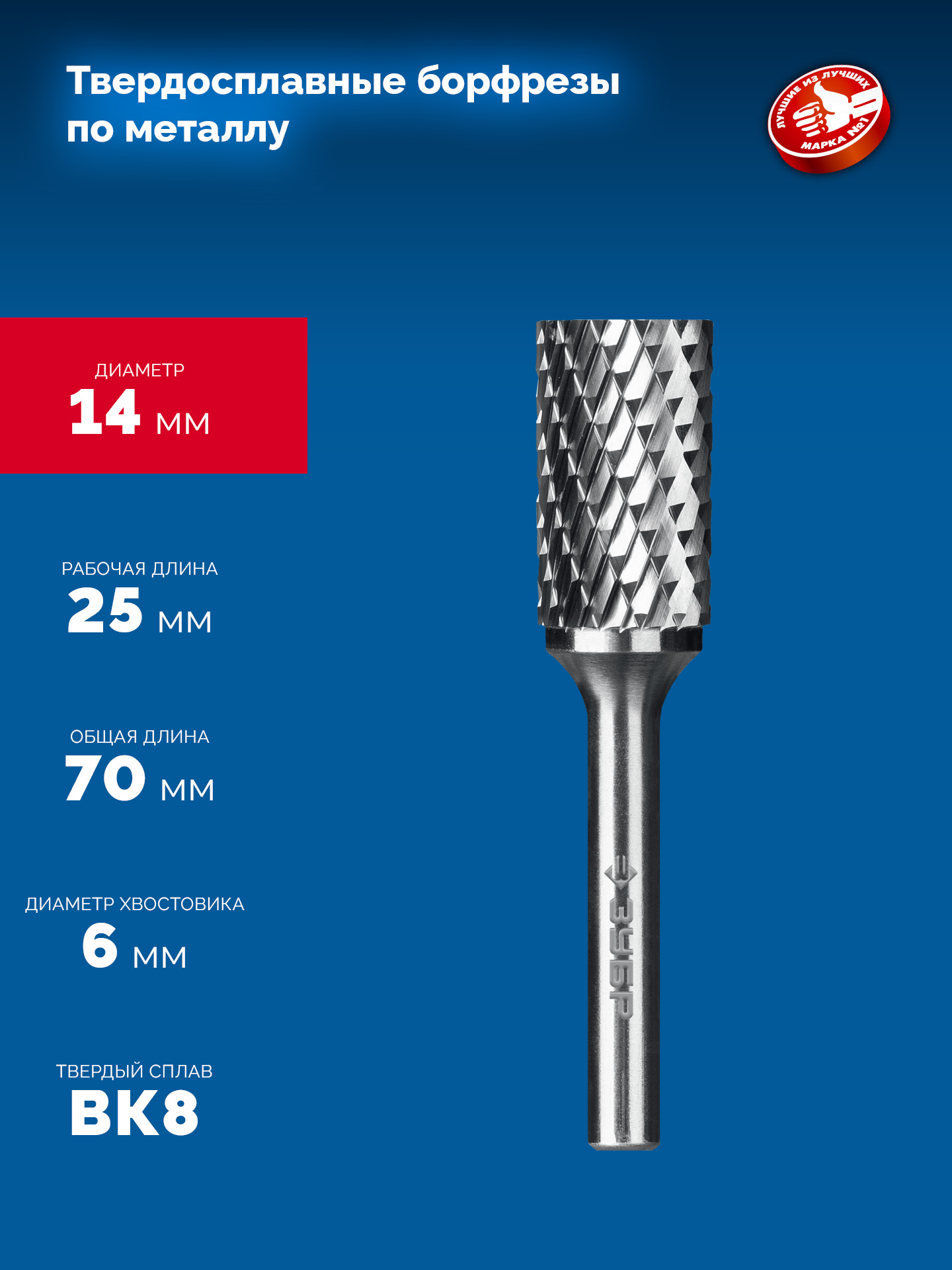 ЗУБР 14х25 мм, тип А (цилиндр с гладким торцом), хв-к 6 мм, твердосплавная борфреза, ПРОФЕССИОНАЛ (28800-14-25)