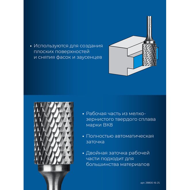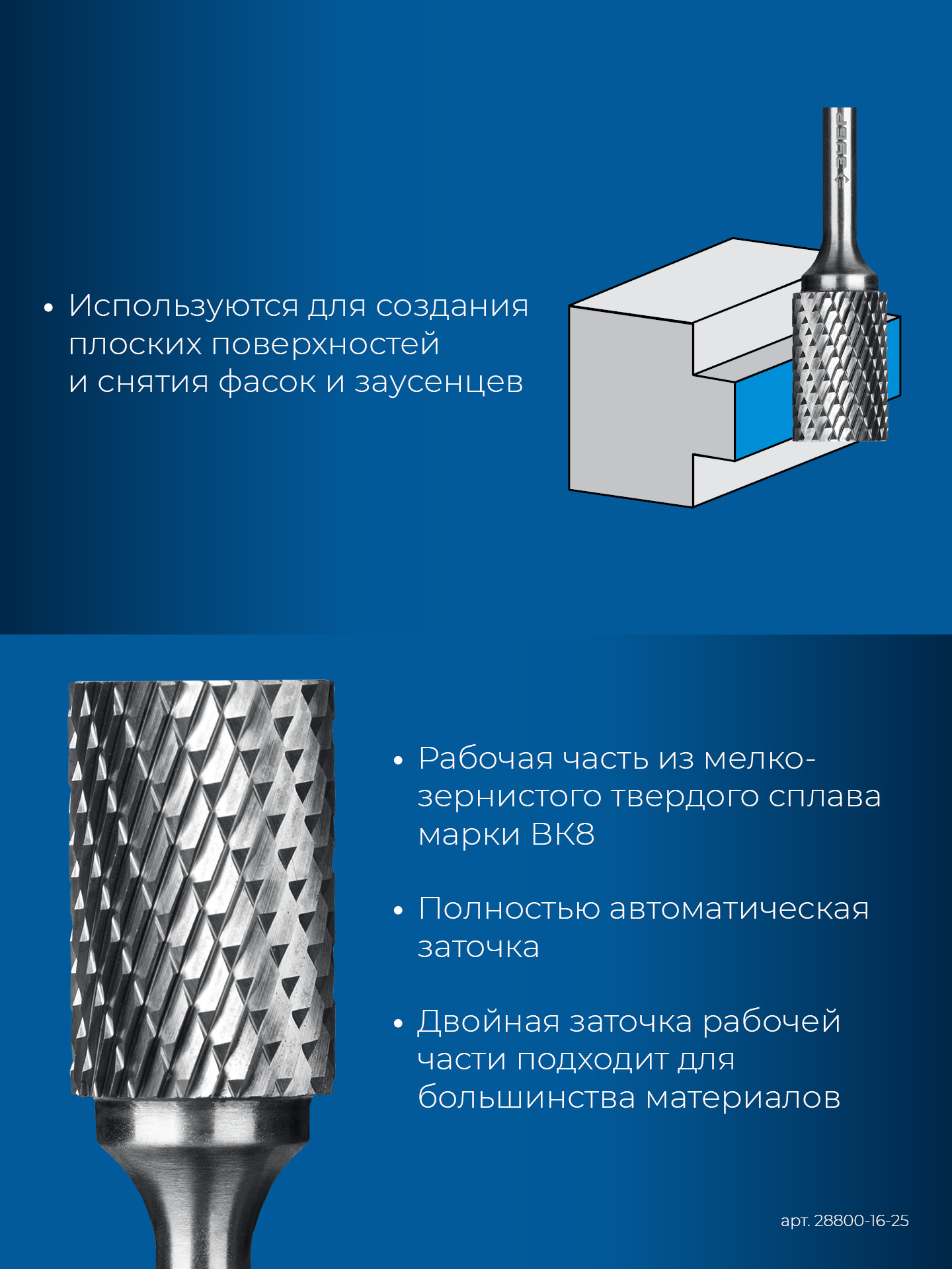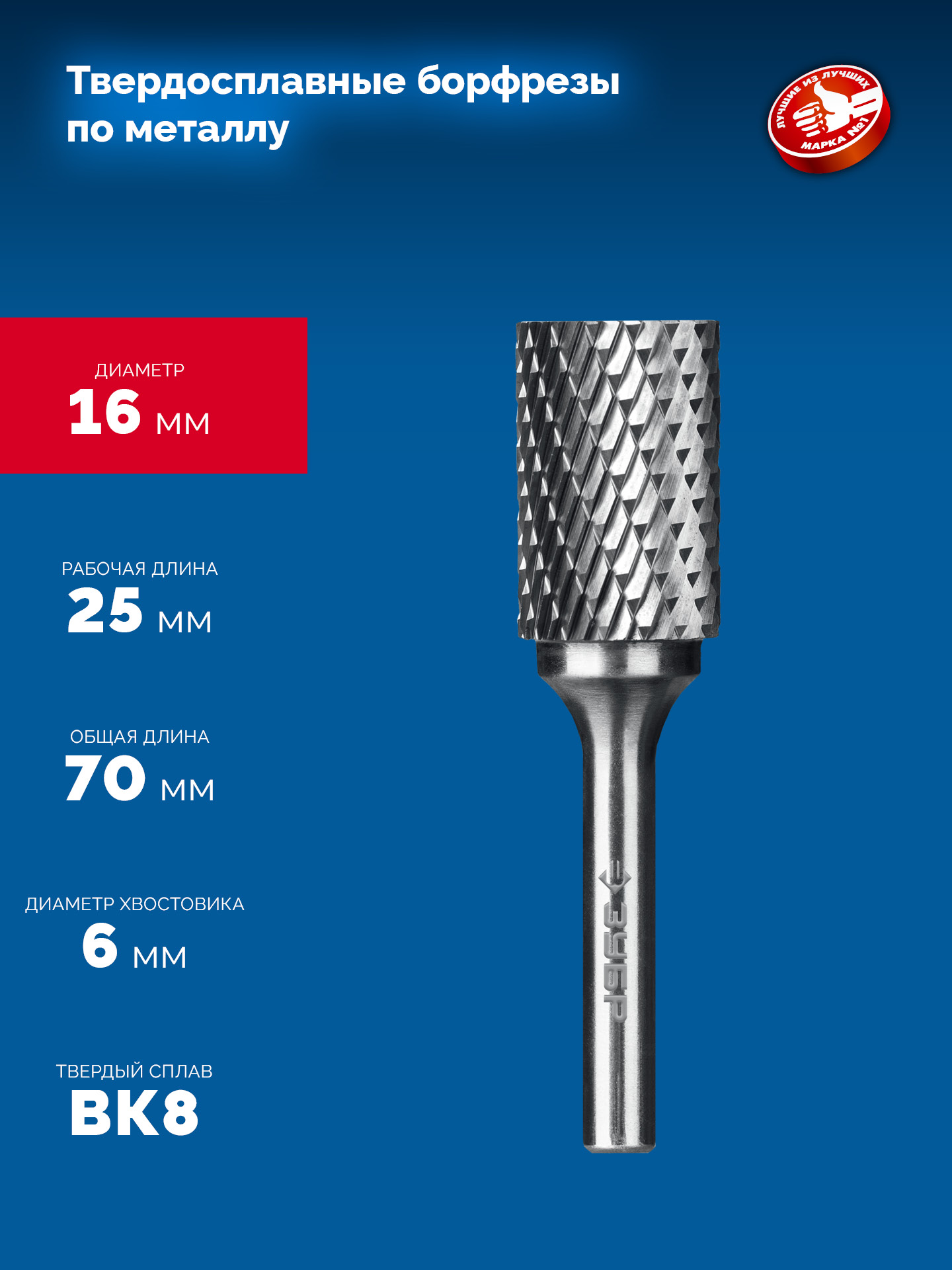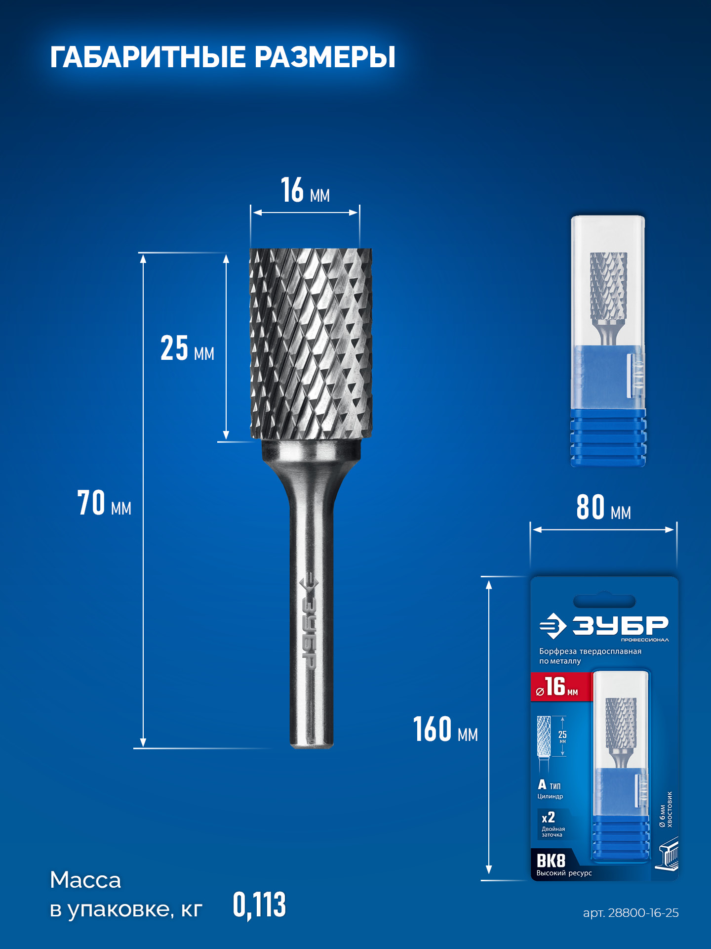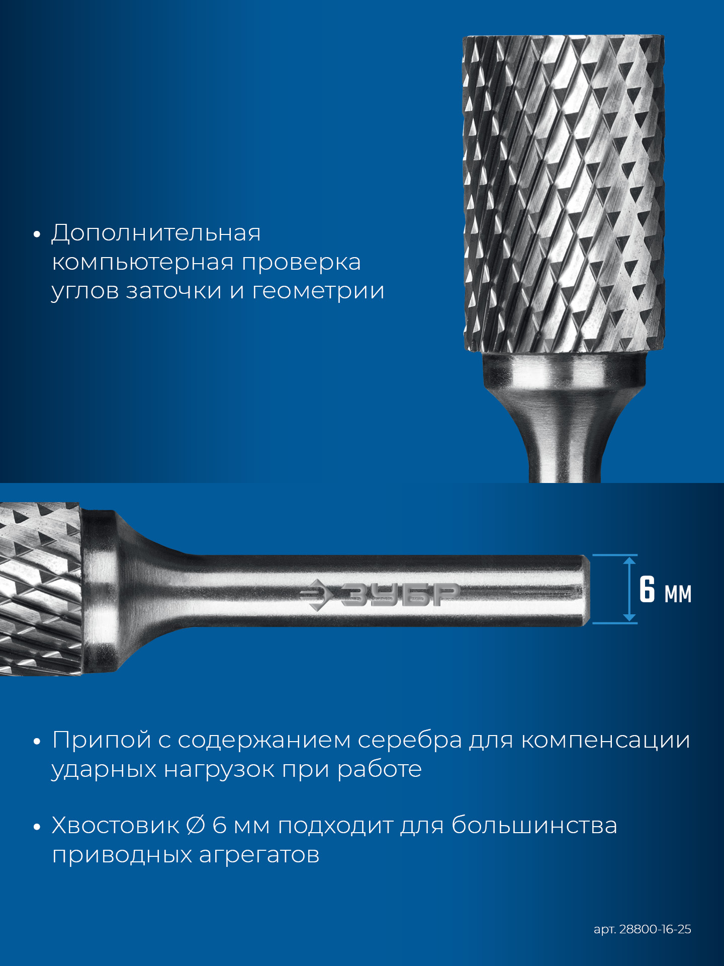 ЗУБР 16х25 мм, тип А (цилиндр с гладким торцом), хв-к 6 мм, твердосплавная борфреза, ПРОФЕССИОНАЛ (28800-16-25)