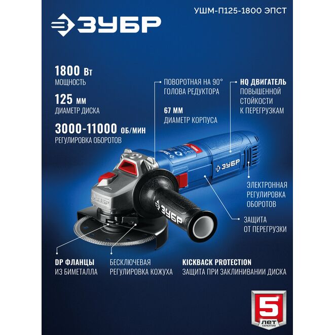 ЗУБР 1800 Вт, d125 мм, УШМ, регулировка оборотов, Профессионал (УШМ-П125-1800 ЭПСТ)