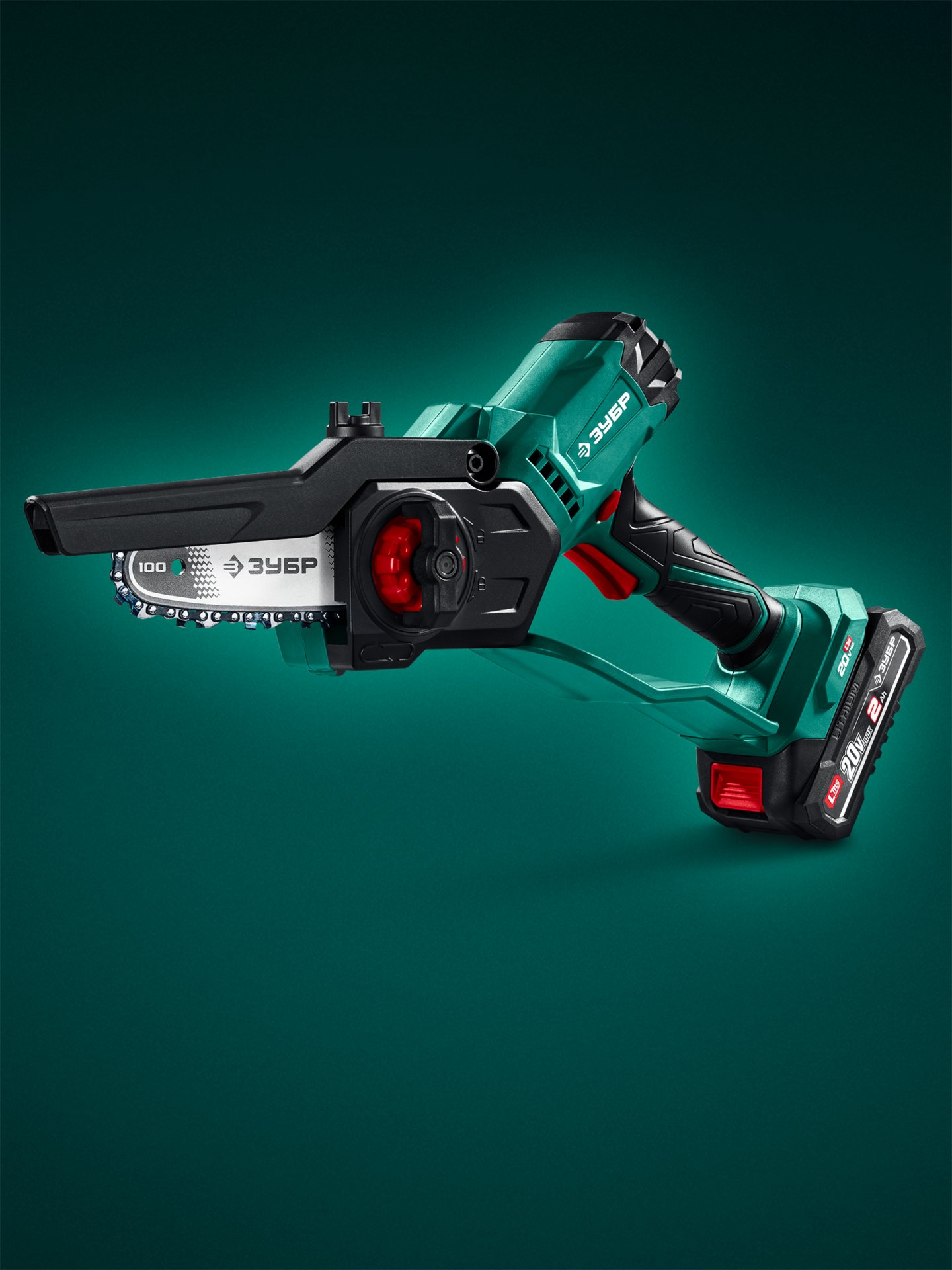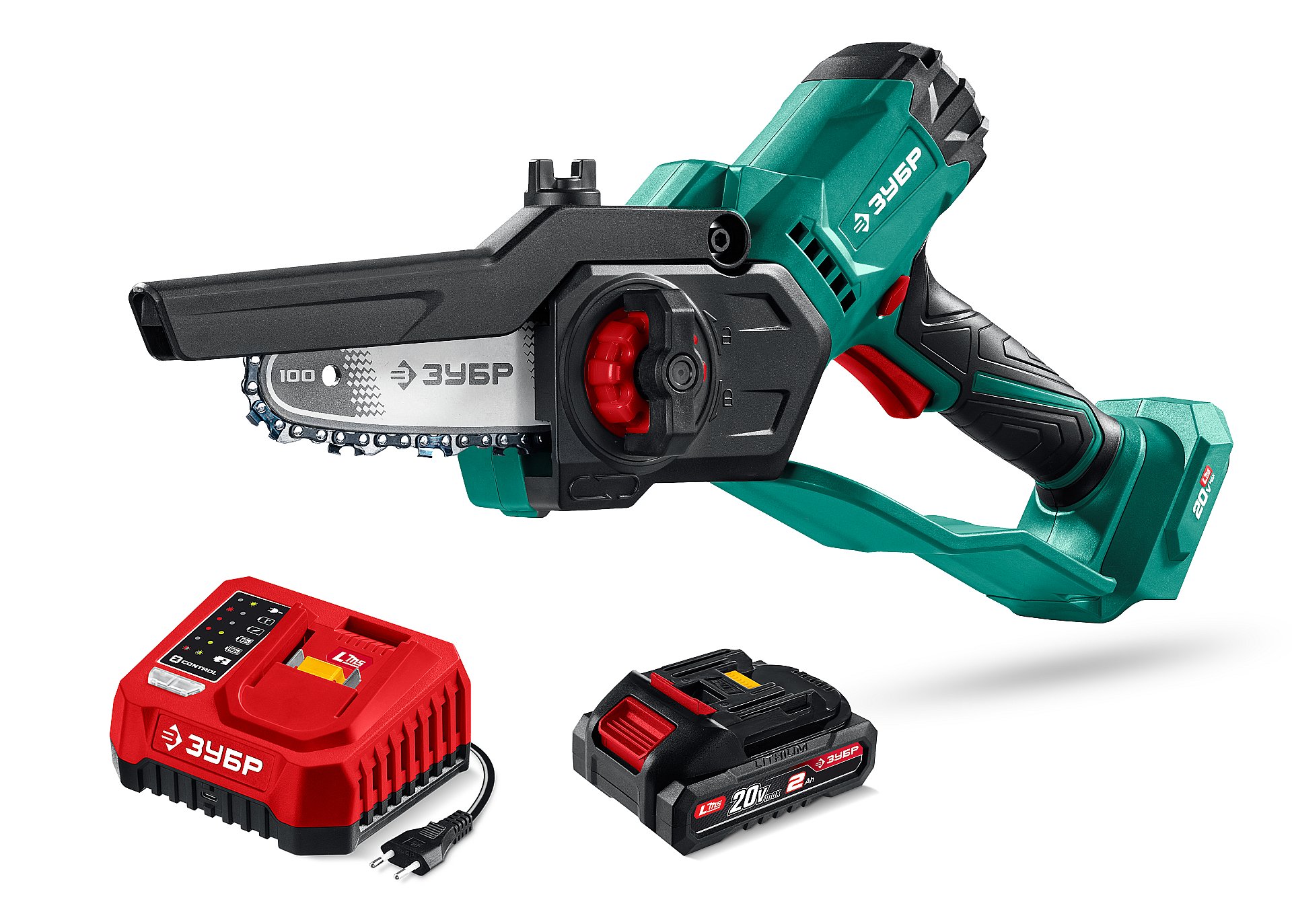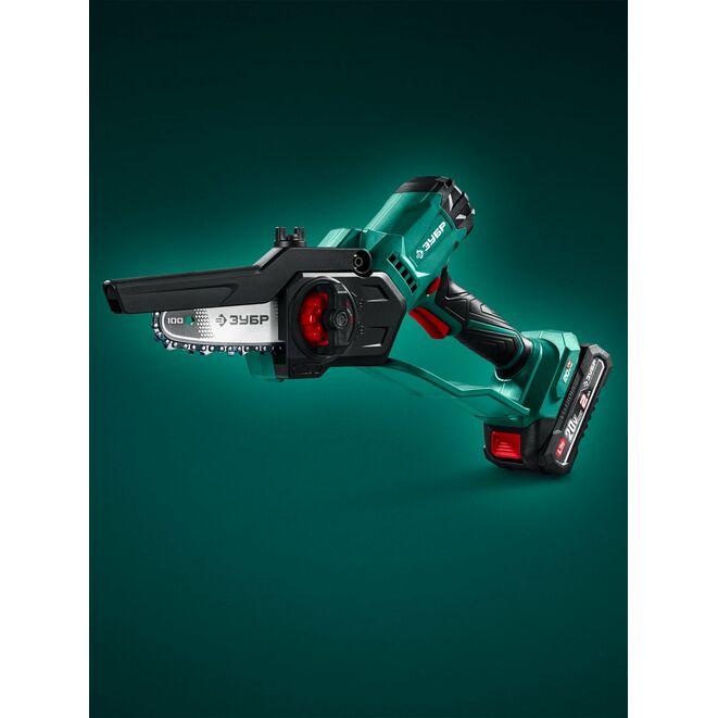 ЗУБР 20 В, 100 мм шина, 1 АКБ LMS (2 Ач), мини-пила цепная аккумуляторная (ПЦА-2010-21)