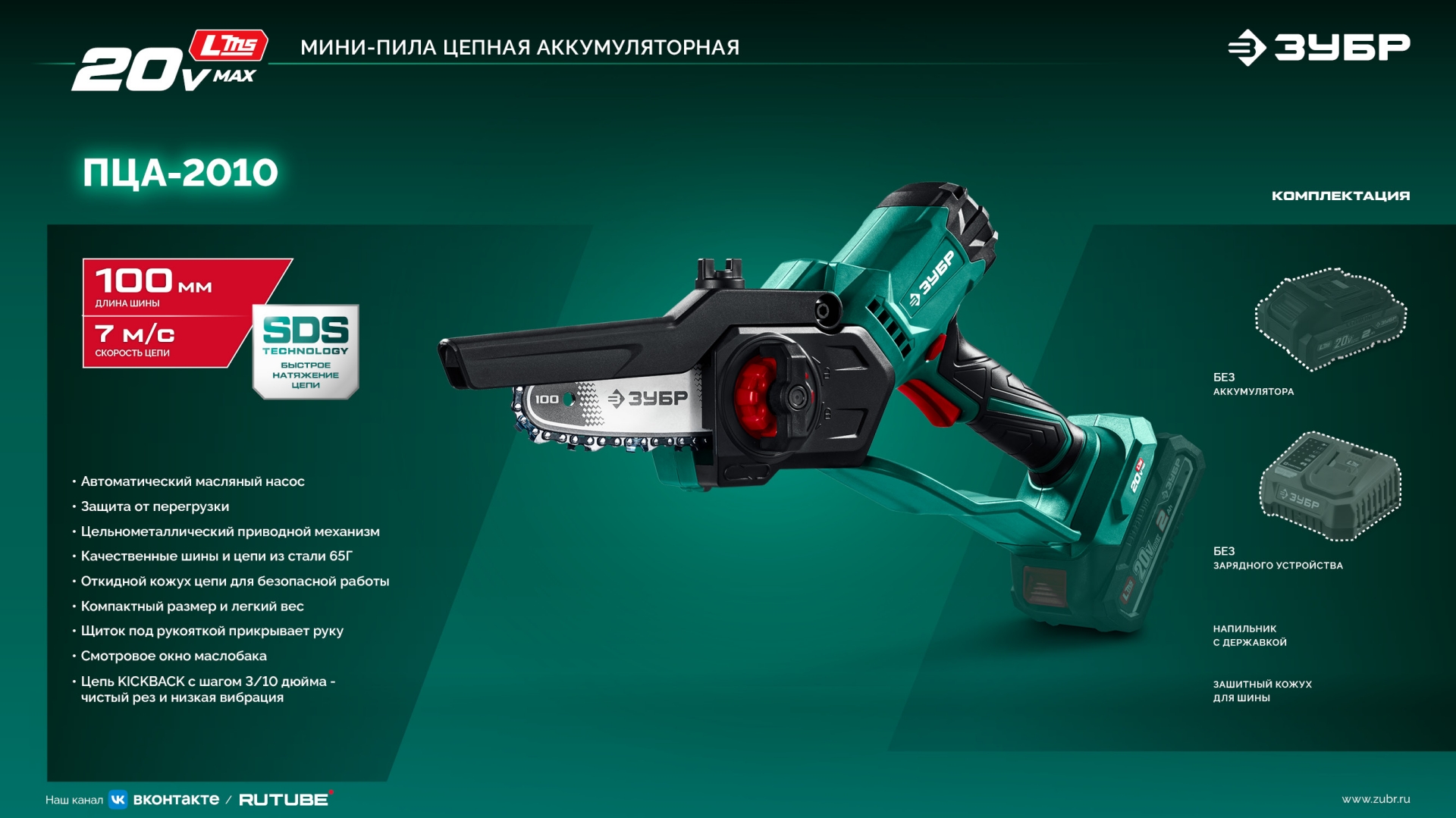 ЗУБР 20 В, 100 мм шина, без АКБ (LMS), мини-пила цепная аккумуляторная (ПЦА-2010)