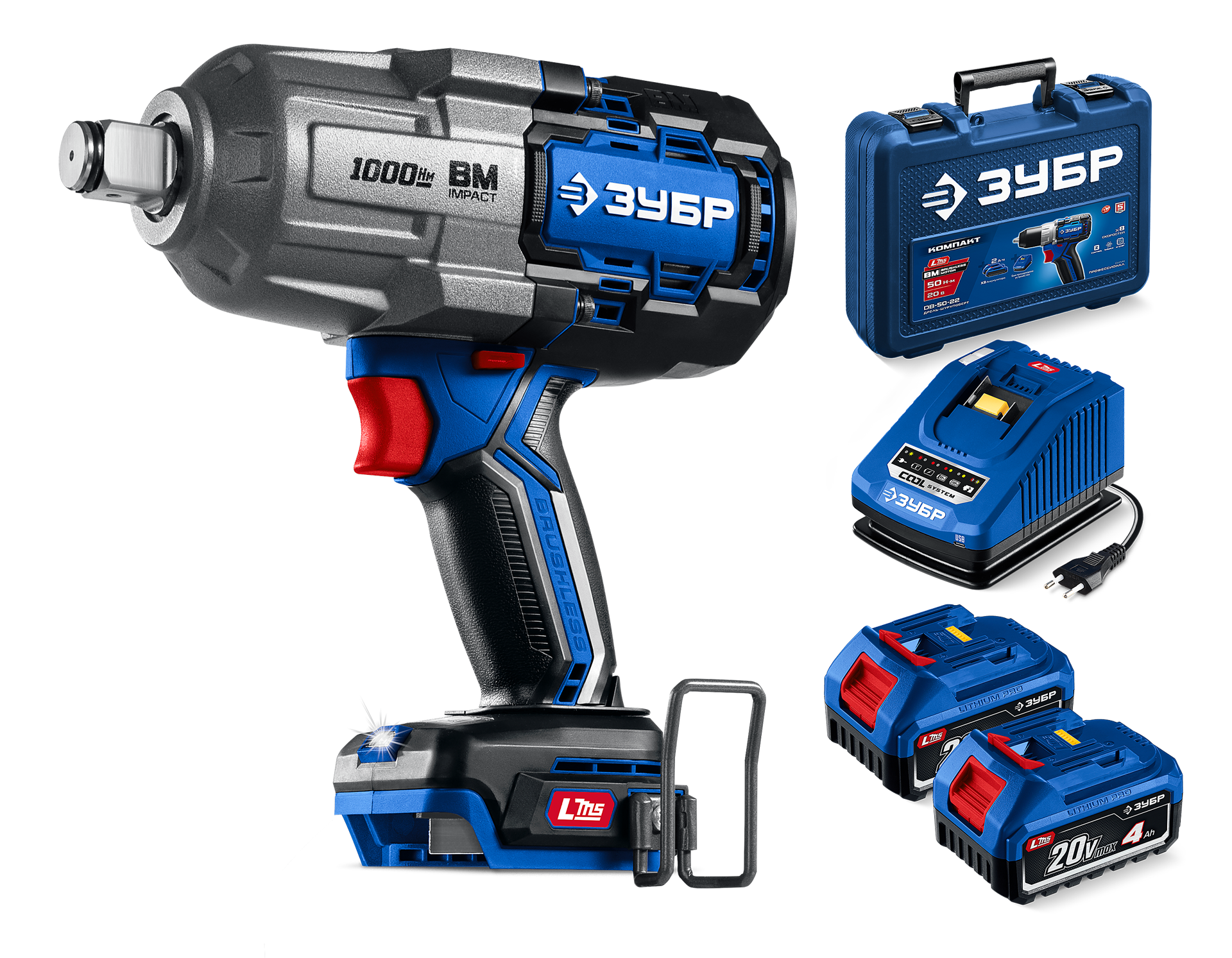 ЗУБР 20 В, 1000 Н·м, 2 АКБ L-MS (4 А·ч), бесщеточный ударный гайковерт, кейс, ПРОФЕССИОНАЛ (GB-1000-42)