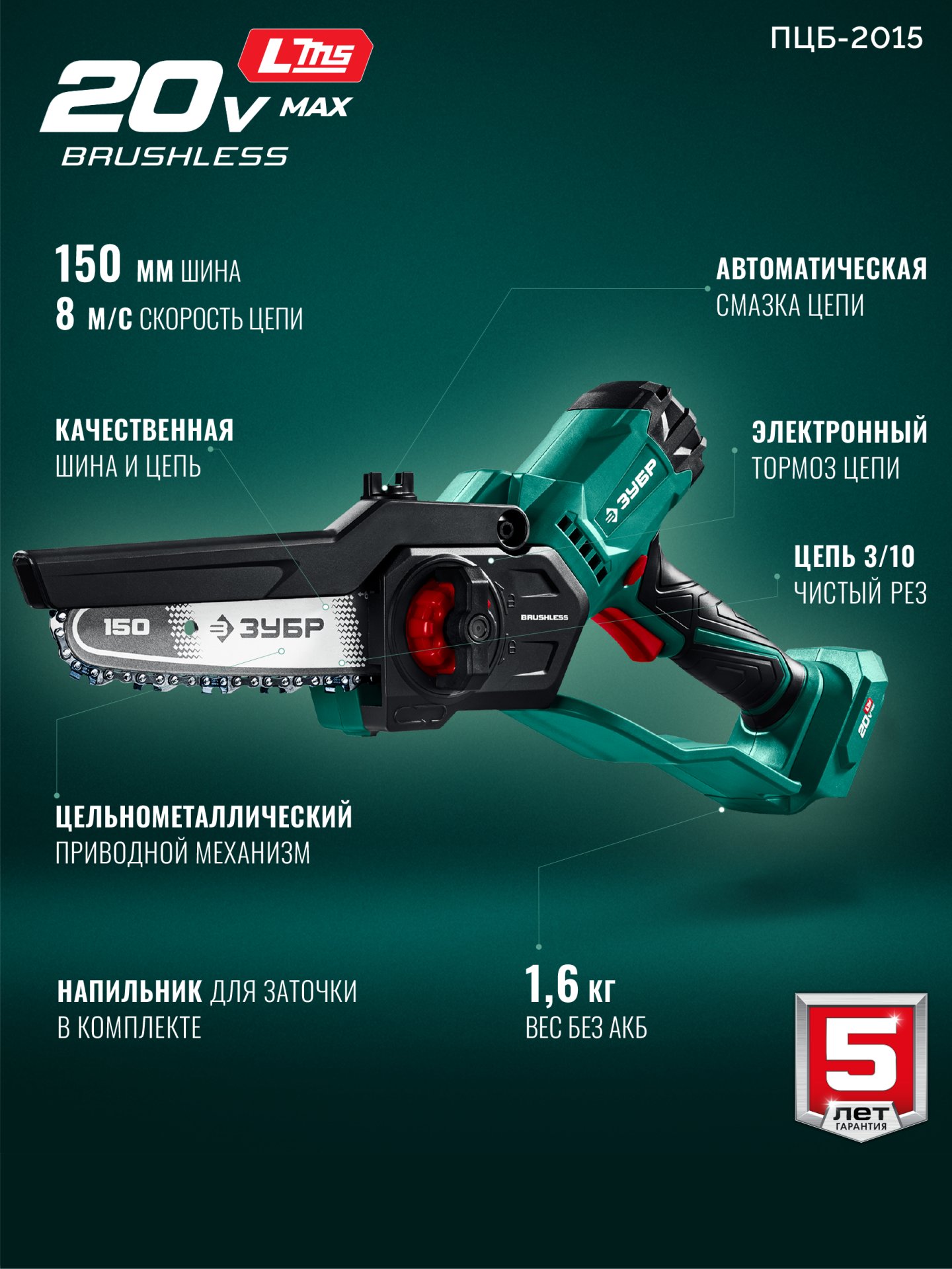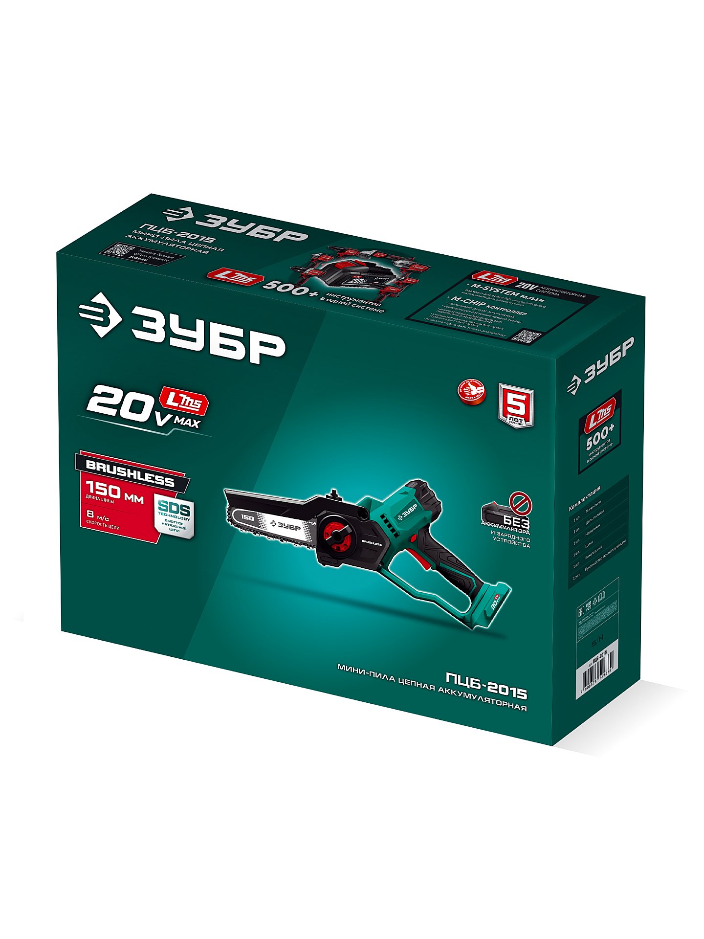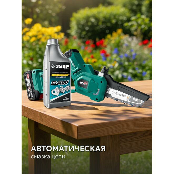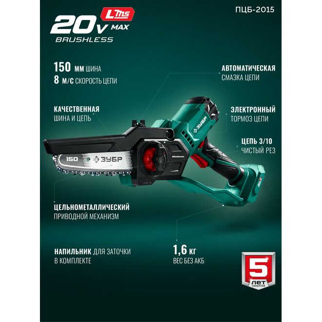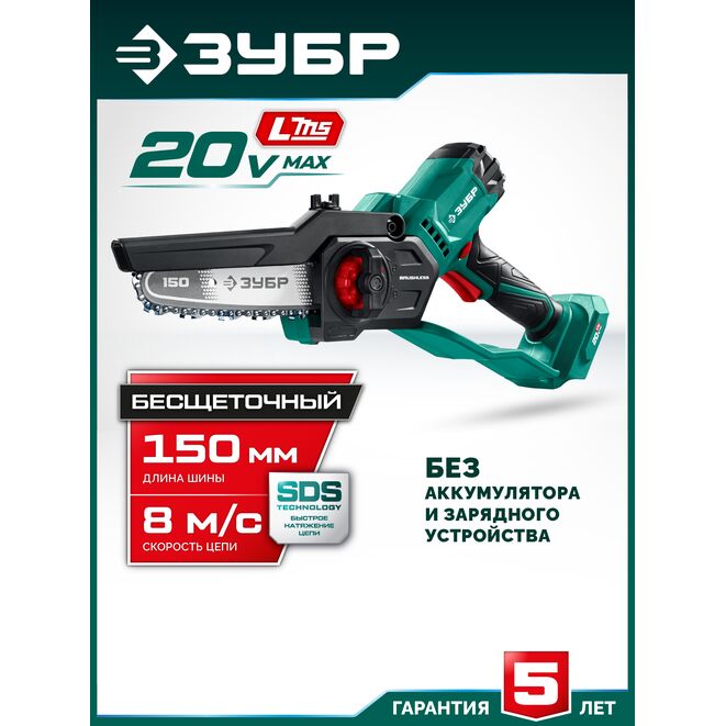 ЗУБР 20 В, 150 мм шина, без АКБ (LMS), мини-пила цепная аккумуляторная (ПЦБ-2015)