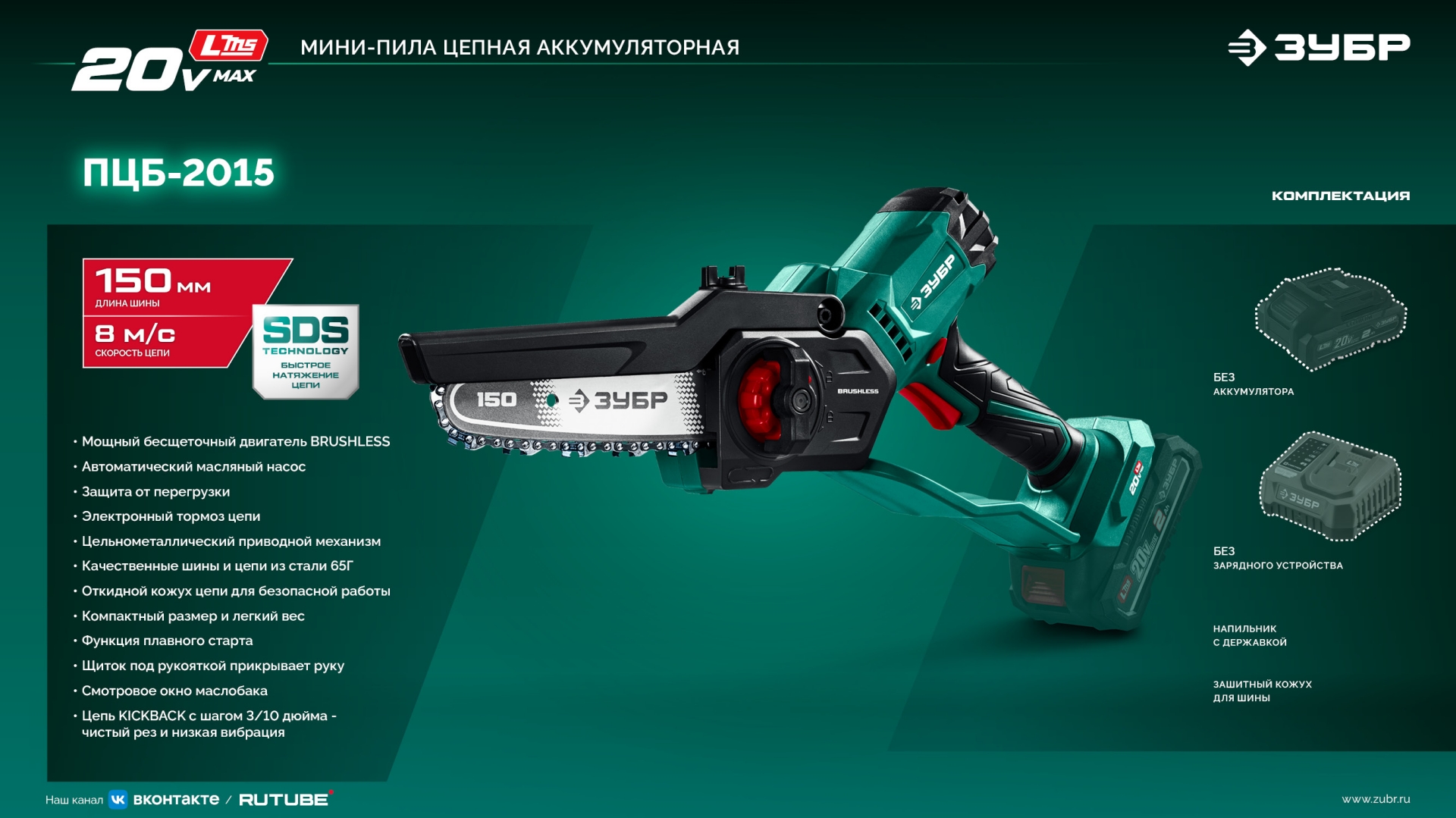 Принадлежности для ЗУБР 20 В, 150 мм шина, без АКБ (LMS), мини-пила цепная аккумуляторная (ПЦБ-2015):