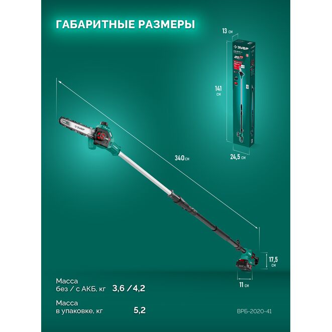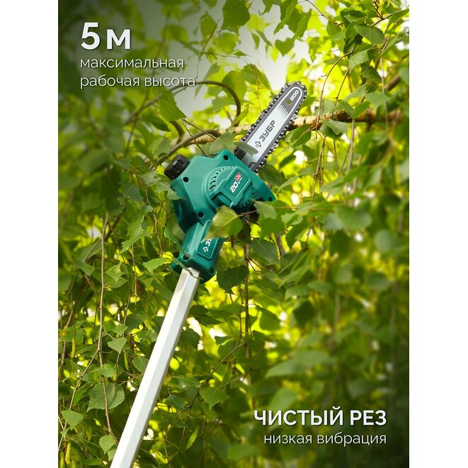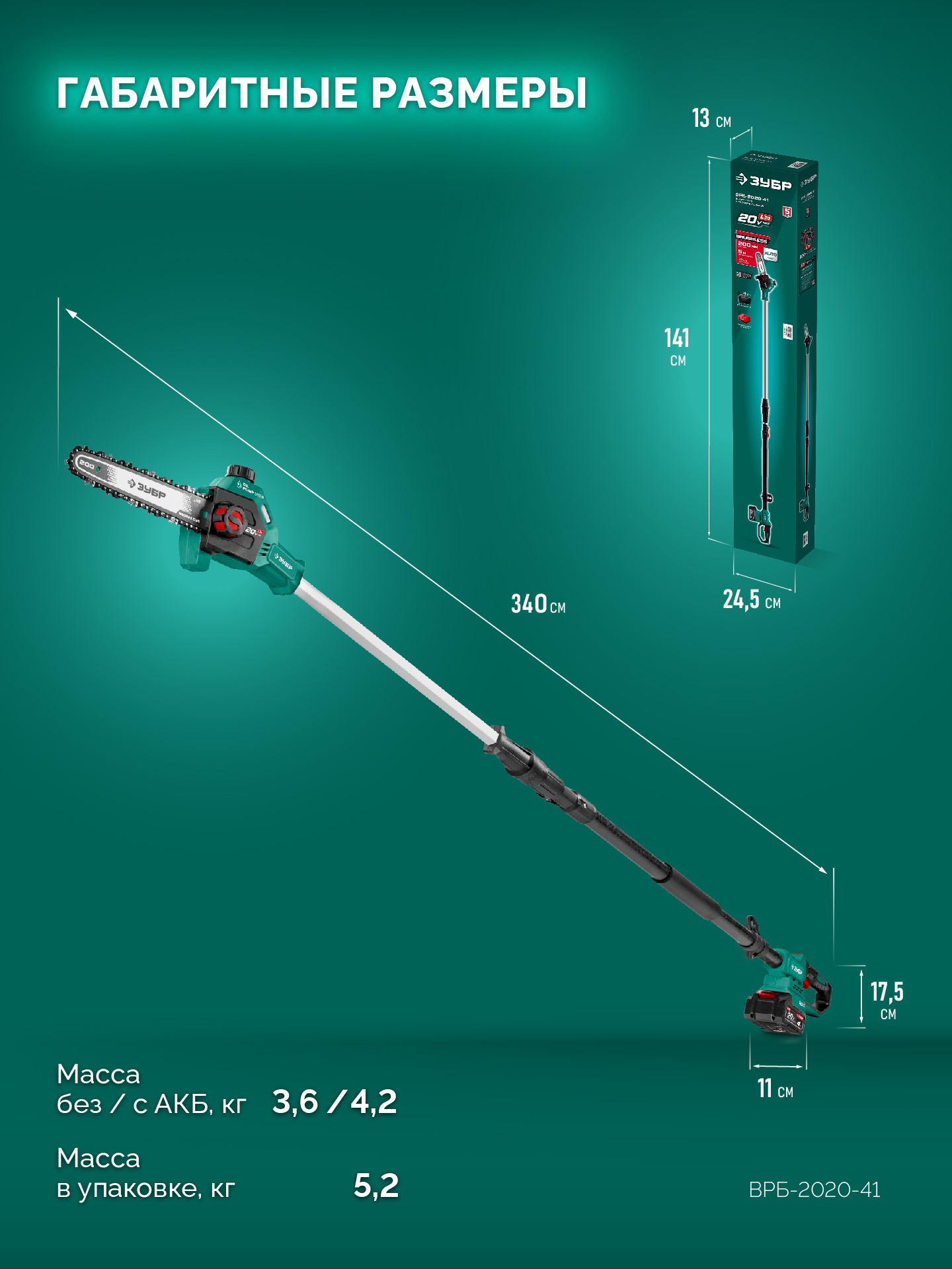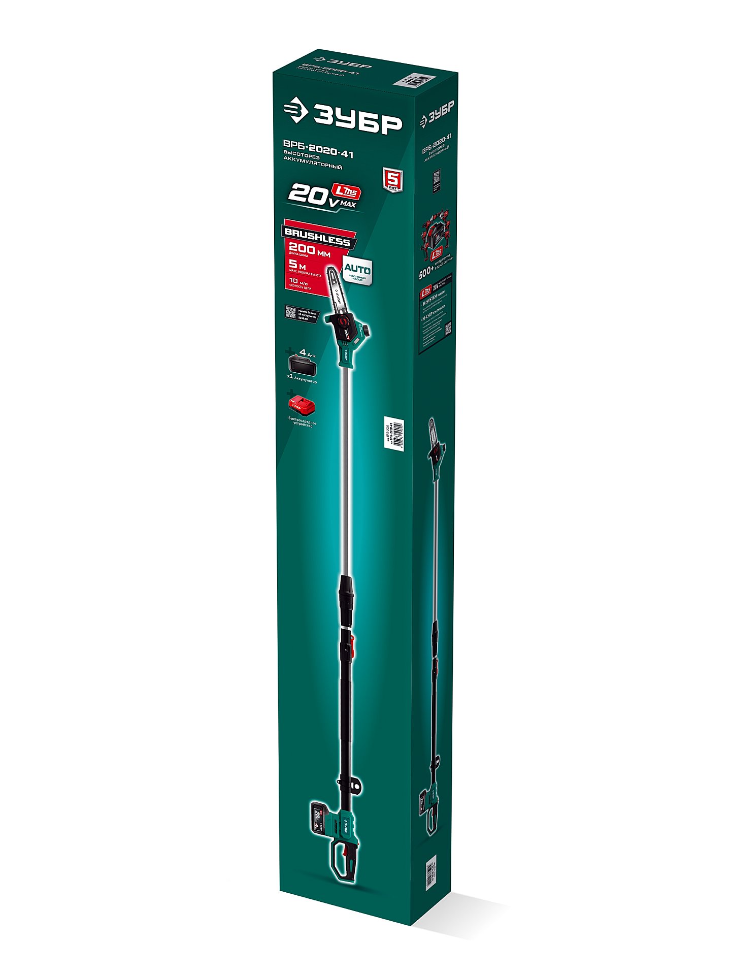 Высоторез аккумуляторный ЗУБР ВРБ-2020-41, предназначен для пиления веток, стволов различных пород дерева, обрезки сучьев и ухода за садовыми деревьями (с приводом режущего инструмента от электрического двигателя).Характеристики ЗУБР ВРБ-2020-41: