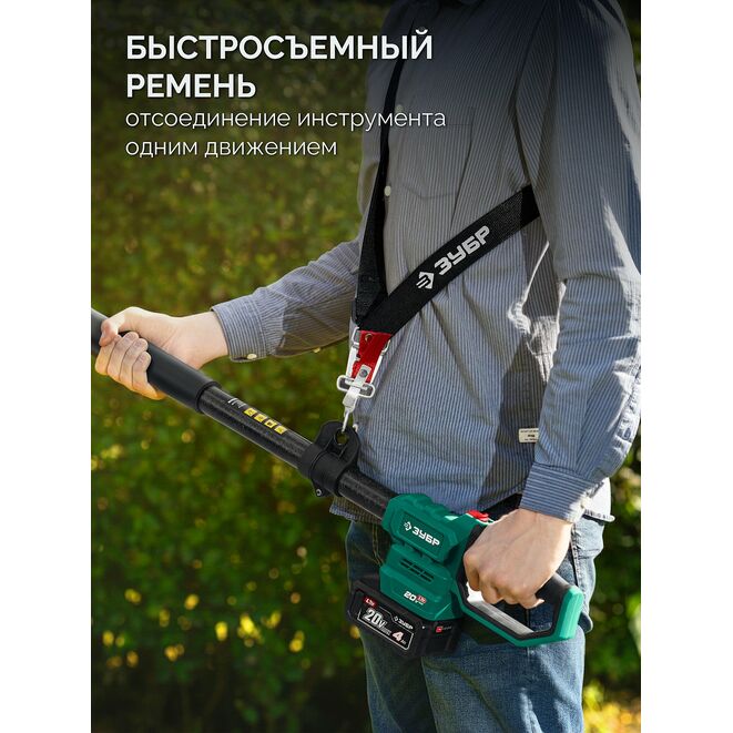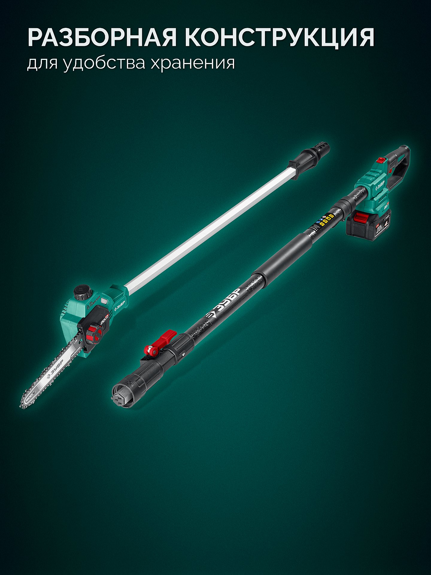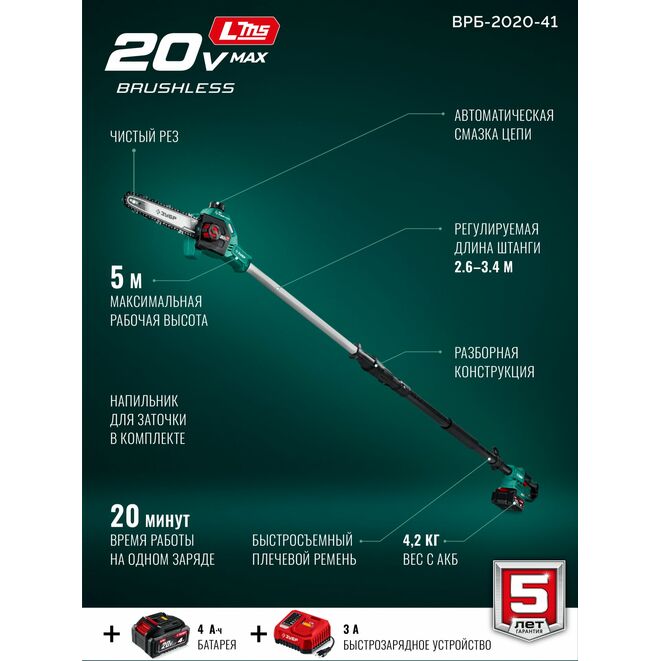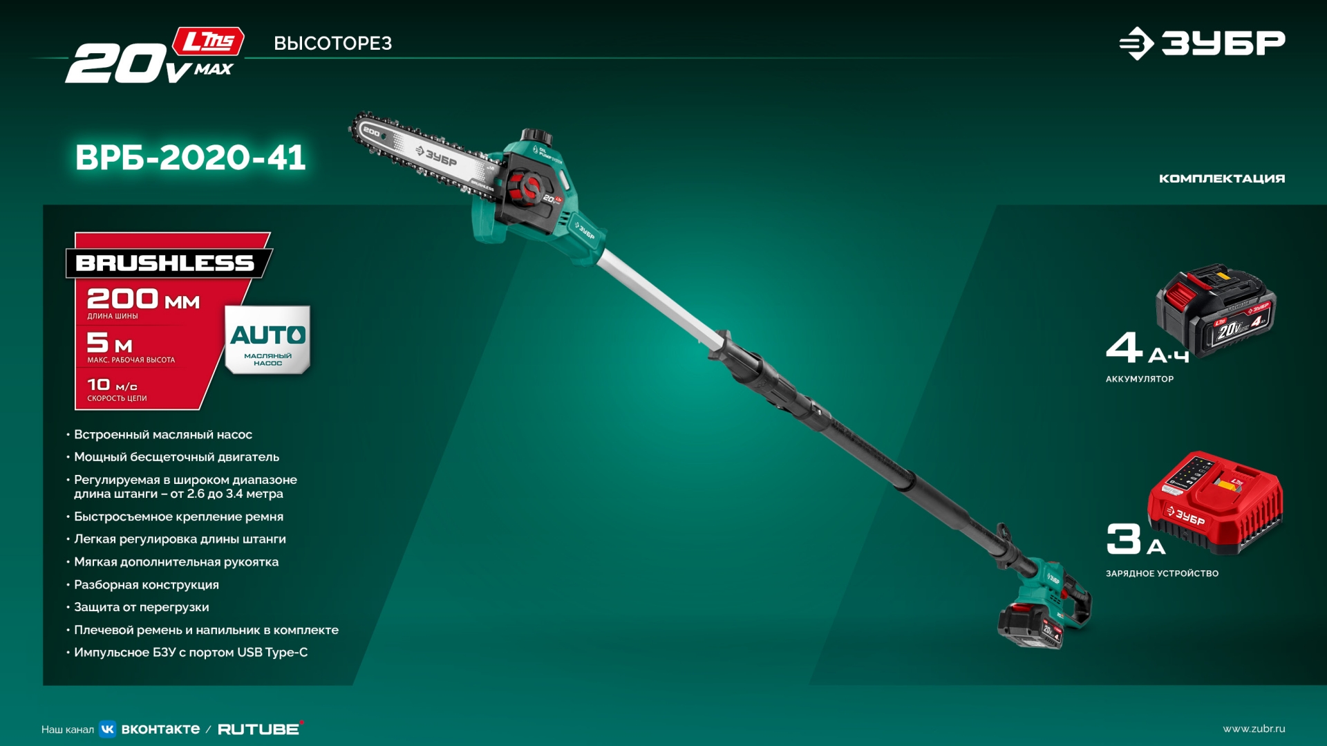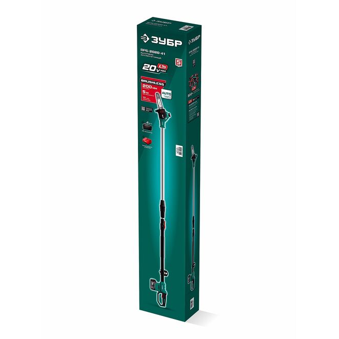 Высоторез аккумуляторный ЗУБР ВРБ-2020-41, предназначен для пиления веток, стволов различных пород дерева, обрезки сучьев и ухода за садовыми деревьями (с приводом режущего инструмента от электрического двигателя).Характеристики ЗУБР ВРБ-2020-41: