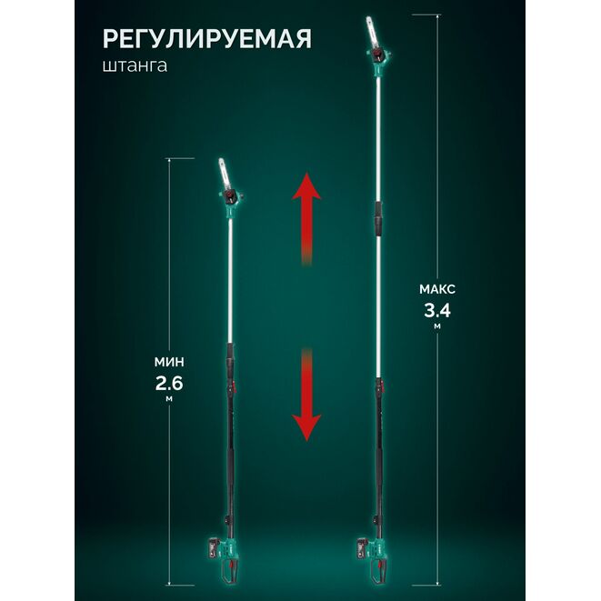 Удобная рукоятка обеспечивает надежный хват и контроль, что позволяет выполнять задачи с максимальной точностью. Телескопическая штанга высотореза облегчает его хранение.