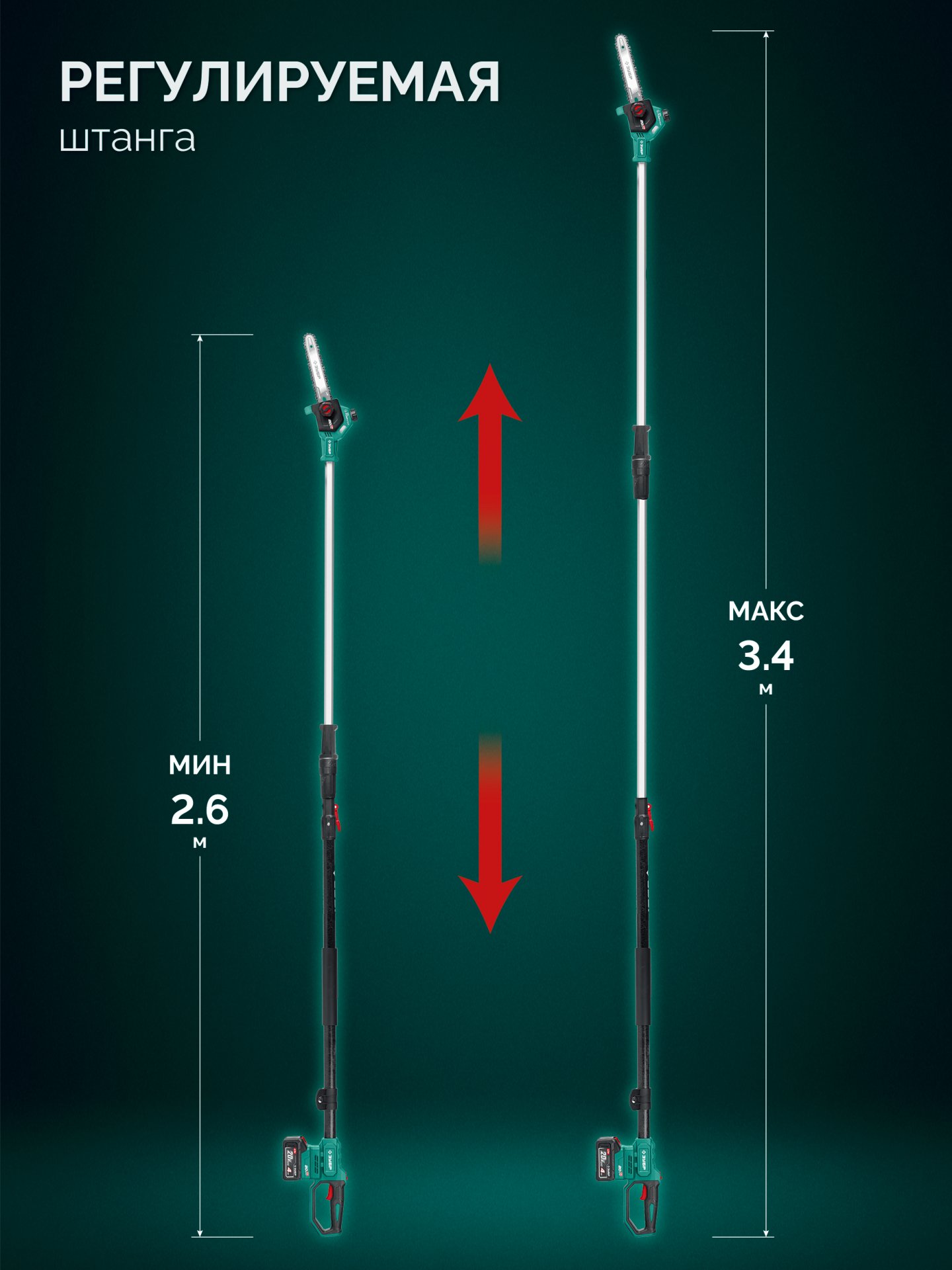 Удобная рукоятка обеспечивает надежный хват и контроль, что позволяет выполнять задачи с максимальной точностью. Телескопическая штанга высотореза облегчает его хранение.