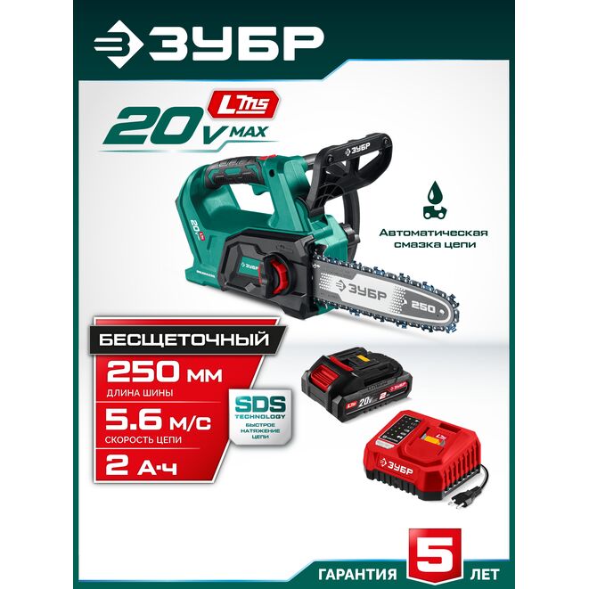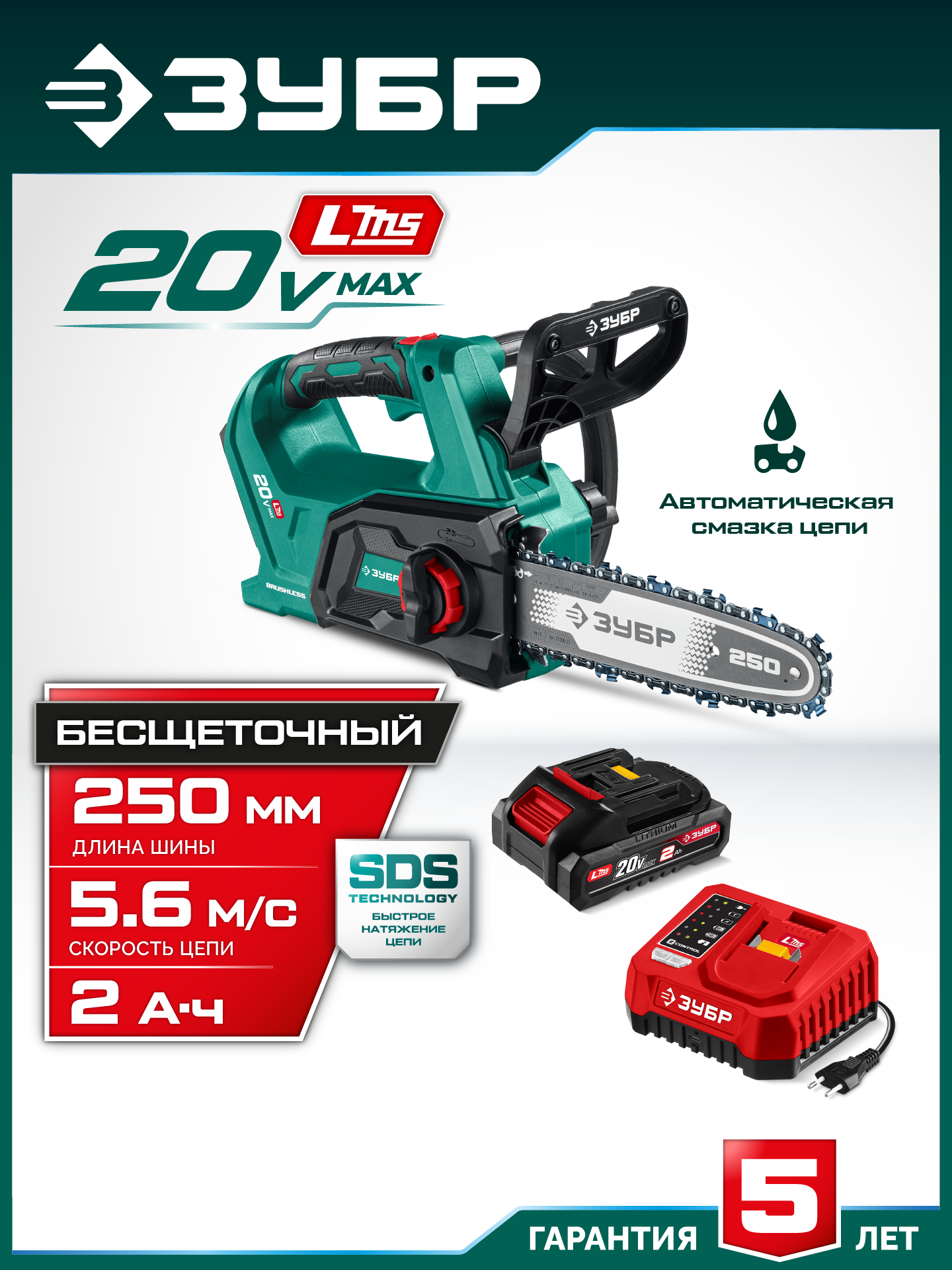 ЗУБР 20 В, 250 мм шина, 1 АКБ LMS (2 Ач), пила цепная аккумуляторная (ПЦБ-2025-21)