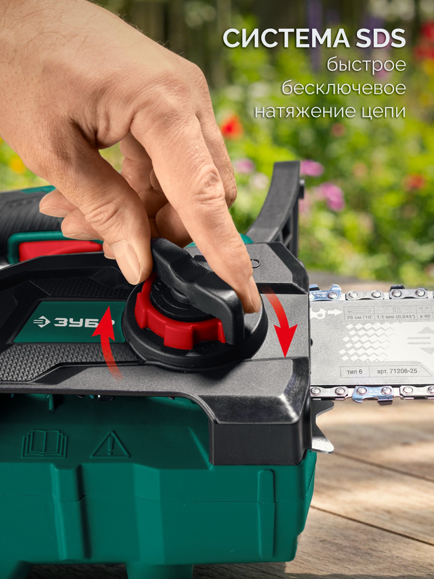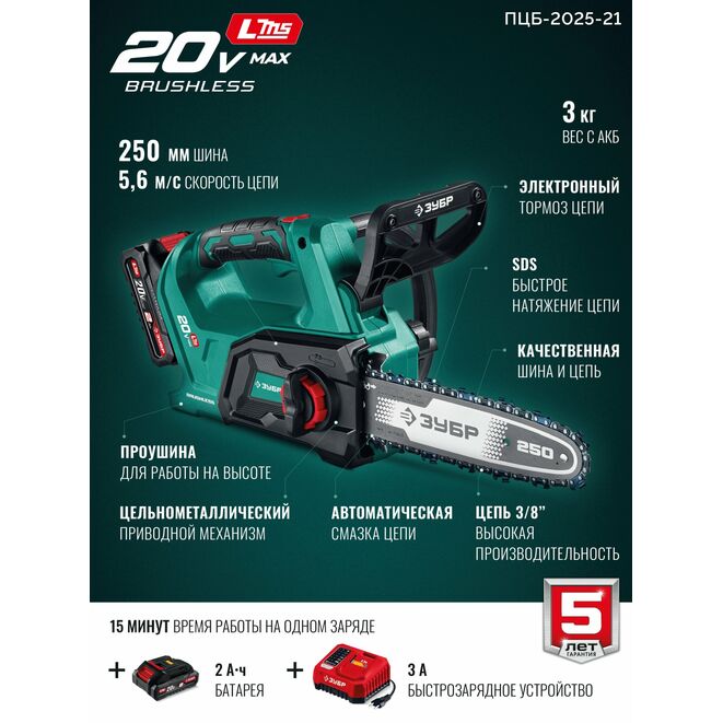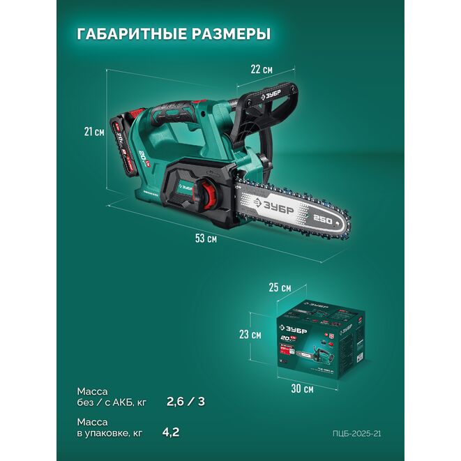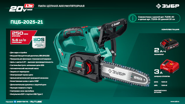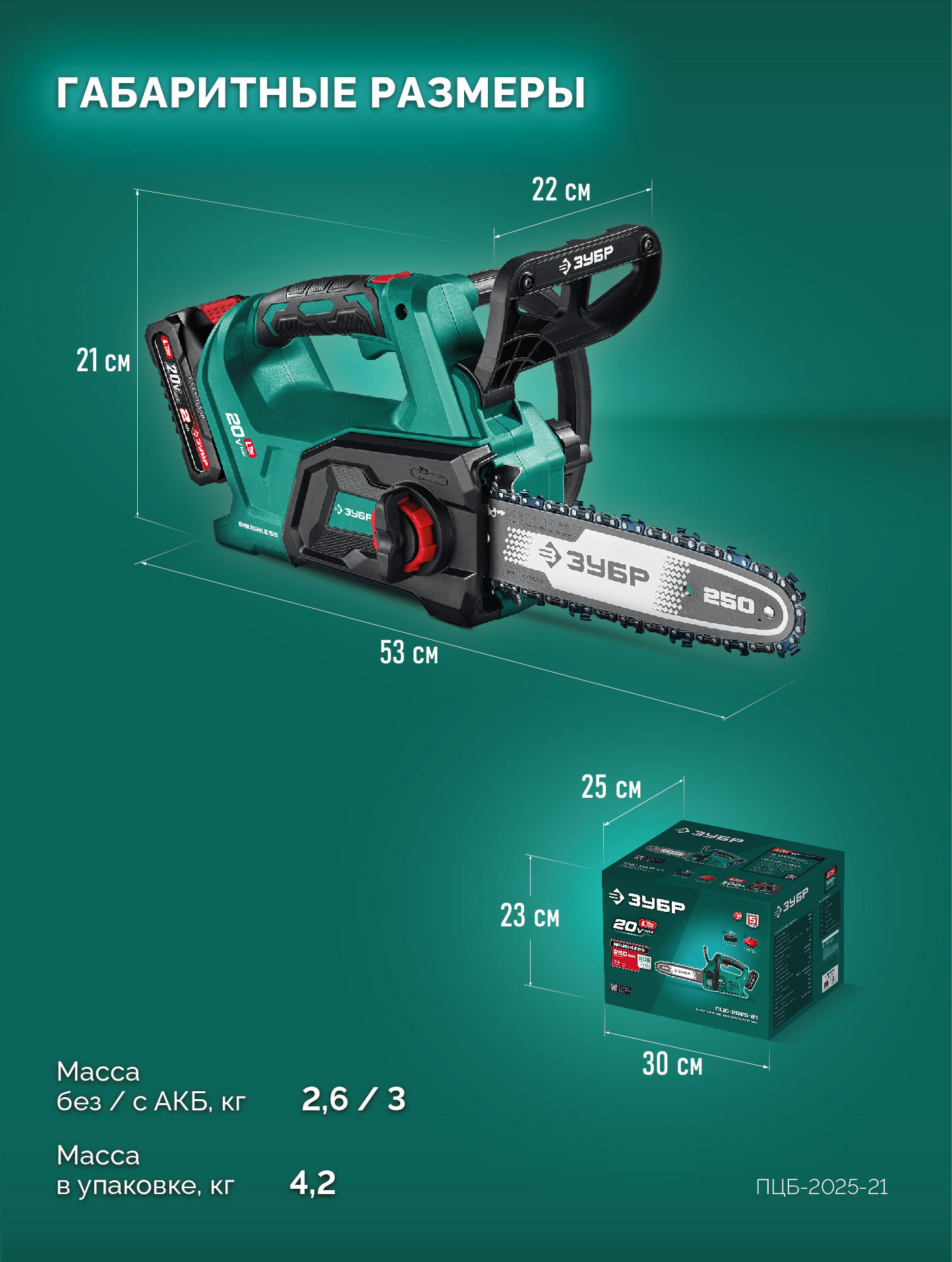 Аккумуляторная цепная пила ЗУБР ПЦБ-2025-21, предназначена для пиления досок, бруса, стволов различных пород дерева, обрезки сучьев и ухода за садовыми деревьями (с приводом режущего инструмента от электрического двигателя).Характеристики ЗУБР ПЦБ-2025-21: