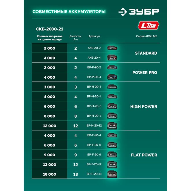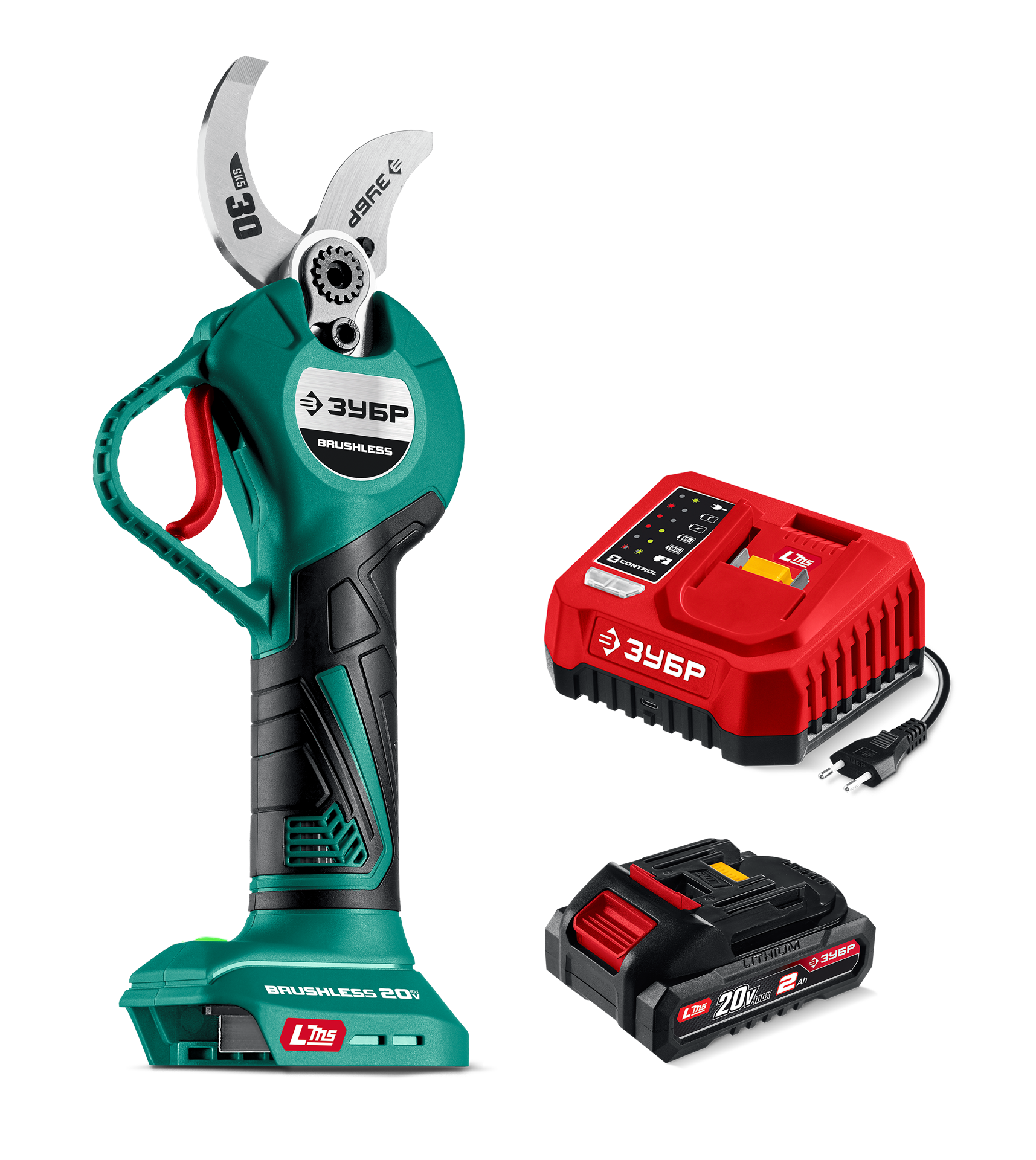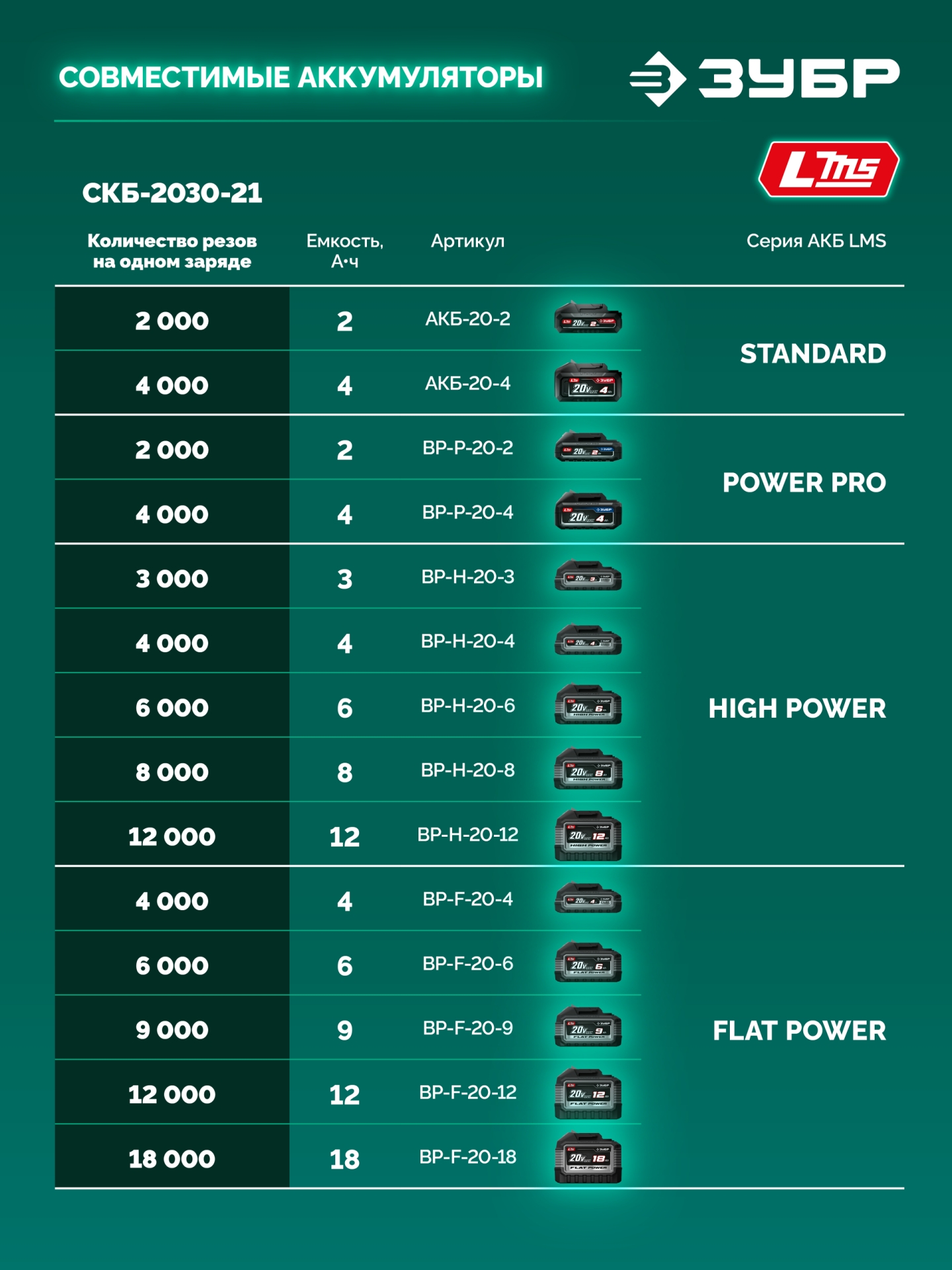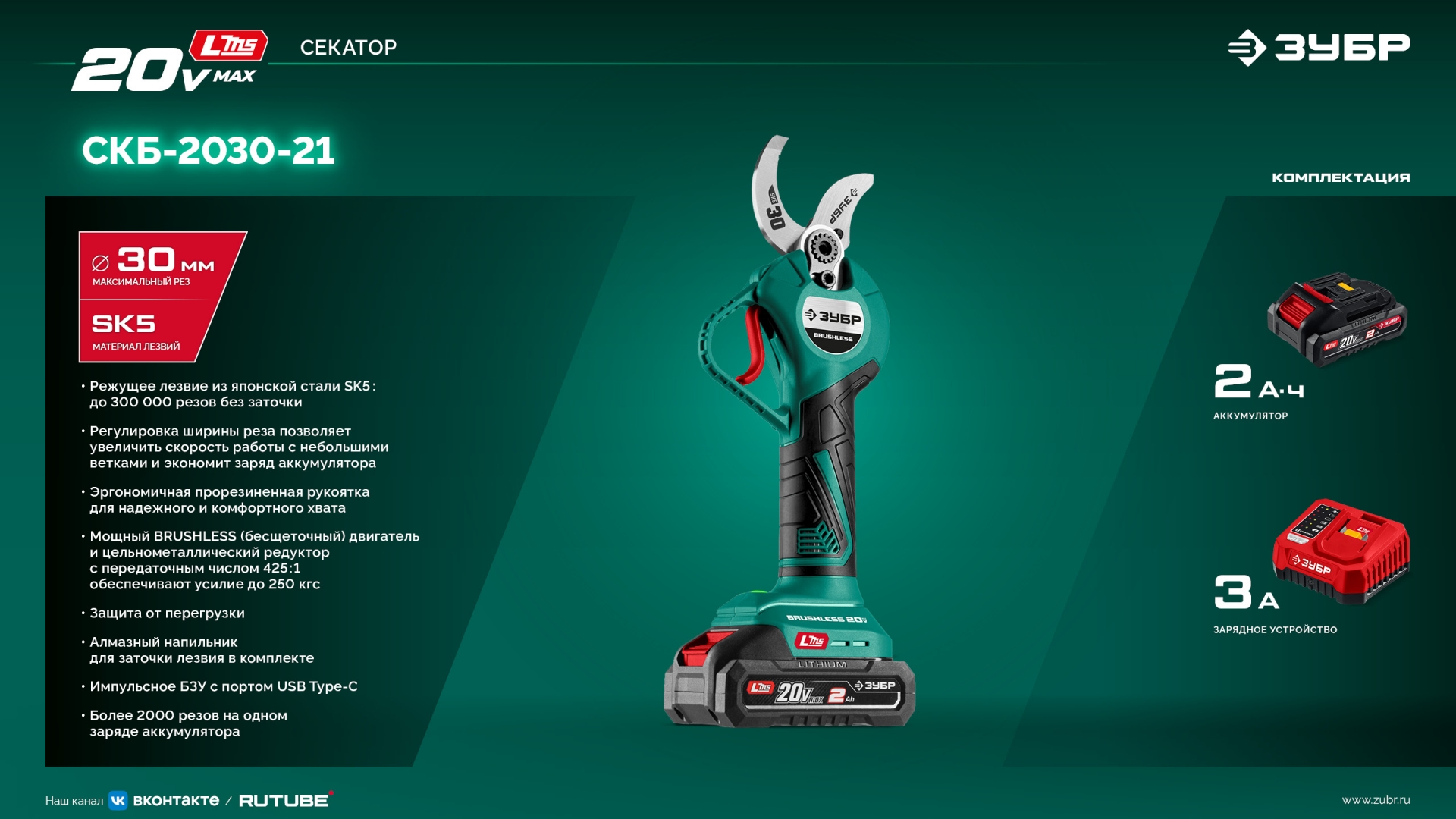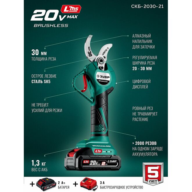 Принадлежности для ЗУБР 20 В, 30 мм макс. рез, 1 АКБ LMS (2 Ач), секатор аккумуляторный (СКБ-2030-21):