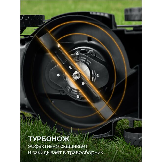 - ТурбоНож создаёт мощный поток воздуха, который поднимает полегшую траву для ровного скашивания и полностью собирает всю скошенную массу и листву