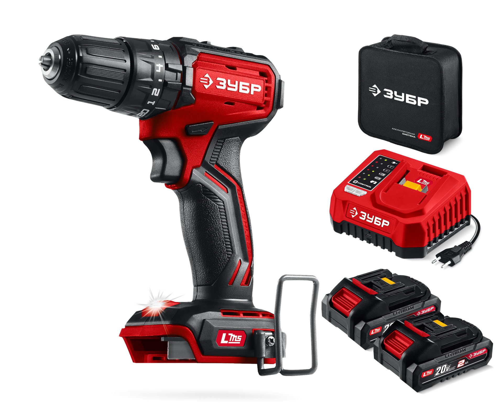 ЗУБР 20 В, 45 Н·м, 2 АКБ LMS (2 А·ч), бесщеточная ударная дрель-шуруповерт, сумка (ДБУ-45-22)