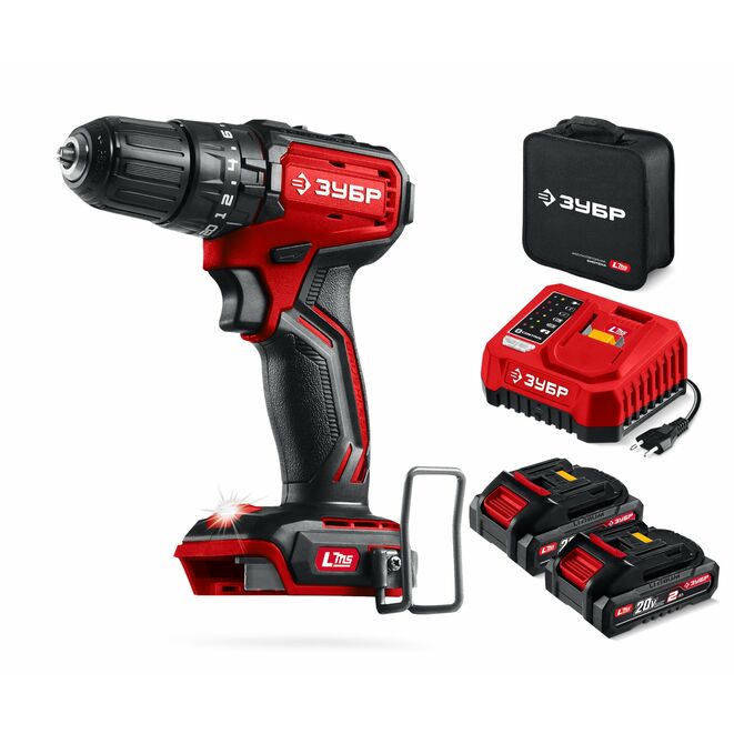 Принадлежности для ЗУБР 20 В, 45 Н·м, 2 АКБ LMS (2 А·ч), бесщеточная ударная дрель-шуруповерт, сумка (ДБУ-45-22):
