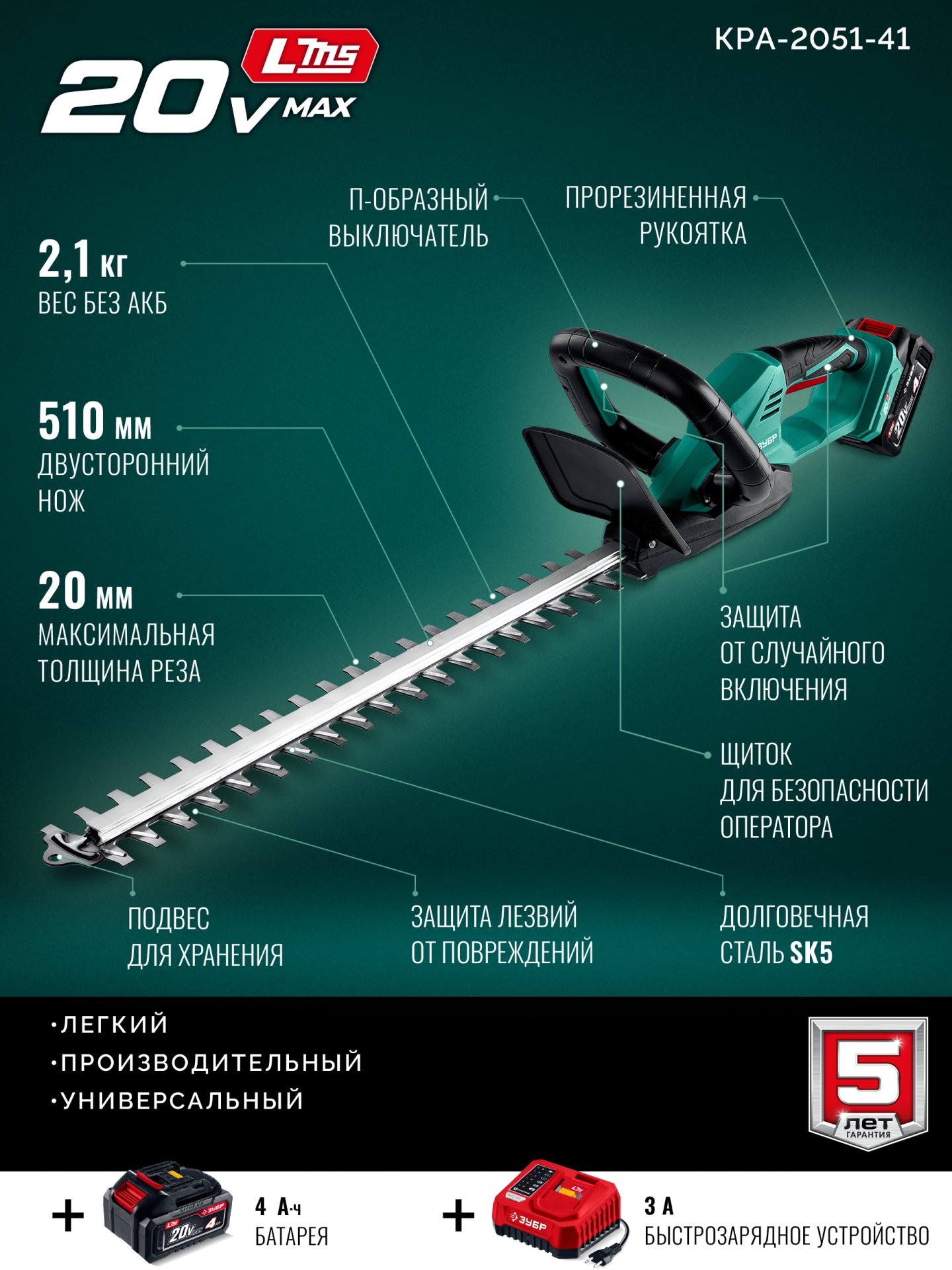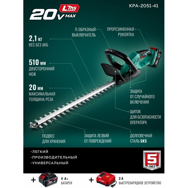 ЗУБР 20 В, 510 мм, 1 АКБ LMS (4 Ач), кусторез аккумуляторный (КРА-2051-41)