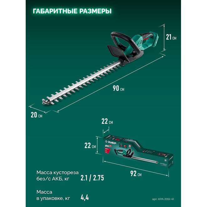 Кусторез аккумуляторный ЗУБР КРА-2051-41 предназначен для обрезки ветвей кустарников, формирования живой изгороди, расчистки зарослей, создания дизайнерских композиций из растений на садовых и парковых участках. Мощный двигатель и прочные лезвия с лазерной заточкой обеспечивают быструю работу и долгий срок службы инструмента. Работа от аккумулятора позволяет свободно перемещаться по участку.Характеристики ЗУБР КРА-2051-41: