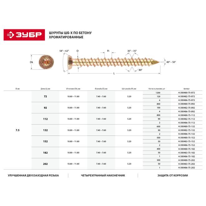 ЗУБР 202 х 7.5 мм, 50 шт., ШБ-Х шурупы по бетону 4-300483-75-202 Профессионал