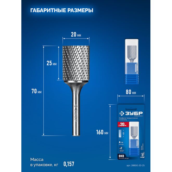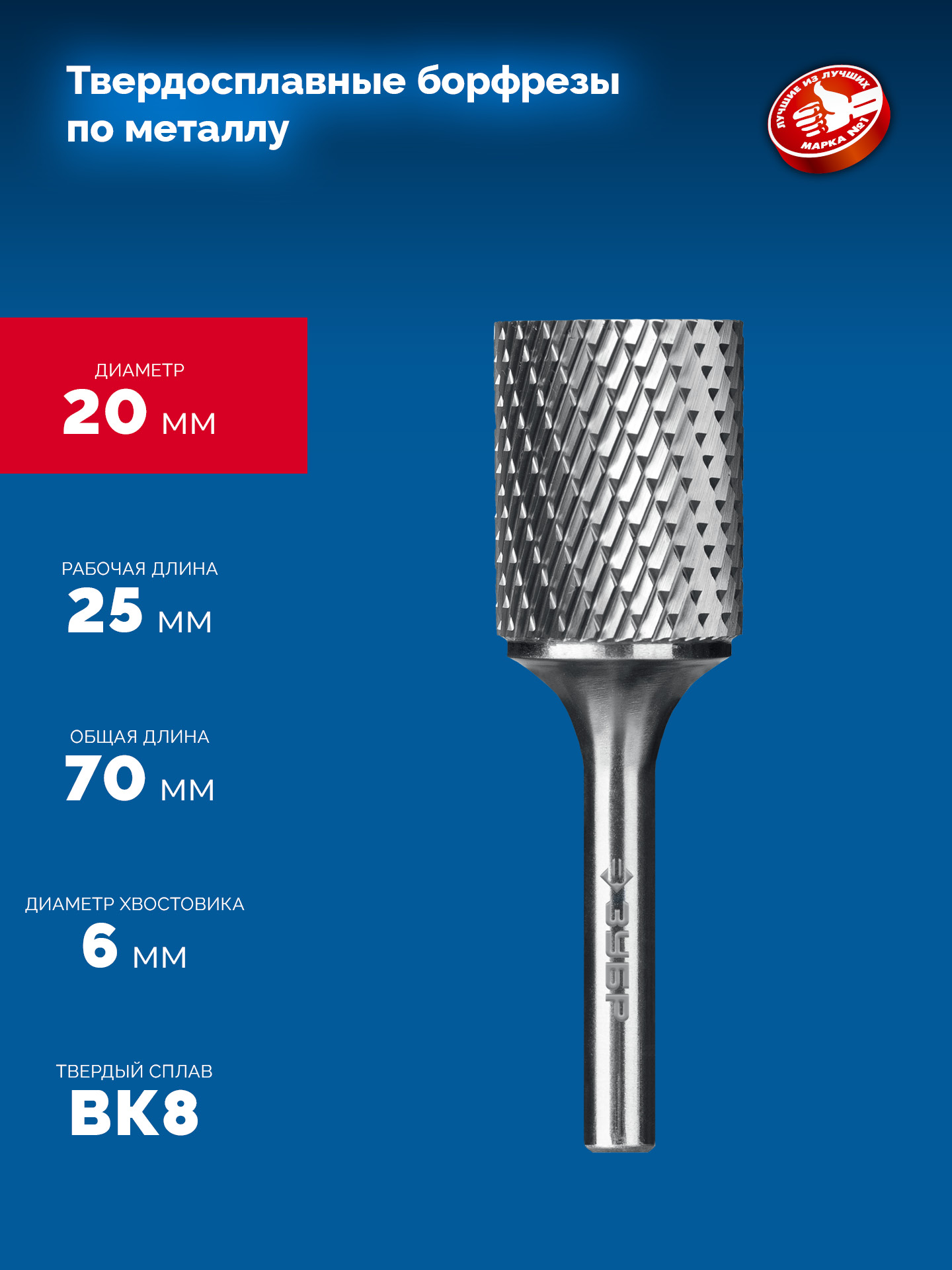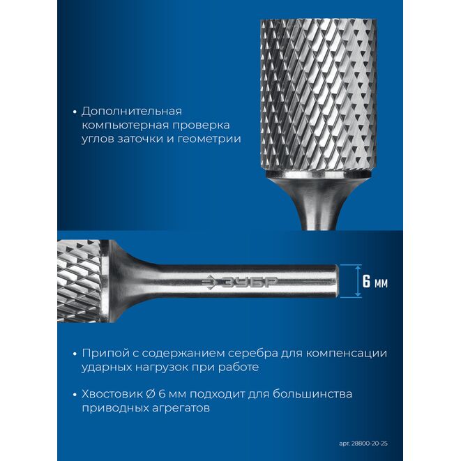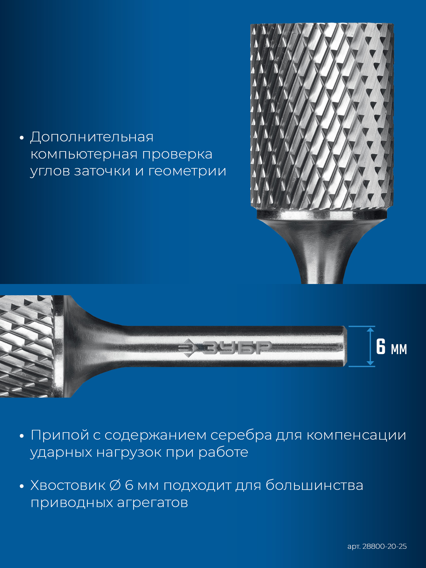 ЗУБР 20х25 мм, тип А (цилиндр с гладким торцом), хв-к 6 мм, твердосплавная борфреза, ПРОФЕССИОНАЛ (28800-20-25)