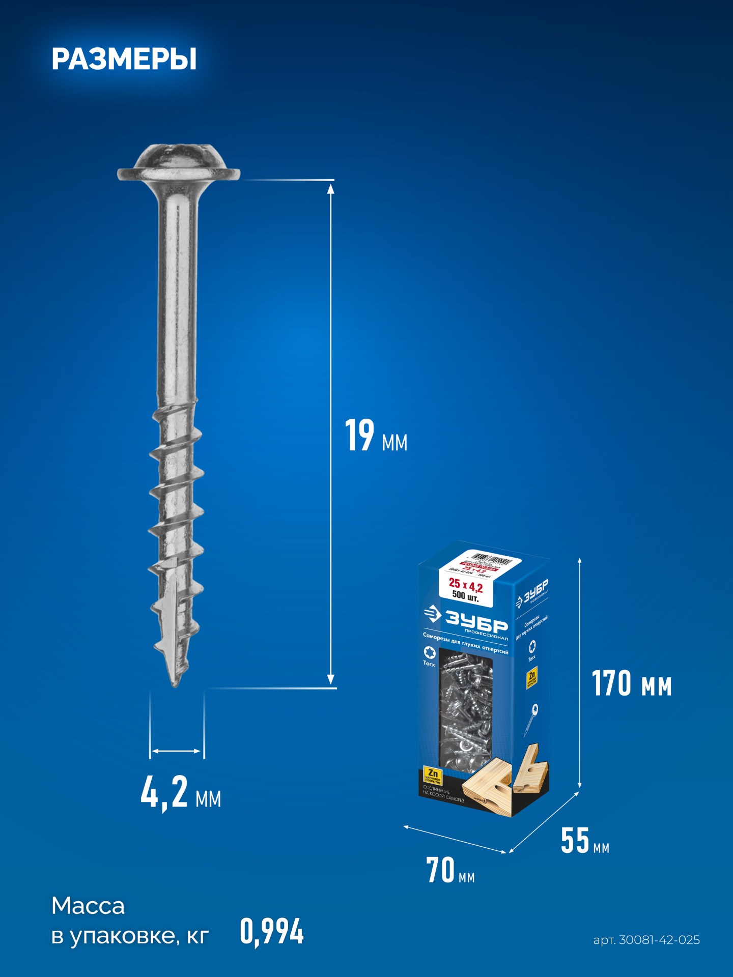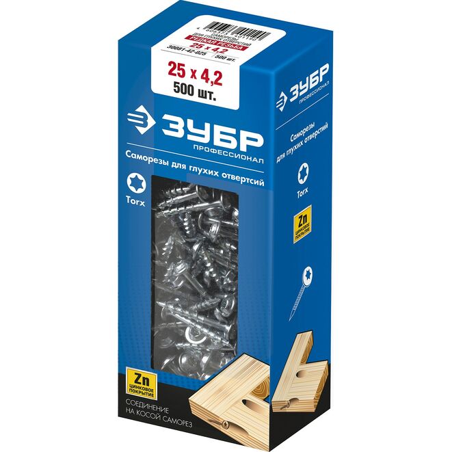 ЗУБР 25 х 4.2 мм, редкая резьба, ТХ20, цинк, 500 шт, саморез для глухих отверстий, Профессионал (30081-42-025)