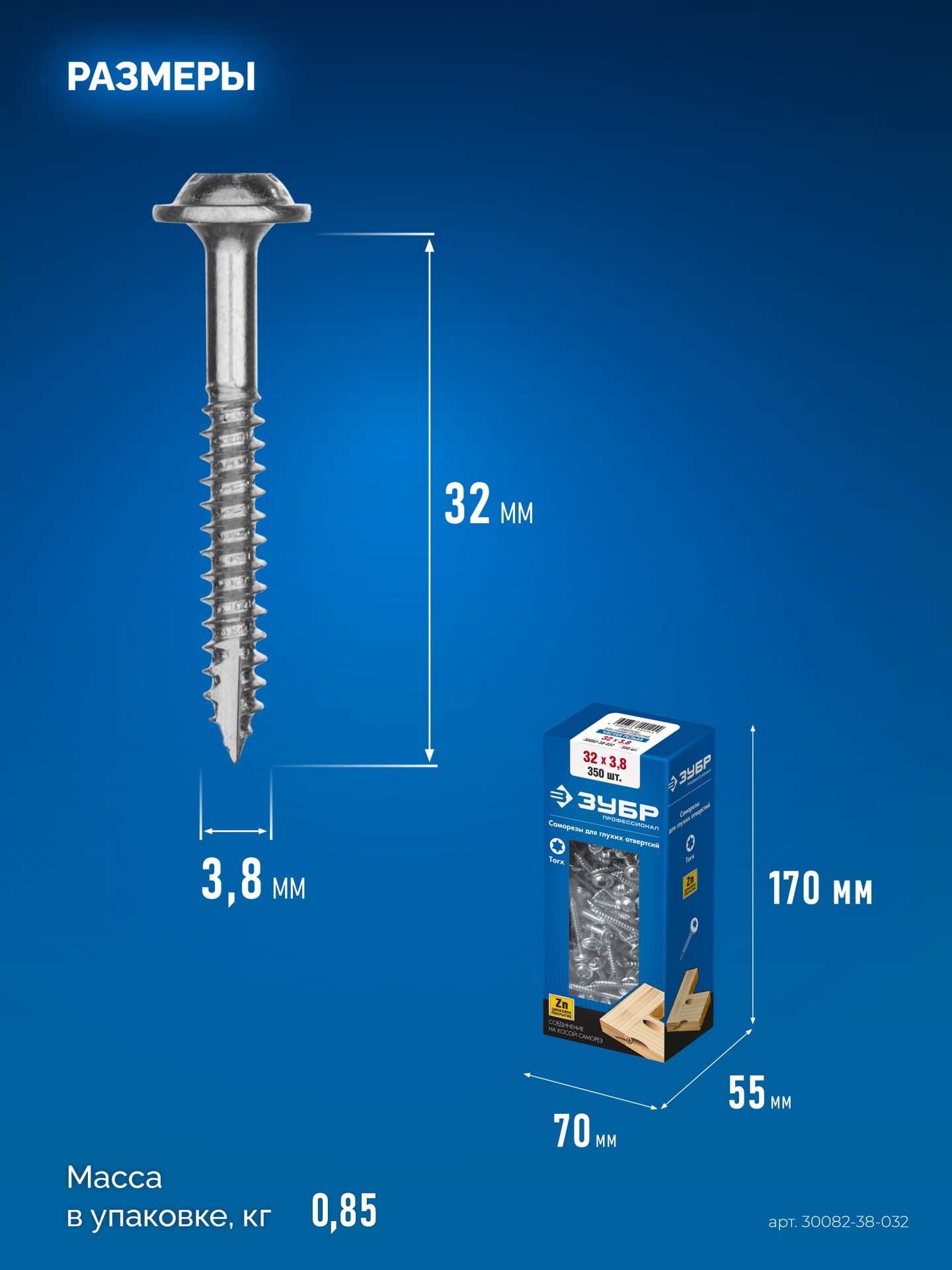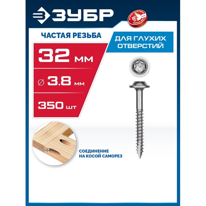 ЗУБР 32 х 3.8 мм, частая резьба, ТХ20, цинк, 350 шт, саморез для глухих отверстий, Профессионал (30082-38-032)