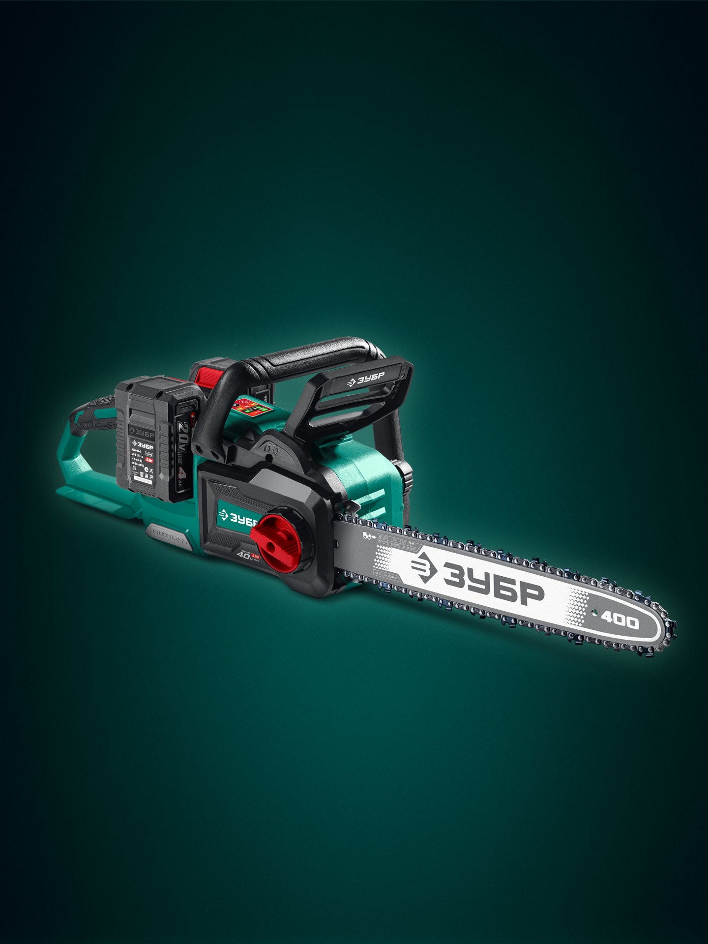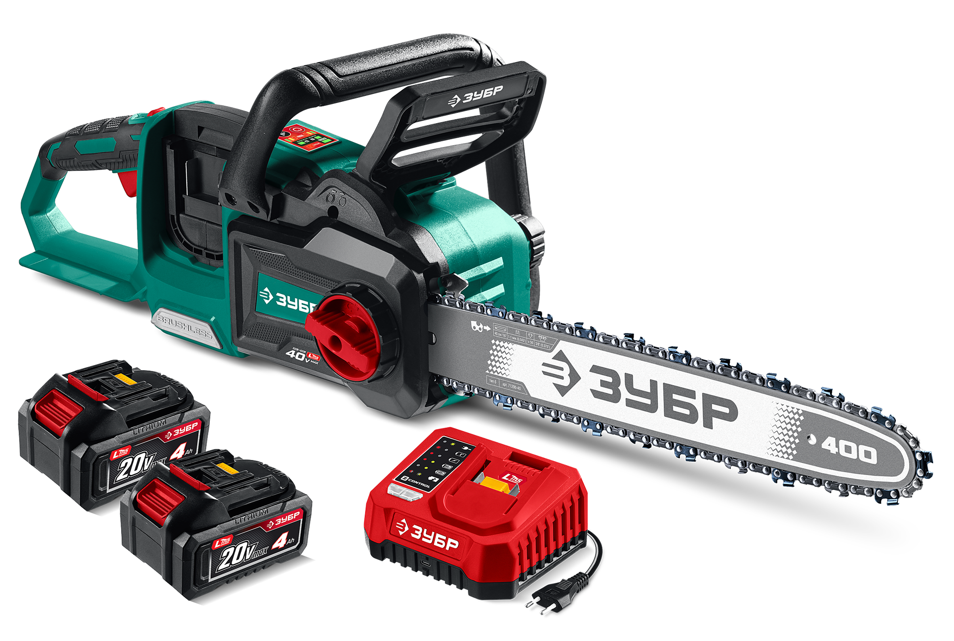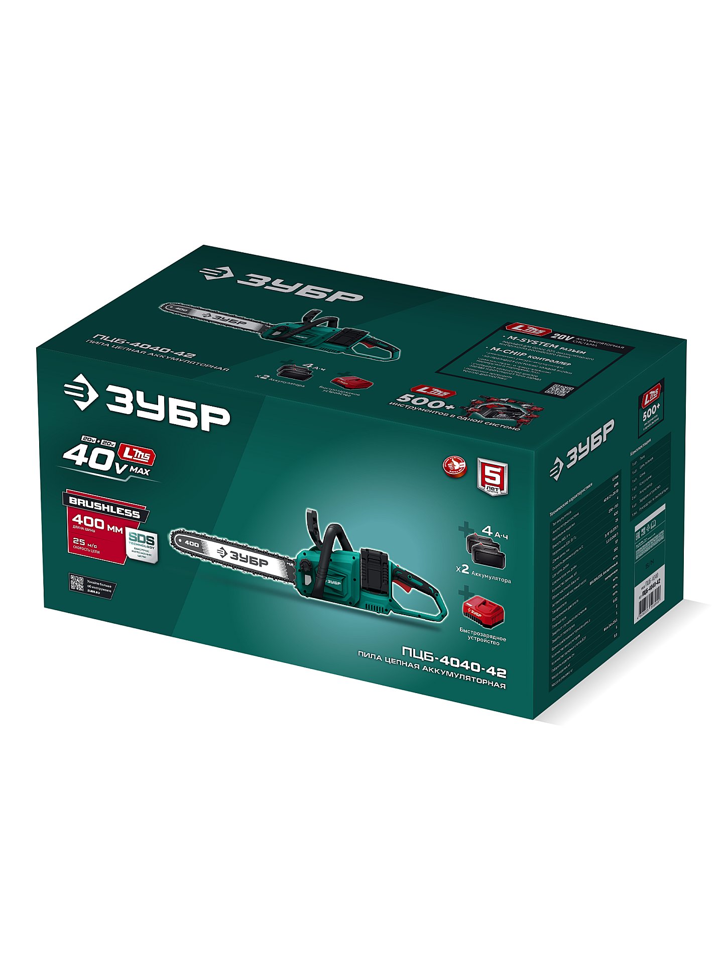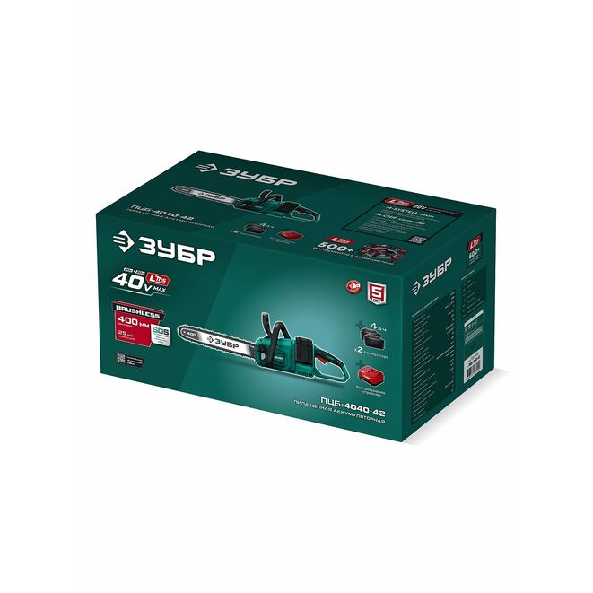 Принадлежности для ЗУБР 40 В, (2x20В), 400 мм шина, 2 АКБ LMS (4 Ач), пила цепная аккумуляторная (ПЦБ-4040-42):