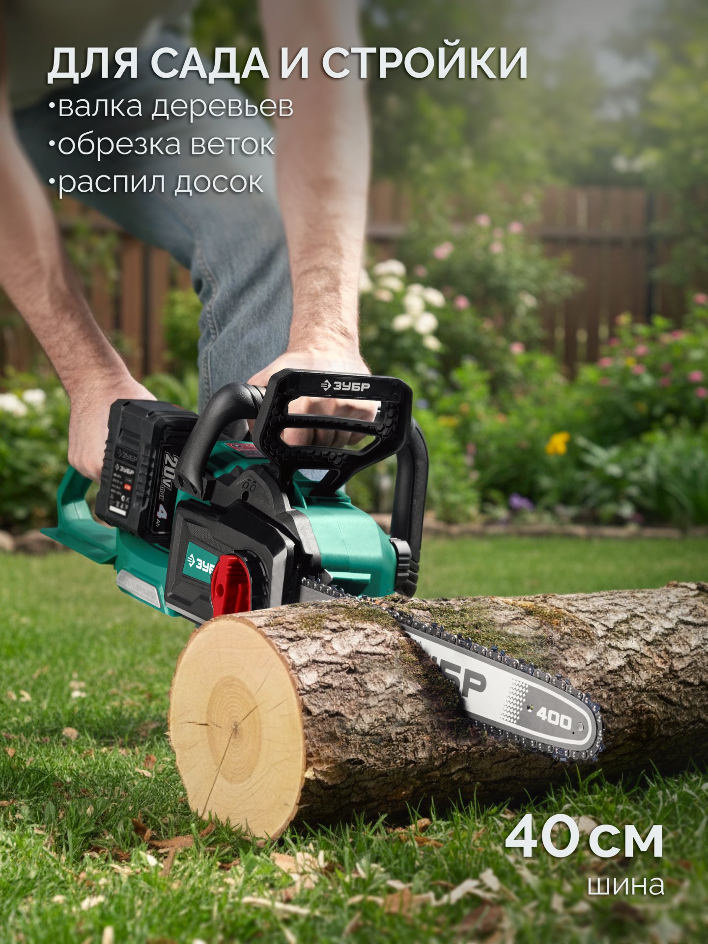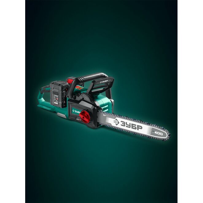 ЗУБР 40 В, (2x20В), 400 мм шина, 2 АКБ LMS (4 Ач), пила цепная аккумуляторная (ПЦБ-4040-42)
